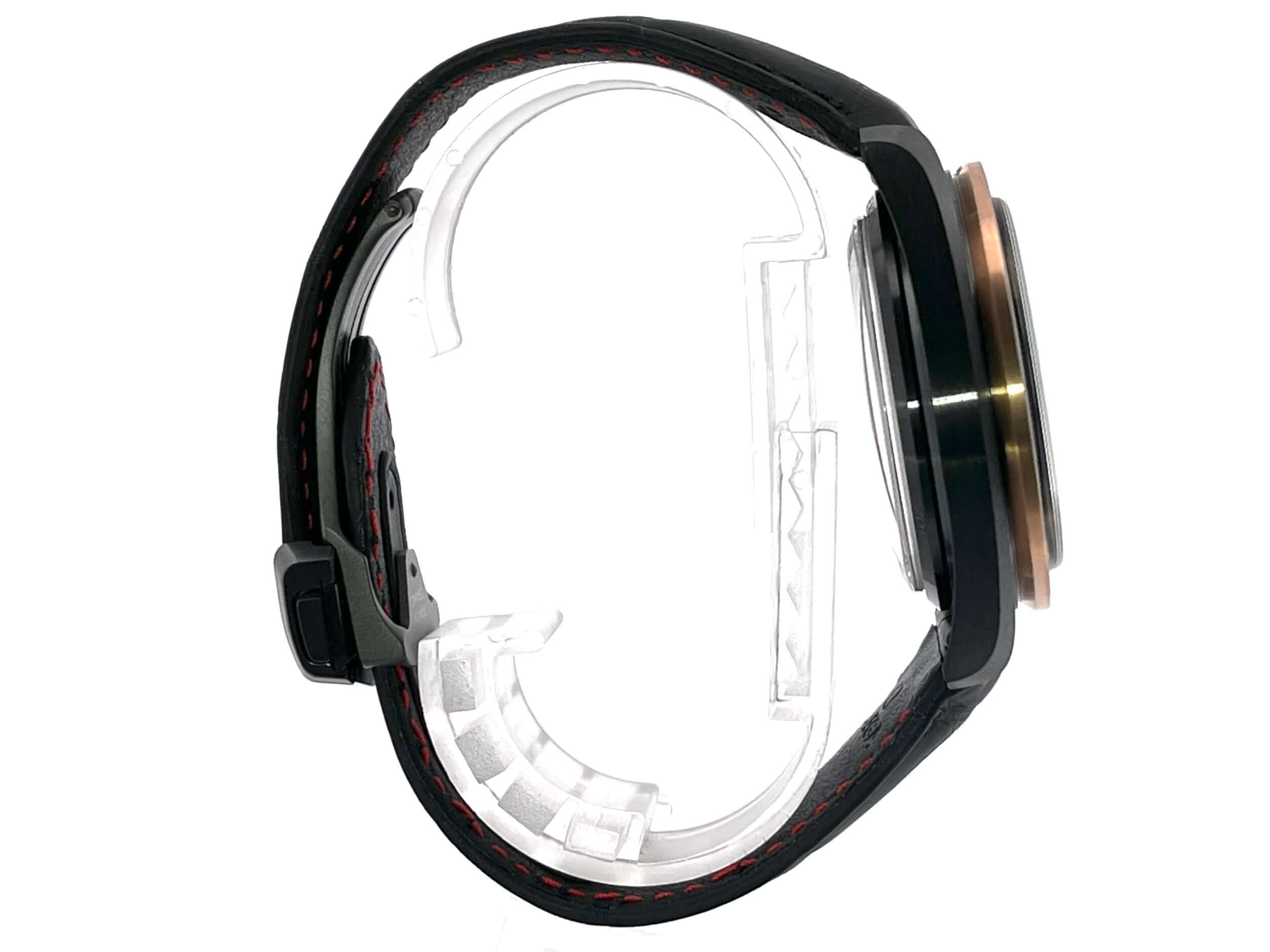 Black ceramic case, case diameter 44.25 mm, 18 kt red gold bezel with tachymeter, matt gray dial with red gold indices, black leather strap with ceramic folding clasp, automatic movement, Omega Co-Axial caliber 9300 with column wheel mechanism, Si14 silicon balance balance spring, Chronograph, chronometer, power reserve approx. 60 hours, scratch-resistant sapphire crystal, small seconds, date, transparent case back made of sapphire glass, water resistant up to 5 bar.