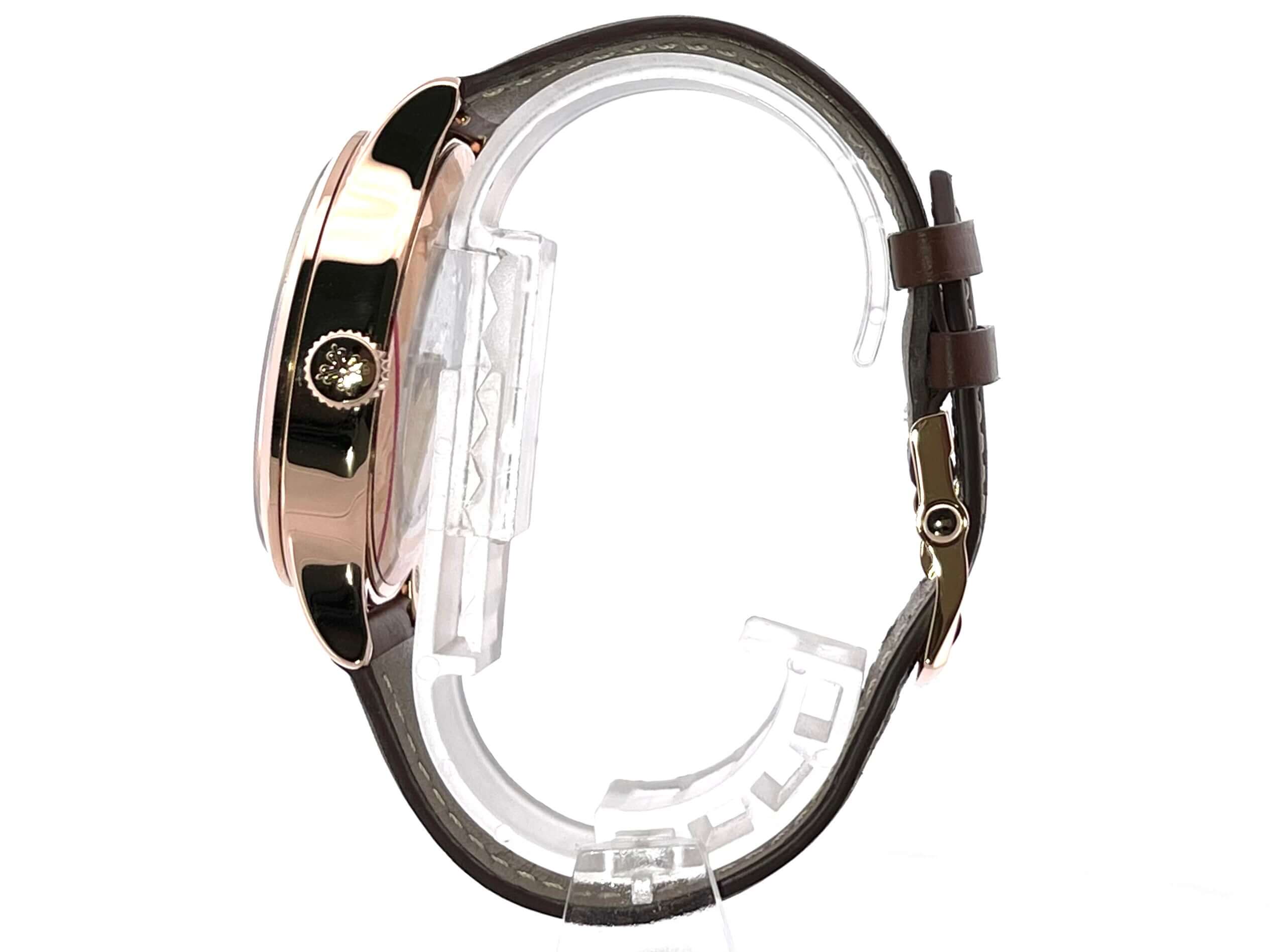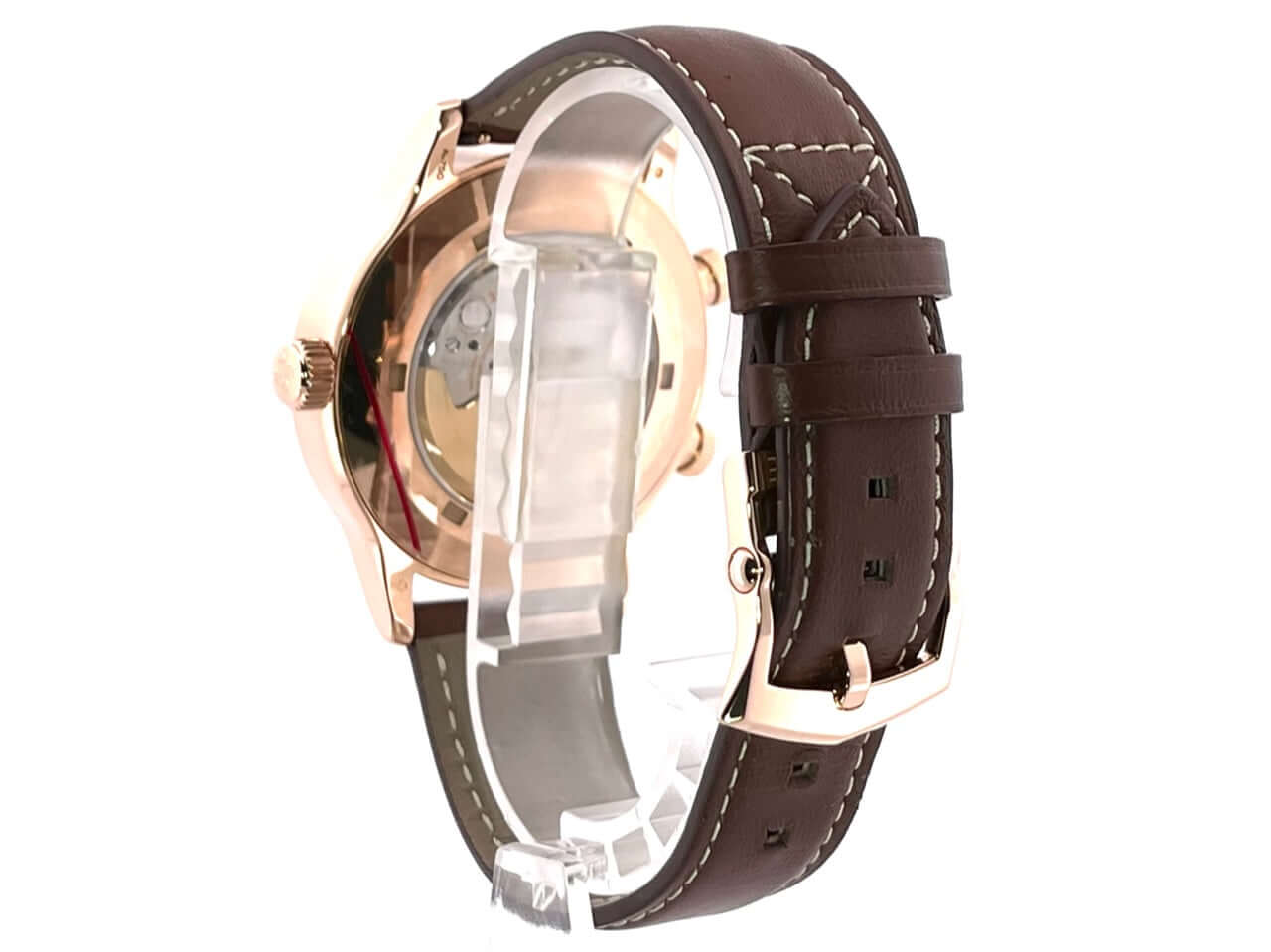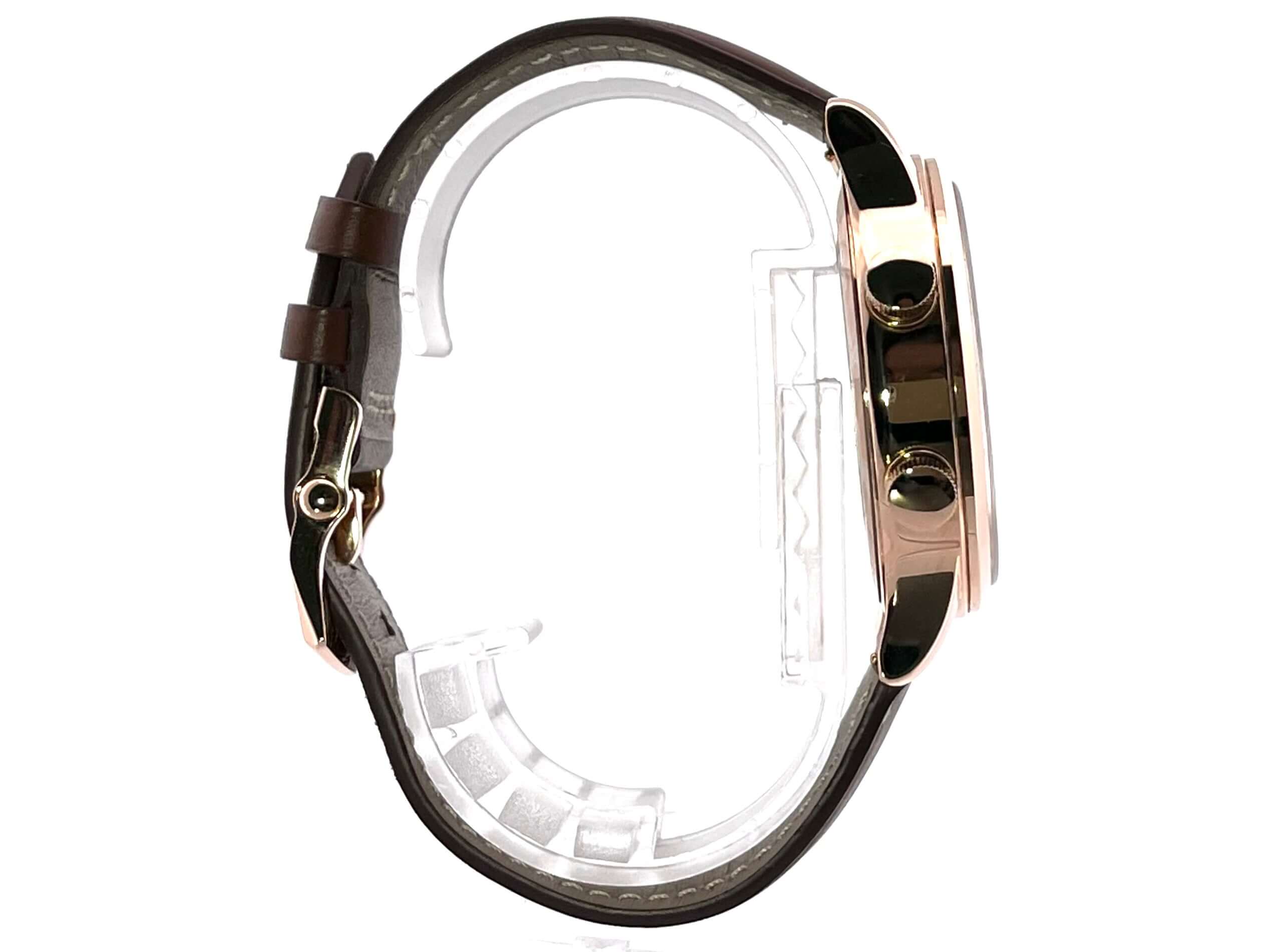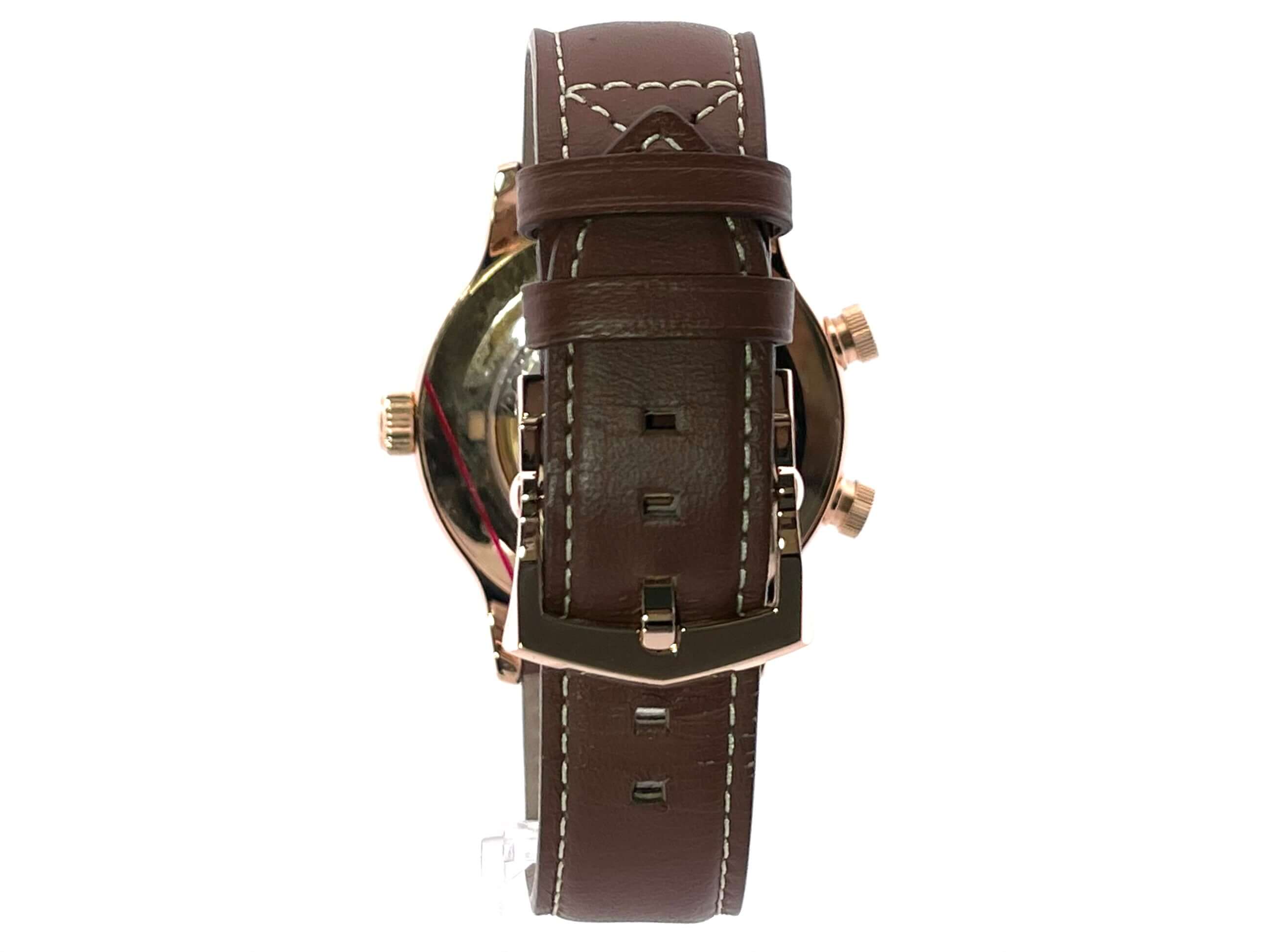 Case made of 18 kt rose gold polished, case diameter 42 mm, case height 10.78 mm, bezel 18 kt rose gold polished, brown leather strap with 18 kt rose gold pin buckle, brown dial with Arabic numerals, luminous hands, mechanical movement with automatic winding, manufacture caliber 324 SC FUS with 29 jewels, vibration 28,800 A/h, power reserve for approx. 45 hours, date display, GMT, case back 18 kt rose gold with sapphire glass window, water resistant up to 6 bar.