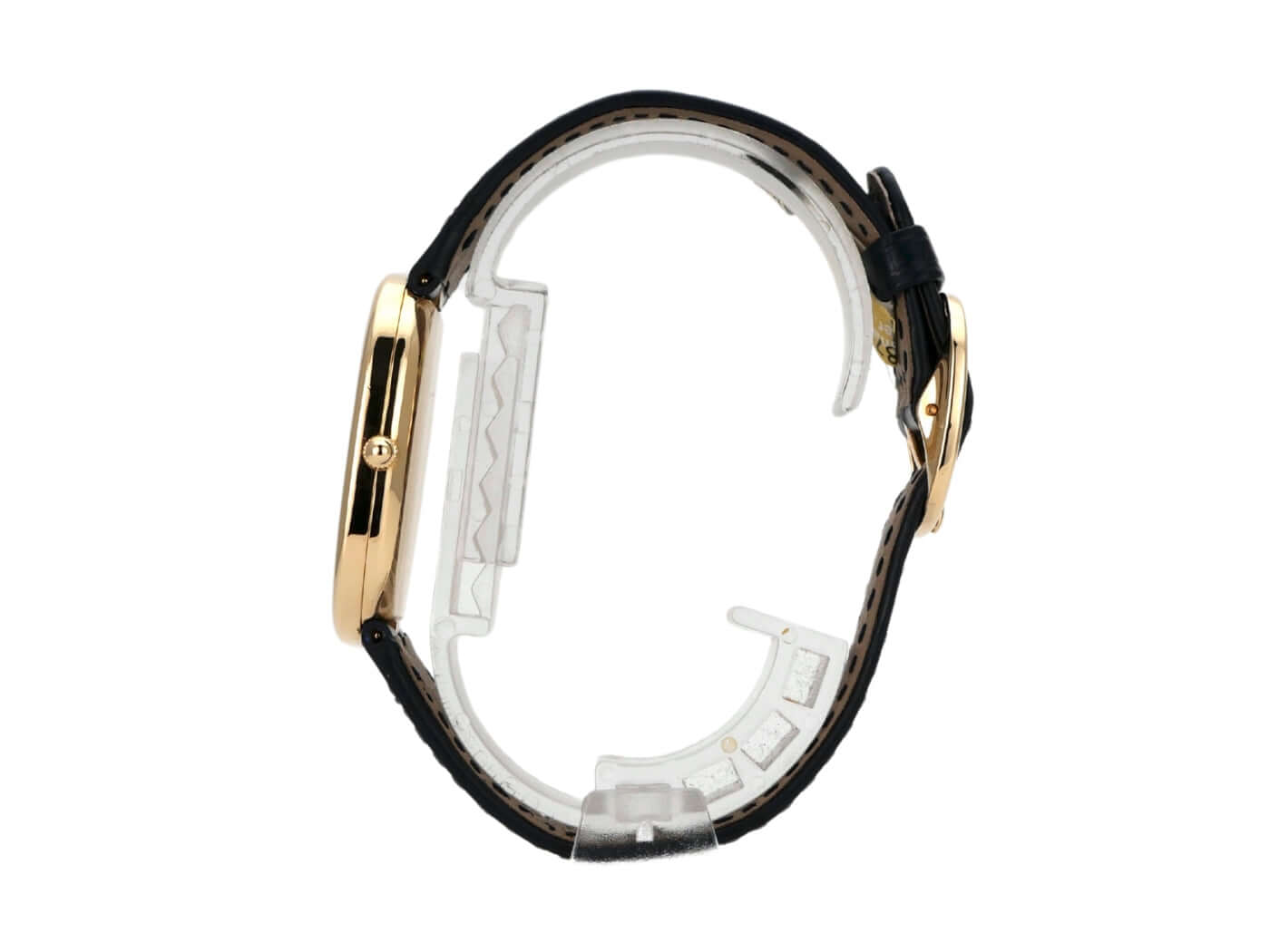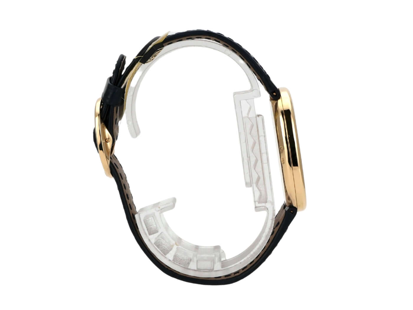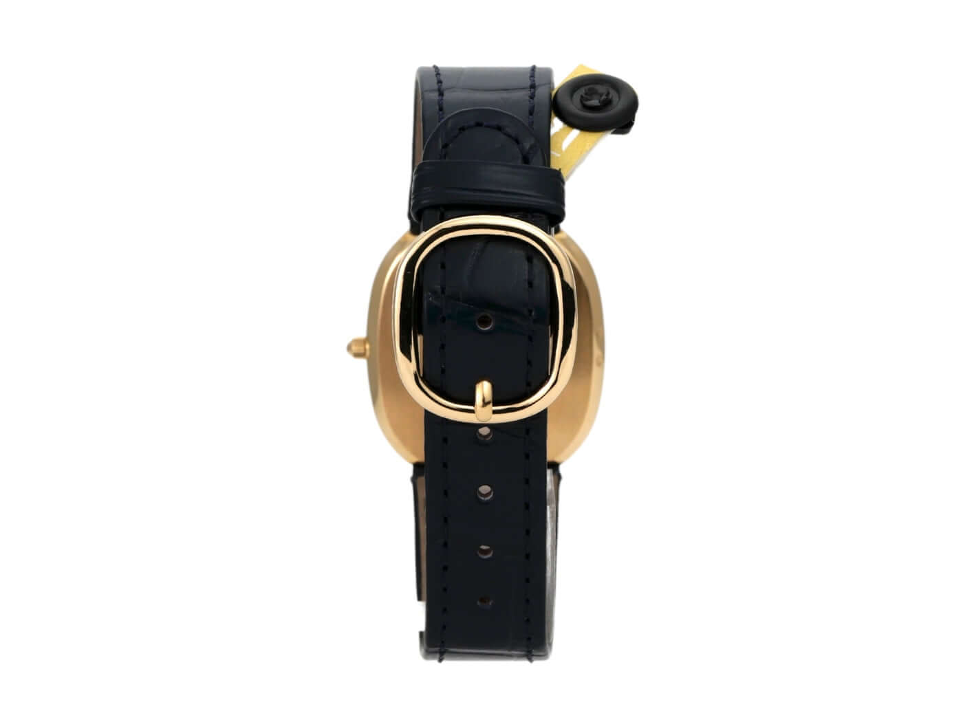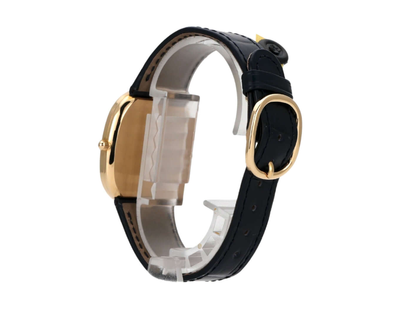 Case made of 18 kt yellow gold, case diameter 34.5 x 30.5 mm, bezel made of polished 18 kt yellow gold, black leather strap with 18 kt yellow gold pin buckle, blue dial, automatic, 18 kt yellow gold back, water-resistant up to 3 bar.
