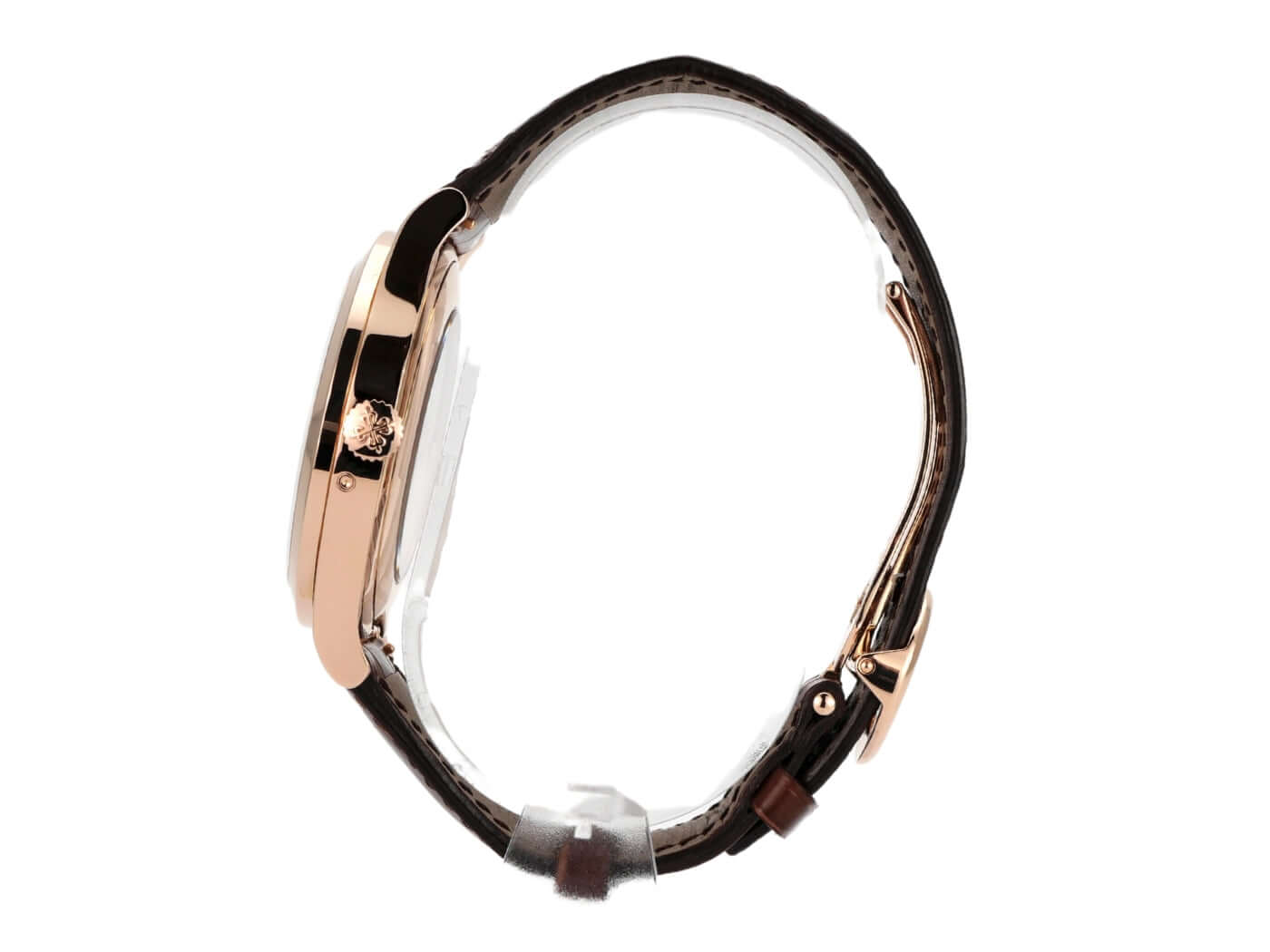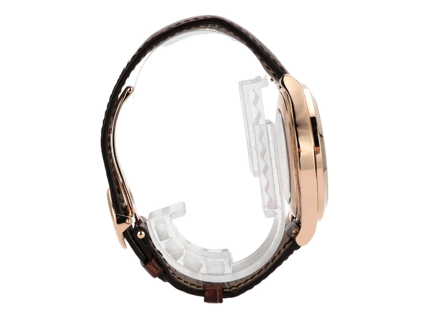 Case made of polished 18 ct rose gold, case diameter 39 mm, polished rose gold bezel, brown leather strap with 18 ct rose gold folding clasp, silver-colored dial, mechanical movement with automatic winding, manufacture caliber 324 S QR with 30 jewels, frequency 28,800 A/h, power reserve of approximately 45 hours, annual calendar, date display, day of the week, month, moon phase, 18 ct rose gold case back with sapphire glass window, waterproof up to 3 bar.