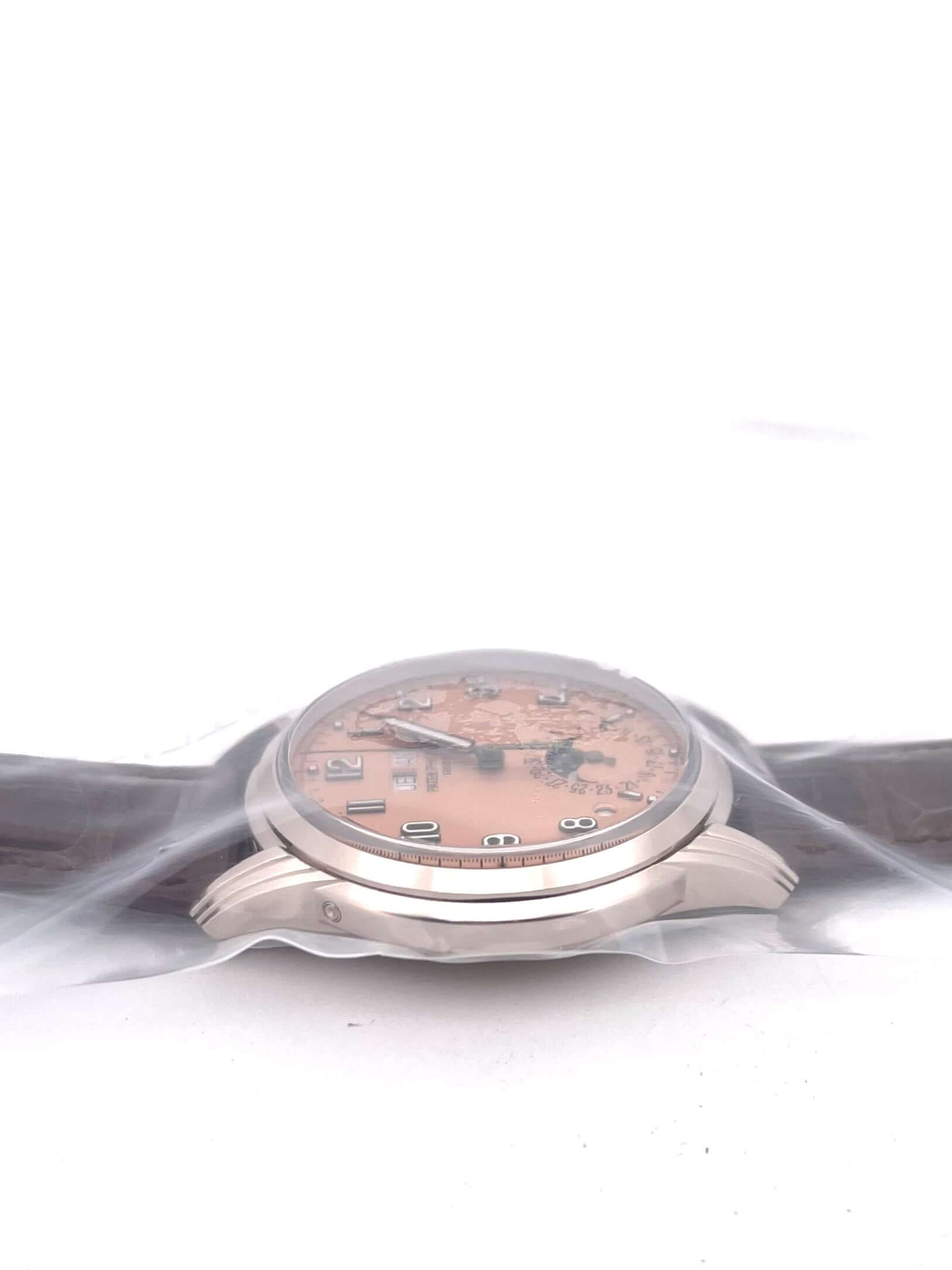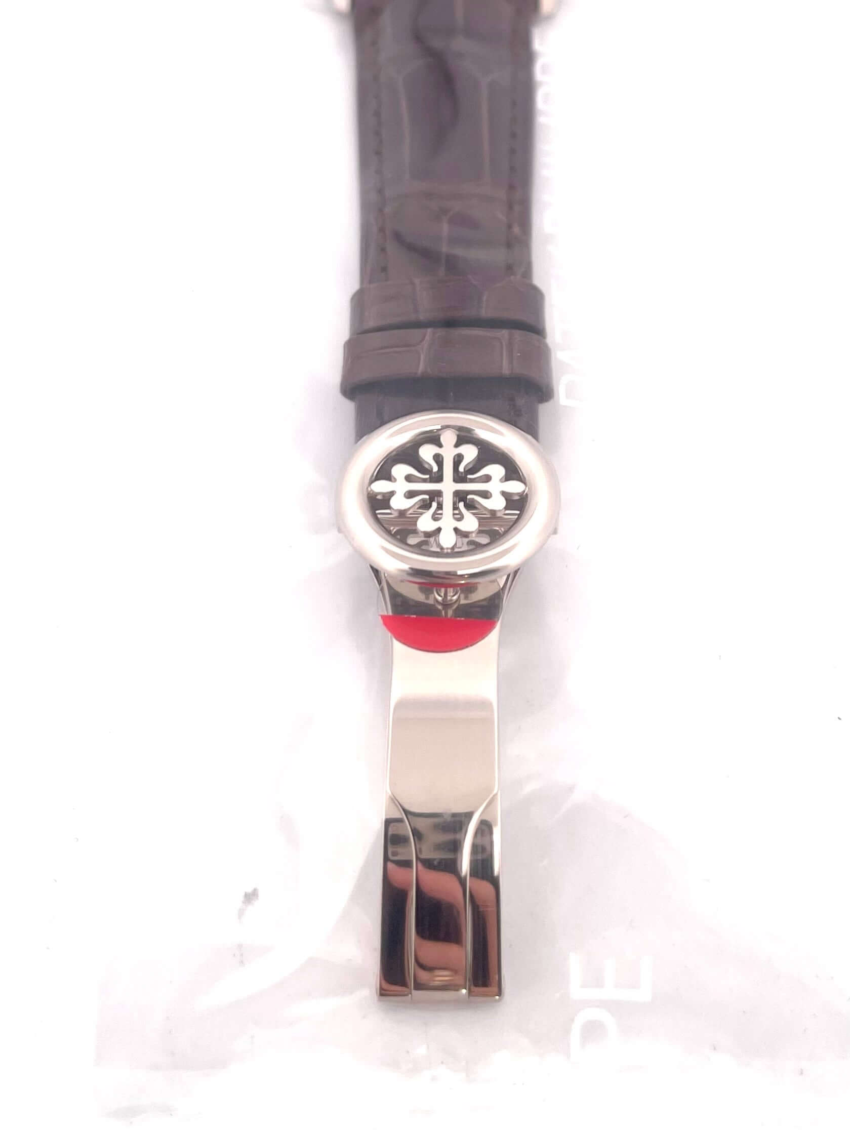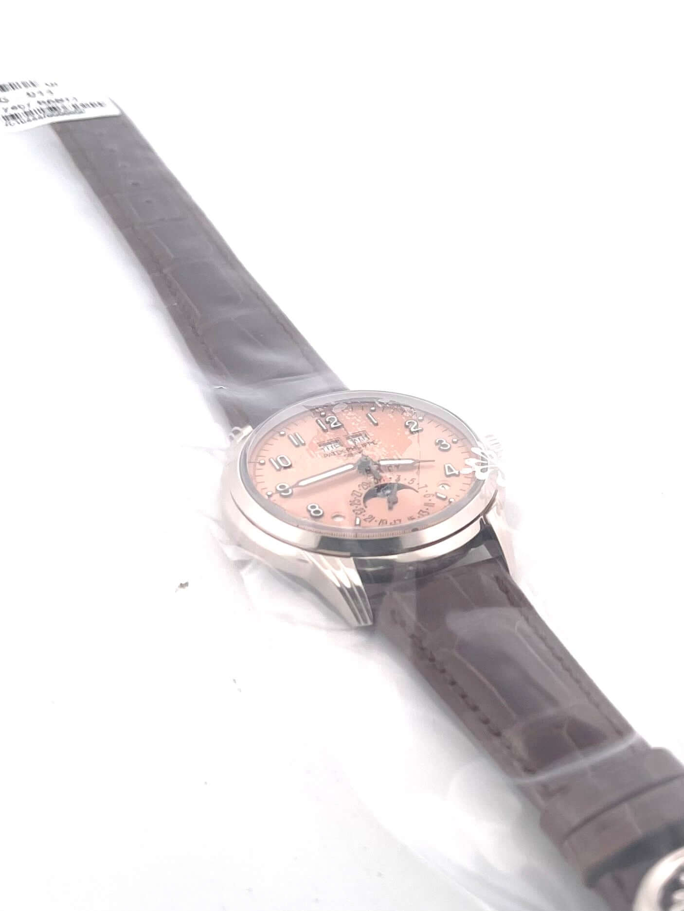 Case 18 kt white gold polished, case diameter 40 mm, case height 11.13 mm, 18 kt white gold polished bezel, brown alligator leather strap with 18 kt white gold folding clasp, opal-colored dial with Arabic numerals, mechanical movement with automatic winding, manufacture caliber 324 SQ with 29 jewels, Vibration 28,800 A/h, power reserve for approx. 45 hours, perpetual calendar, date, day display, month, case back 18 kt white gold with sapphire glass window, water resistant up to 3 bar.