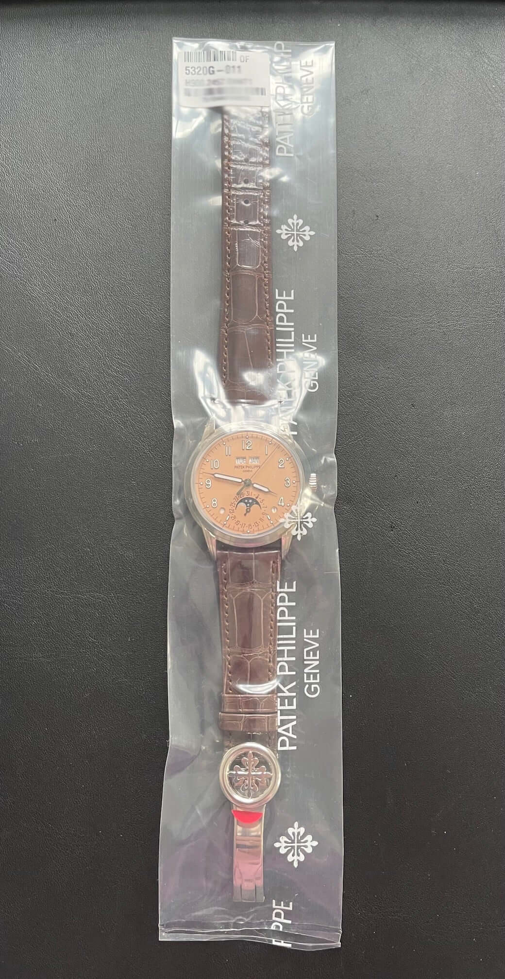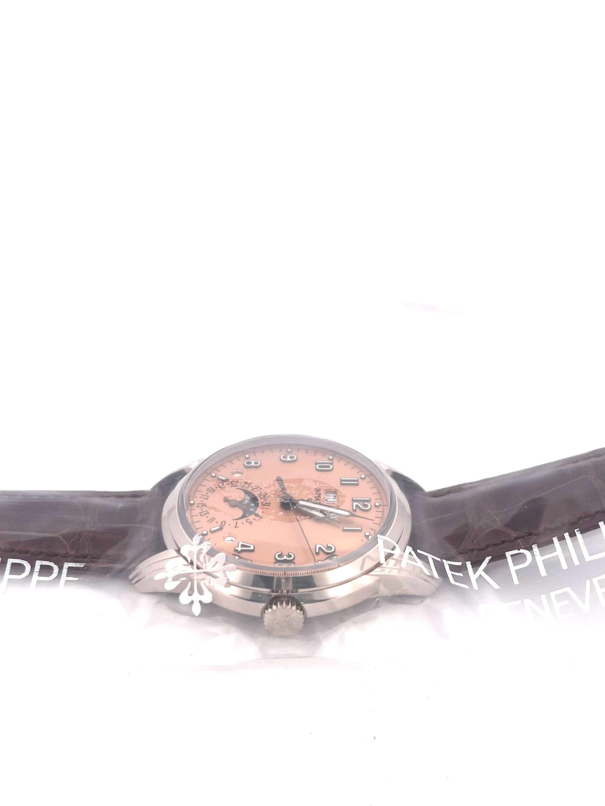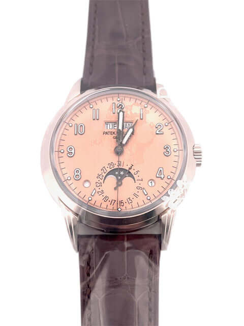 Case 18 kt white gold polished, case diameter 40 mm, case height 11.13 mm, 18 kt white gold polished bezel, brown alligator leather strap with 18 kt white gold folding clasp, opal-colored dial with Arabic numerals, mechanical movement with automatic winding, manufacture caliber 324 SQ with 29 jewels, Vibration 28,800 A/h, power reserve for approx. 45 hours, perpetual calendar, date, day display, month, case back 18 kt white gold with sapphire glass window, water resistant up to 3 bar.
