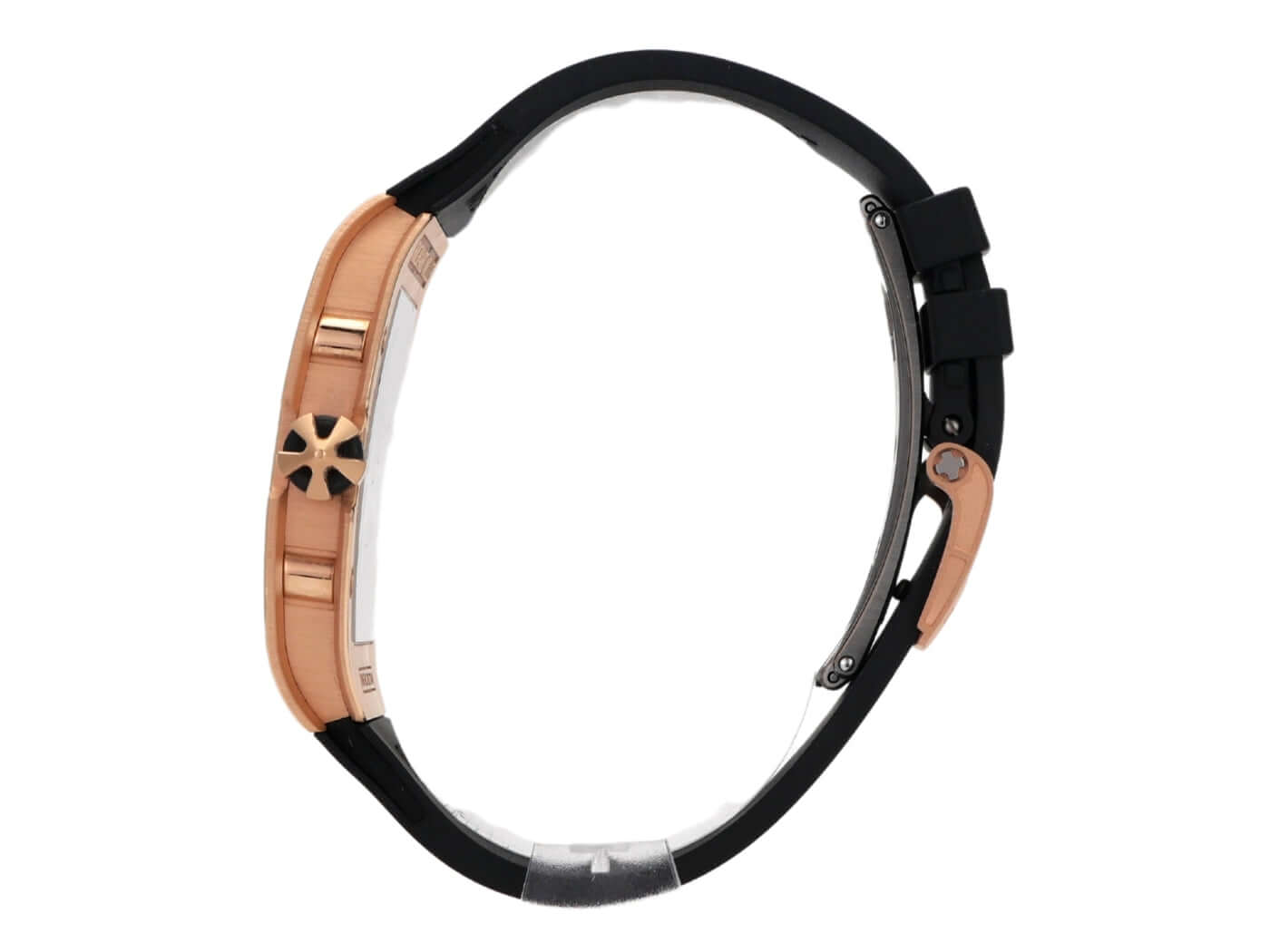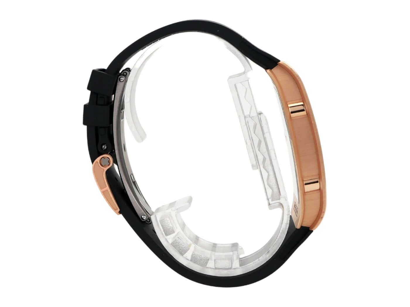 Case made of rose gold, case diameter 47.2 x 38.7 mm, rose gold bezel, black rubber strap with rose gold folding clasp, transparent dial, automatic, date, anti-reflective sapphire crystal, screwed sapphire crystal case back, water-resistant up to 5 bar.
