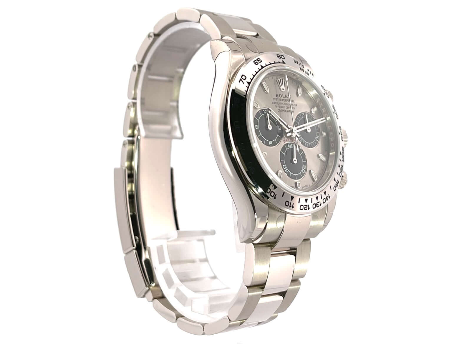 Case made of 18 kt white gold polished and satined, case diameter 40 mm, bezel made of 18 kt white gold polished with tachymeter scale, Oyster 18 kt white gold bracelet polished and satined with folding clasp, gray dial with luminous indices, luminous hands, automatic, Rolex manufacture caliber 4130 with 44 jewels, vibration 28,800 A/h, 72 hour power reserve, chronometer, scratch-resistant sapphire crystal, screwed back made of 18 kt white gold, water resistant up to 10 bar.