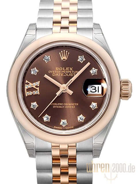 Case made of polished and satined stainless steel, case diameter 28 mm, smooth and polished bezel made of 18 kt Everose gold, Jubile stainless steel / 18 kt Everose gold bracelet polished and satined with folding clasp, chocolate-colored diamond dial with diamonds in the Roman IX, automatic movement, Rolex manufacture caliber 2236 with 31 jewels, 28,800 A/h, power reserve approx. 55 hours, date display, chronometer, scratch-resistant sapphire crystal, screw-down crown made of 18 kt Everose gold, screw-down stainless steel back, water-resistant up to 10 bar.