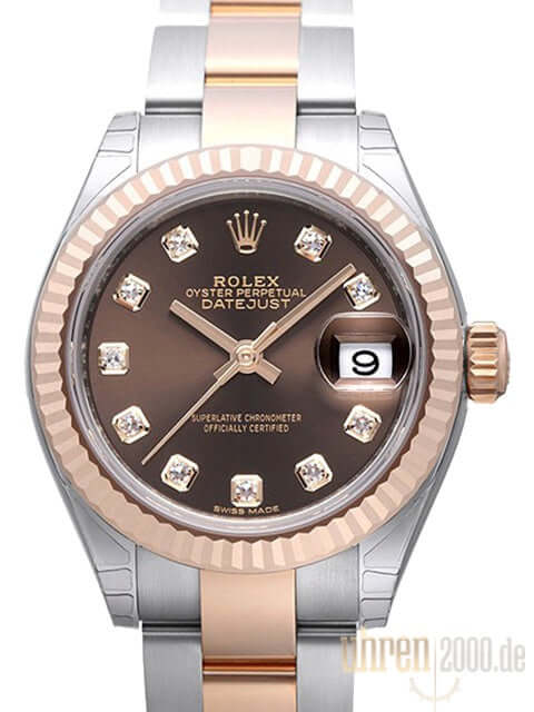 Case made of polished and satined stainless steel, case diameter 28 mm, fluted bezel made of 18 kt Everose gold, Oyster stainless steel / 18 kt Everose gold bracelet polished and satined with folding clasp, chocolate-colored diamond dial, automatic movement, Rolex manufacture caliber 2236 with 31 jewels, 28,800 A/ h, power reserve approx. 55 hours, date display, chronometer, scratch-resistant sapphire crystal, screw-down crown made of 18 kt Everose gold, screw-down stainless steel back, water-resistant up to 10 bar.