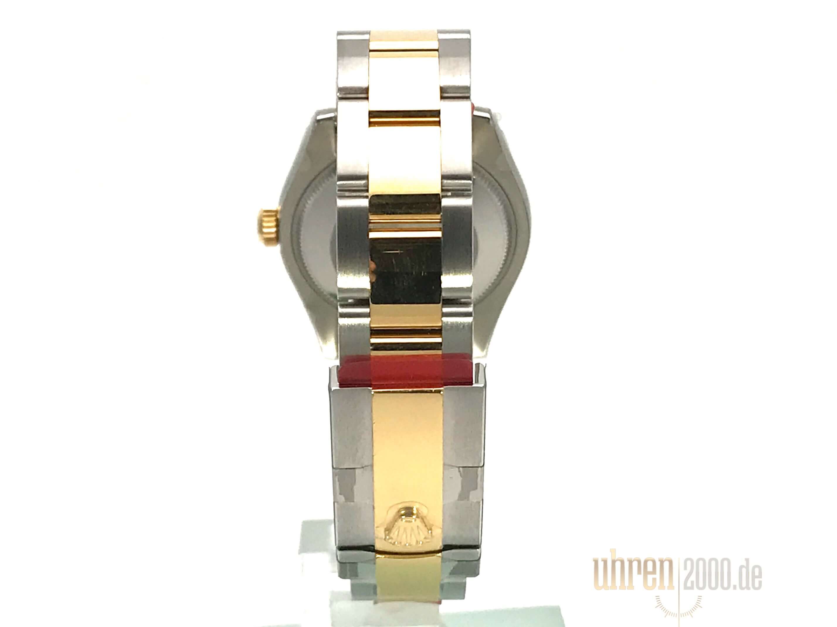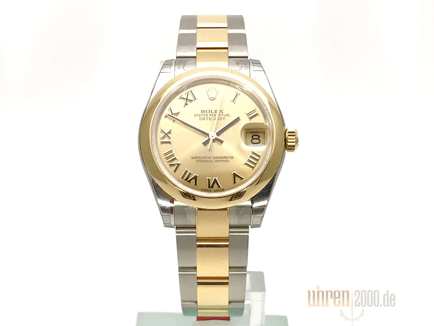 Case made of polished and satined stainless steel, case diameter 31 mm, smooth and polished bezel made of 18 kt yellow gold, Oyster stainless steel / 18 kt yellow gold bracelet polished and satined with folding clasp, champagne dial with applied gold Roman numerals, gold hands, automatic movement, chronometer, Rolex manufacture caliber 2235 with 31 jewels, 28,800 A/h, date display, scratch-resistant sapphire crystal, screw-down crown made of 18 kt yellow gold, screw-down stainless steel base, water-resistant up to 10 bar.