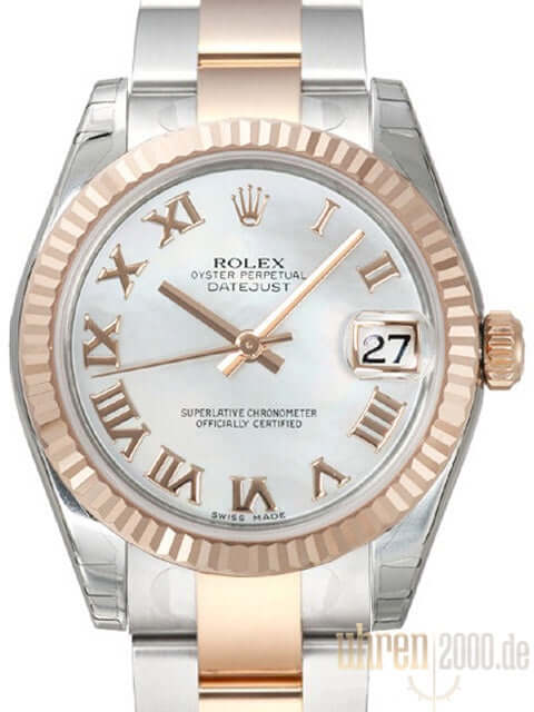 Case made of polished and satin-finished stainless steel, case diameter 31 mm, fluted bezel made of 18 kt rose gold Everose, Oyster stainless steel / 18 kt rose gold Everose bracelet polished and satin-finished with folding clasp, mother-of-pearl dial with applied rose gold Roman numerals, rose gold hands, automatic movement, chronometer, Rolex manufacture caliber 2235 with 31 jewels, 28,800 A/h, date display, scratch-resistant sapphire crystal, screw-down crown made of 18 kt rose gold Everose, screw-down stainless steel base, water-resistant up to 10 bar.