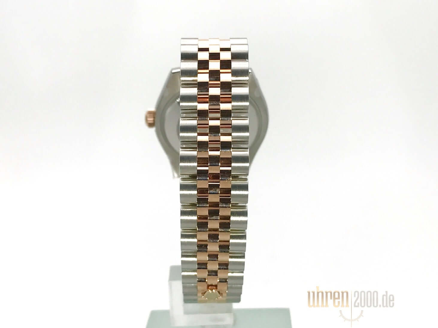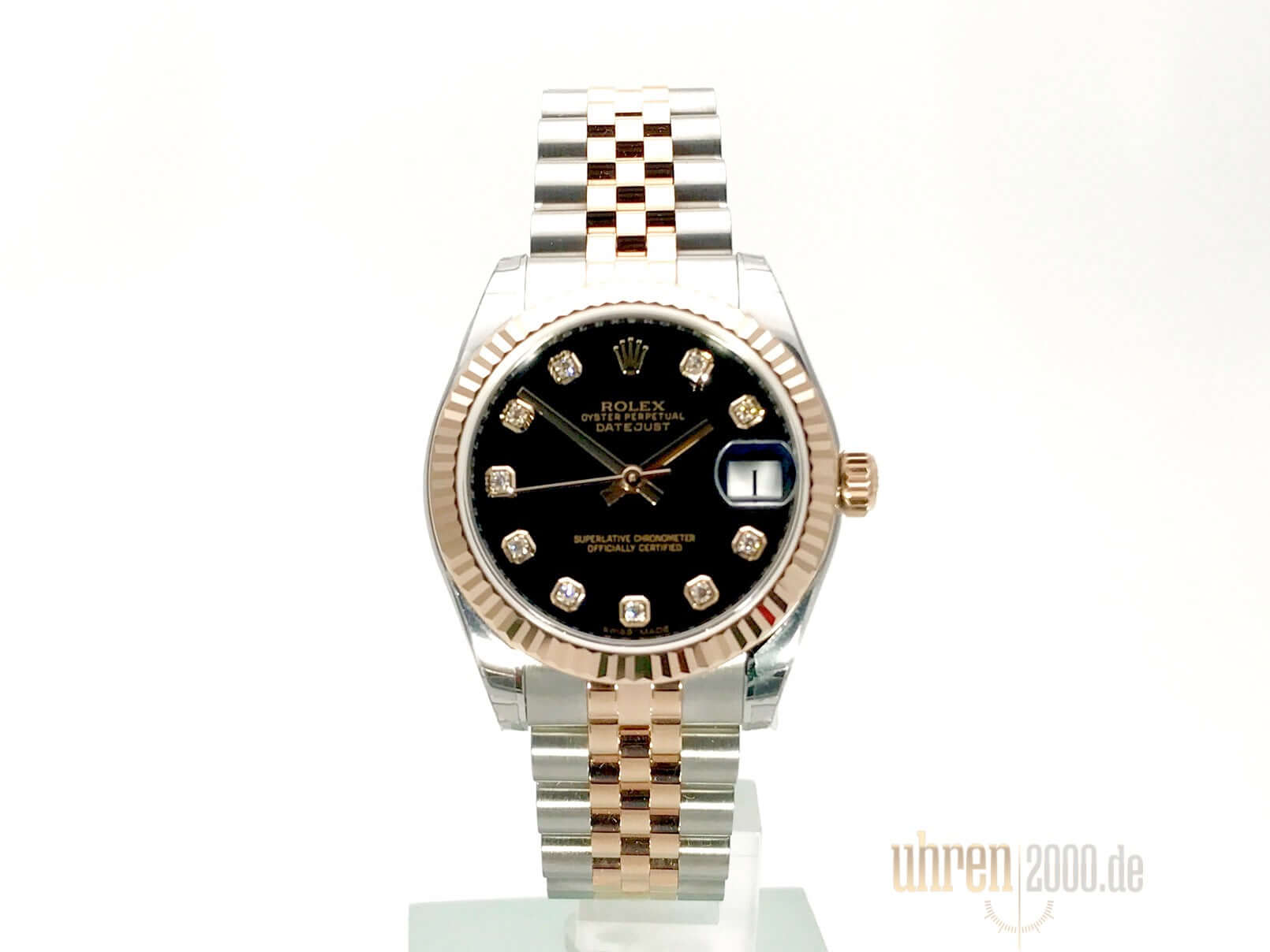 Case made of polished and satin-finished stainless steel, case diameter 31 mm, fluted bezel made of 18 kt rose gold Everose, Jubilé stainless steel / 18 kt rose gold Everose bracelet polished and satin-finished with folding clasp, black dial with 10 applied diamonds, rose gold hands, automatic movement, chronometer, Rolex manufacture caliber 2235 with 31 jewels, 28,800 A/h, date display, scratch-resistant sapphire crystal, screwed crown made of 18 kt rose gold Everose, screwed stainless steel back, water resistant up to 10 bar.