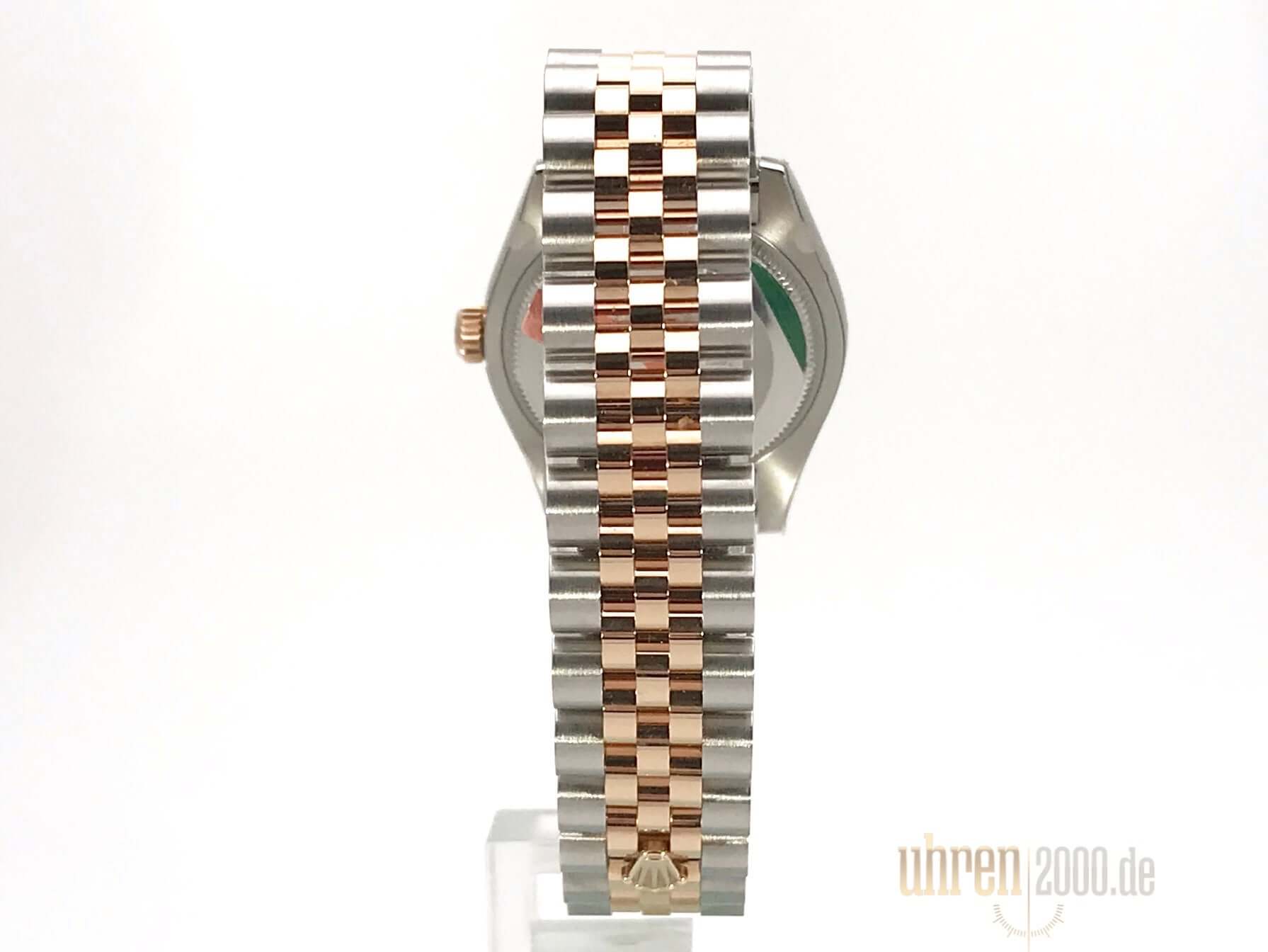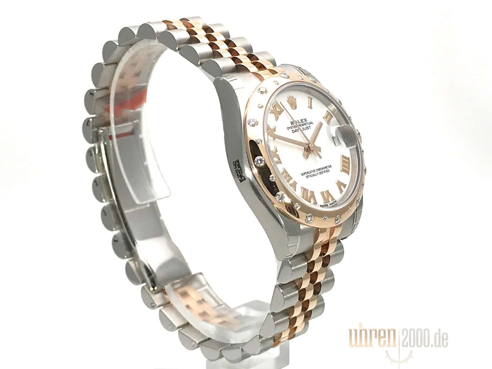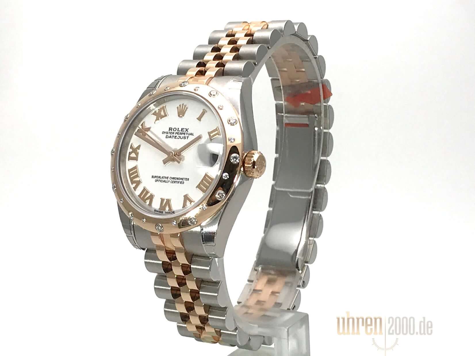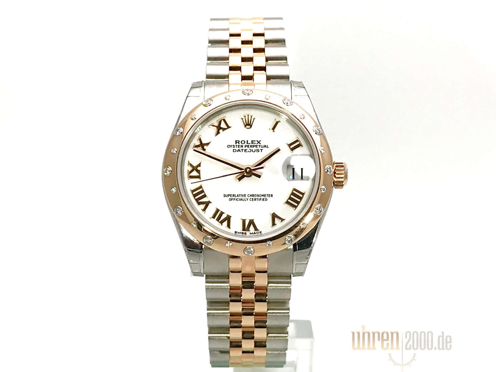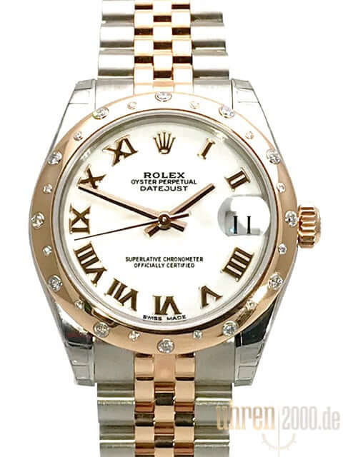 Case made of polished and satin-finished stainless steel, case diameter 31 mm, polished bezel made of 18 kt rose gold Everose set with 24 diamonds, Jubile stainless steel / 18 kt rose gold Everose bracelet polished and satin-finished with folding clasp, white dial with Roman numerals, rose gold hands, automatic movement, Rolex manufacture caliber 2235 with 31 jewels, 28,800 A/h, chronometer, date, scratch-resistant sapphire crystal, screw-down crown made of 18 kt rose gold Everose, screw-down stainless steel back, water-resistant up to 10 bar.