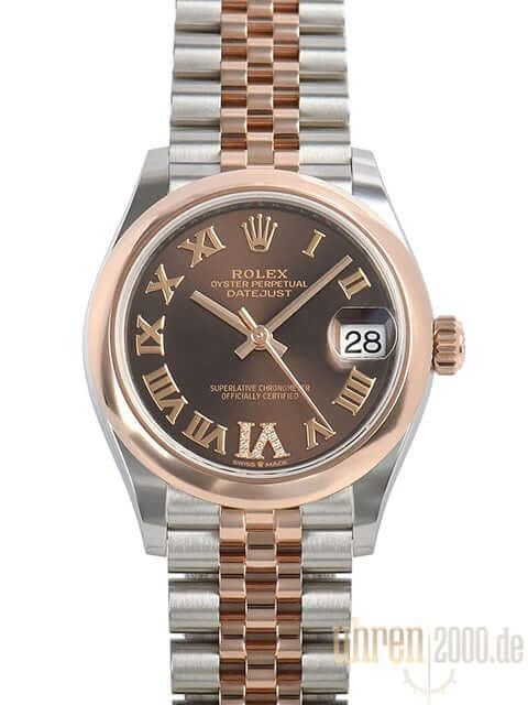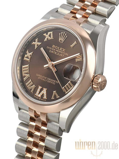 Case made of polished and satin stainless steel, case diameter 31 mm, cambered bezel made of 18 kt Everose gold, Jubile stainless steel / 18 kt Everose gold bracelet polished and satin finished with folding clasp, chocolate-colored dial with Roman numerals and diamonds in the Roman VI, Everose gold Hands, automatic movement, Rolex manufacture caliber 2236 with 31 jewels, 28,800 A/h, 55 hour power reserve, date, chronometer, scratch-resistant sapphire crystal, screw-down crown made of 18 kt Everose gold, screw-down stainless steel back, water-resistant up to 10 bar.