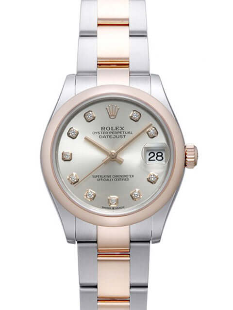 Case made of polished and satin-finished stainless steel, case diameter 31 mm, cambered bezel made of 18 kt Everose gold, Oyster stainless steel / 18 kt Everose gold bracelet polished and satin-finished with folding clasp, silver-colored dial set with diamonds, Everose gold hands, automatic movement, Rolex manufacture caliber 2236 with 31 jewels, 28,800 A/h, 55 hour power reserve, date, chronometer, scratch-resistant sapphire crystal, screw-down crown made of 18 kt Everose gold, screw-down stainless steel back, waterproof up to 10 bar.
