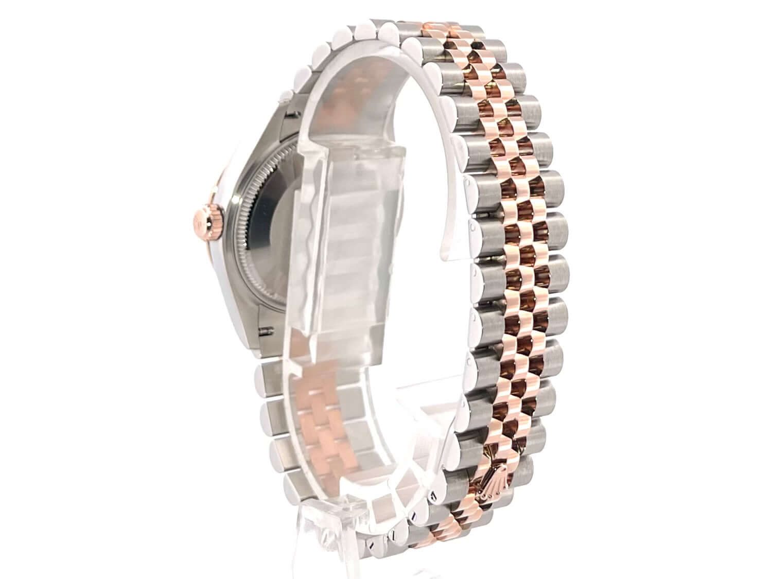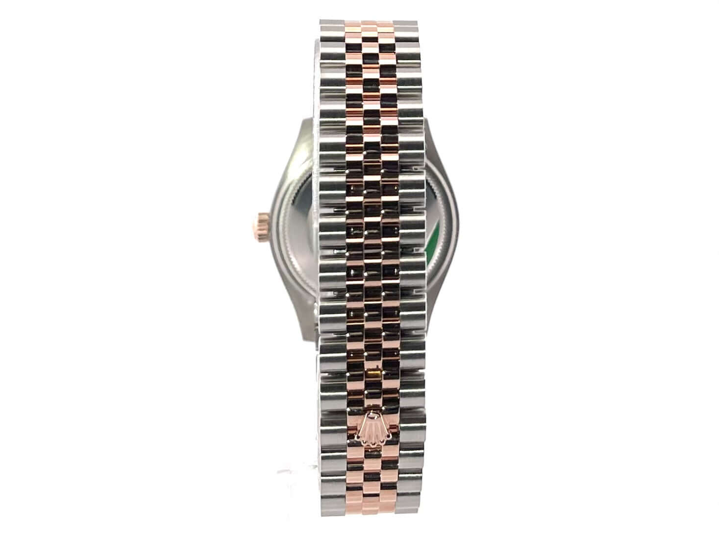 Case made of polished and satin-finished stainless steel, case diameter 31 mm, fluted bezel made of 18 kt Everose gold, Jubile stainless steel / 18 kt Everose gold bracelet polished and satin-finished with folding clasp, aubergine-colored dial with Roman numerals and diamonds in the Roman VI, Everose gold Hands, automatic movement, Rolex manufacture caliber 2236 with 31 jewels, 28,800 A/h, 55 hour power reserve, date, chronometer, scratch-resistant sapphire crystal, screw-down crown made of 18 kt Everose gold, screw-down stainless steel back, water-resistant up to 10 bar.
