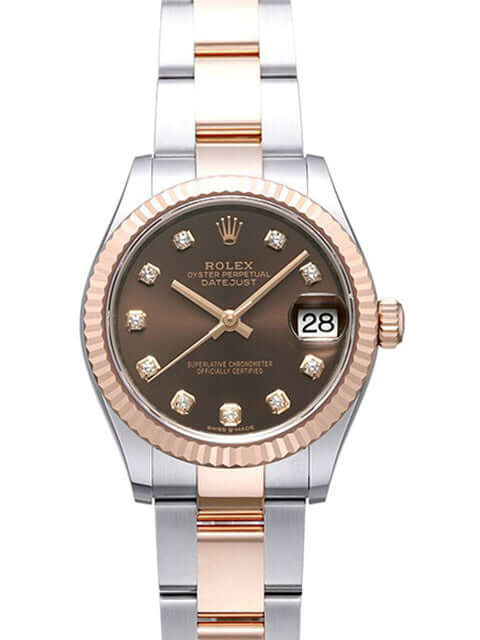 Case made of polished and satin-finished stainless steel, case diameter 31 mm, fluted bezel made of 18 kt Everose gold, Oyster stainless steel / 18 kt Everose gold bracelet polished and satin-finished with folding clasp, chocolate-colored dial set with 10 diamonds, Everose gold hands, automatic movement, Rolex Manufacture caliber 2236 with 31 jewels, 28,800 A/h, 55 hour power reserve, date, chronometer, scratch-resistant sapphire crystal, screw-down crown made of 18 kt Everose gold, screw-down stainless steel back, water-resistant up to 10 bar.