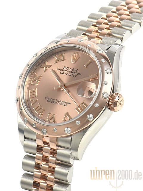 Case made of polished and satin-finished stainless steel, case diameter 31 mm, polished bezel made of 18 kt Everose gold set with diamonds, Jubile stainless steel / 18 kt Everose gold bracelet polished and satin-finished with folding clasp, pink dial with Roman numerals, Everose gold hands, automatic movement , Rolex manufacture caliber 2236 with 31 jewels, 28,800 A/h, 55 hour power reserve, date, chronometer, scratch-resistant sapphire crystal, screw-down crown made of 18 kt Everose gold, screw-down stainless steel back, water-resistant up to 10 bar.