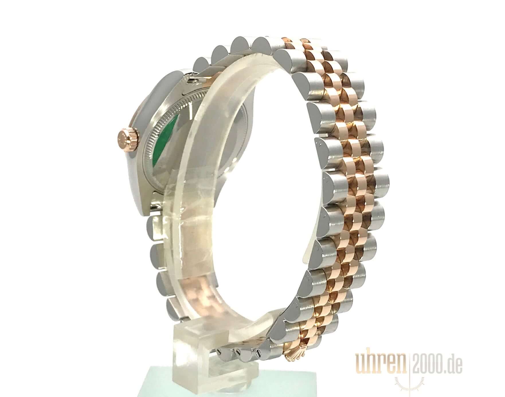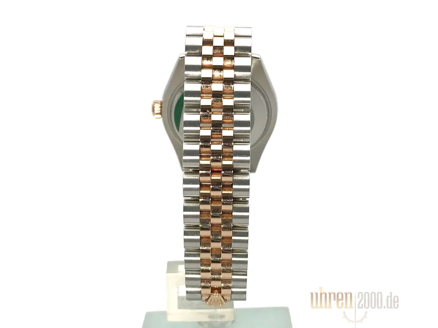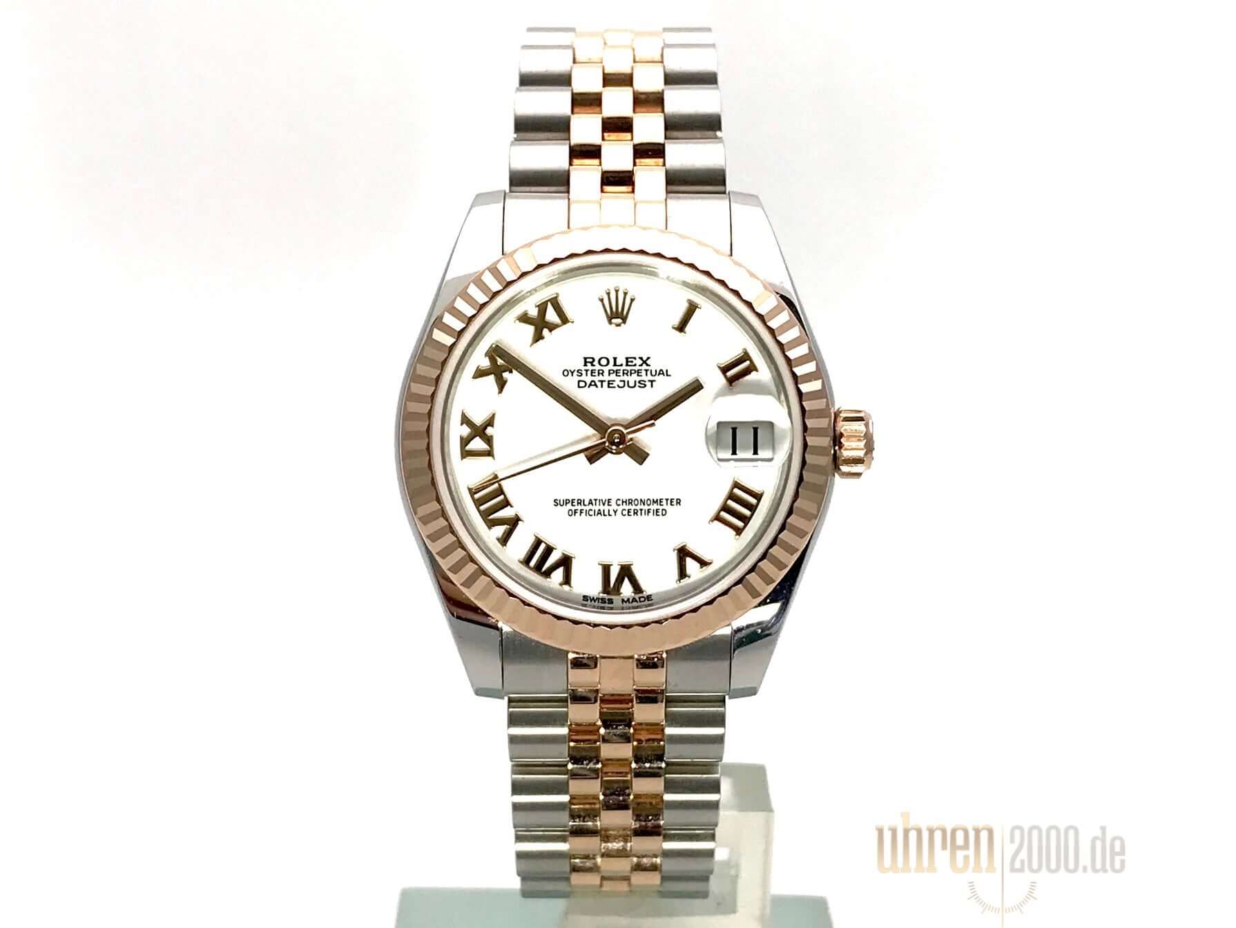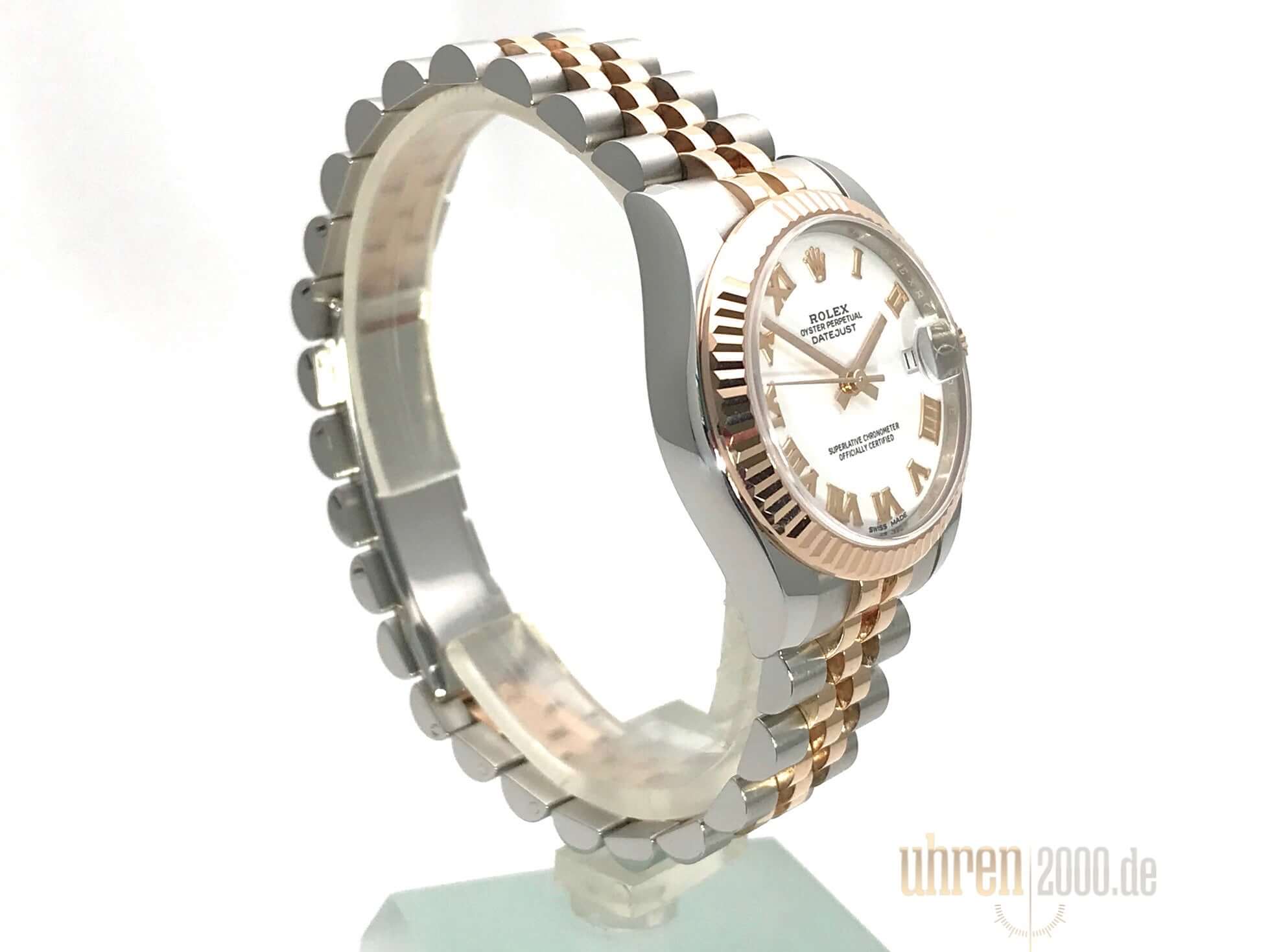 Case made of polished and satin-finished stainless steel, case diameter 31 mm, fluted bezel made of 18 kt rose gold Everose, Jubilé stainless steel / 18 kt rose gold Everose bracelet polished and satin-finished with folding clasp, white dial with applied rose gold Roman numerals, rose gold hands, automatic movement, chronometer, Rolex manufacture caliber 2235 with 31 jewels, 28,800 A/h, date display, scratch-resistant sapphire crystal, screw-down crown made of 18 kt rose gold Everose, screw-down stainless steel base, water-resistant up to 10 bar.