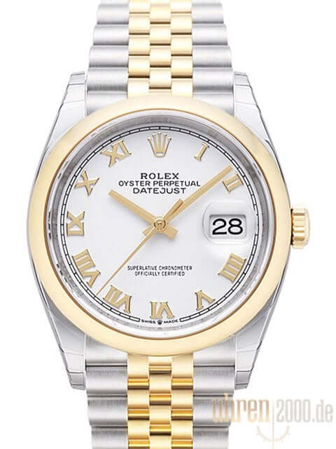 Case made of stainless steel / yellow gold polished and satin-finished, case diameter 36 mm, polished 18 kt yellow gold bezel, Jubilé bracelet made of stainless steel / 18 kt yellow gold polished and satin-finished with folding clasp, white dial with applied gold Roman numerals, gold hands, automatic movement, Rolex manufacture caliber 3235 with 31 jewels, 28,800 A/h, 70 hour power reserve, date display, chronometer, scratch-resistant sapphire crystal, screw-down 18 kt yellow gold crown, screw-down stainless steel back, water resistant up to 10 bar.