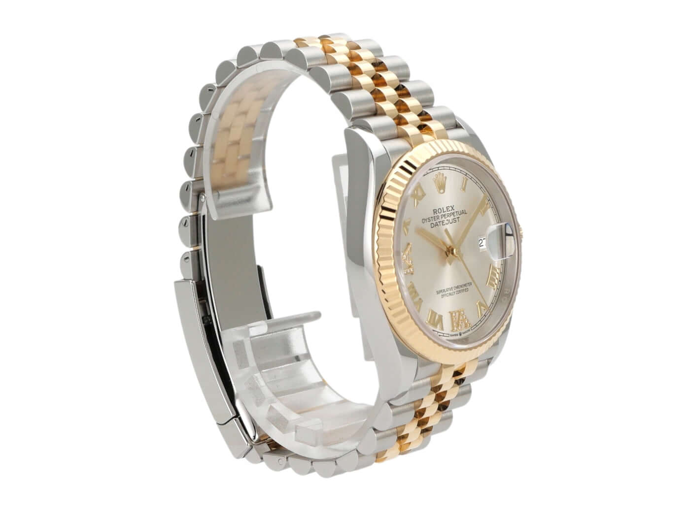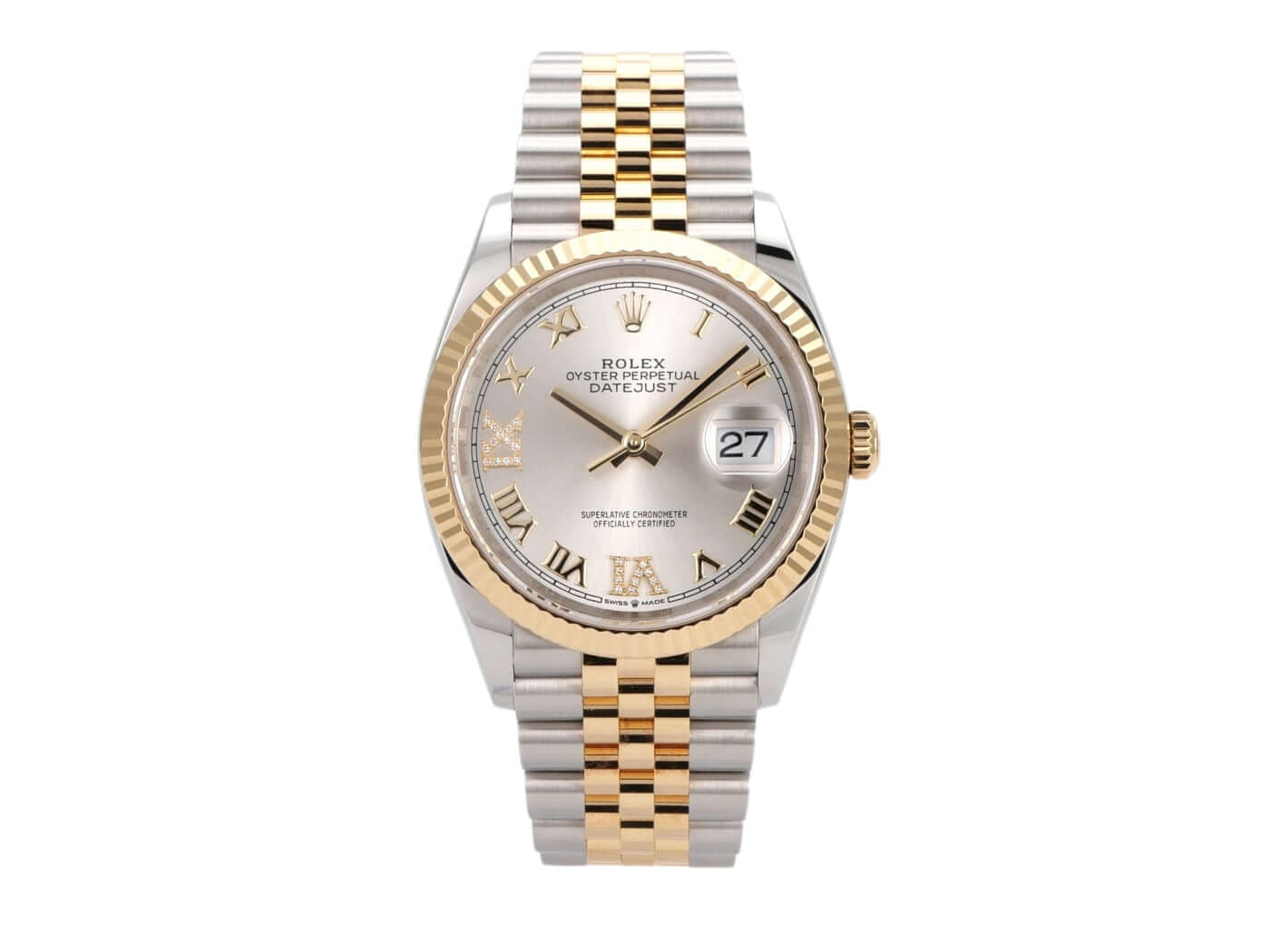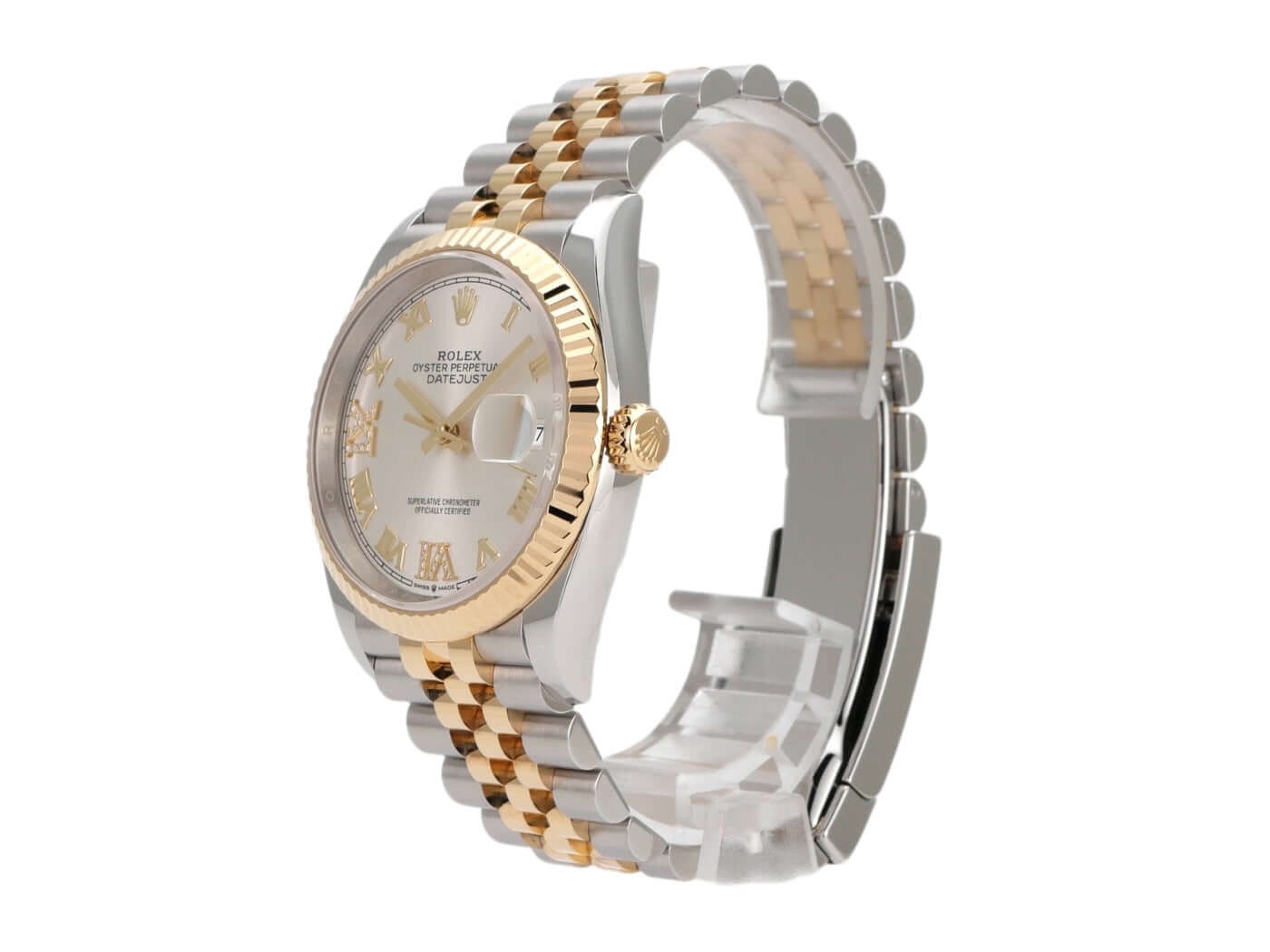 Stainless steel / polished and satin-finished yellow gold case, 36 mm case diameter, fluted 18 kt yellow gold bezel, Jubilee bracelet in stainless steel / 18 kt yellow gold polished and satin-finished with folding clasp, silver-colored dial with diamonds at Roman VI and IX, yellow gold hands, automatic movement, Rolex Manufacture Caliber 3235 with 31 jewels, 28,800 A/h, 70-hour power reserve, date display, chronometer, scratch-resistant sapphire crystal, screw-down 18 kt yellow gold crown, screw-down stainless steel case back, water-resistant up to 10 bar.