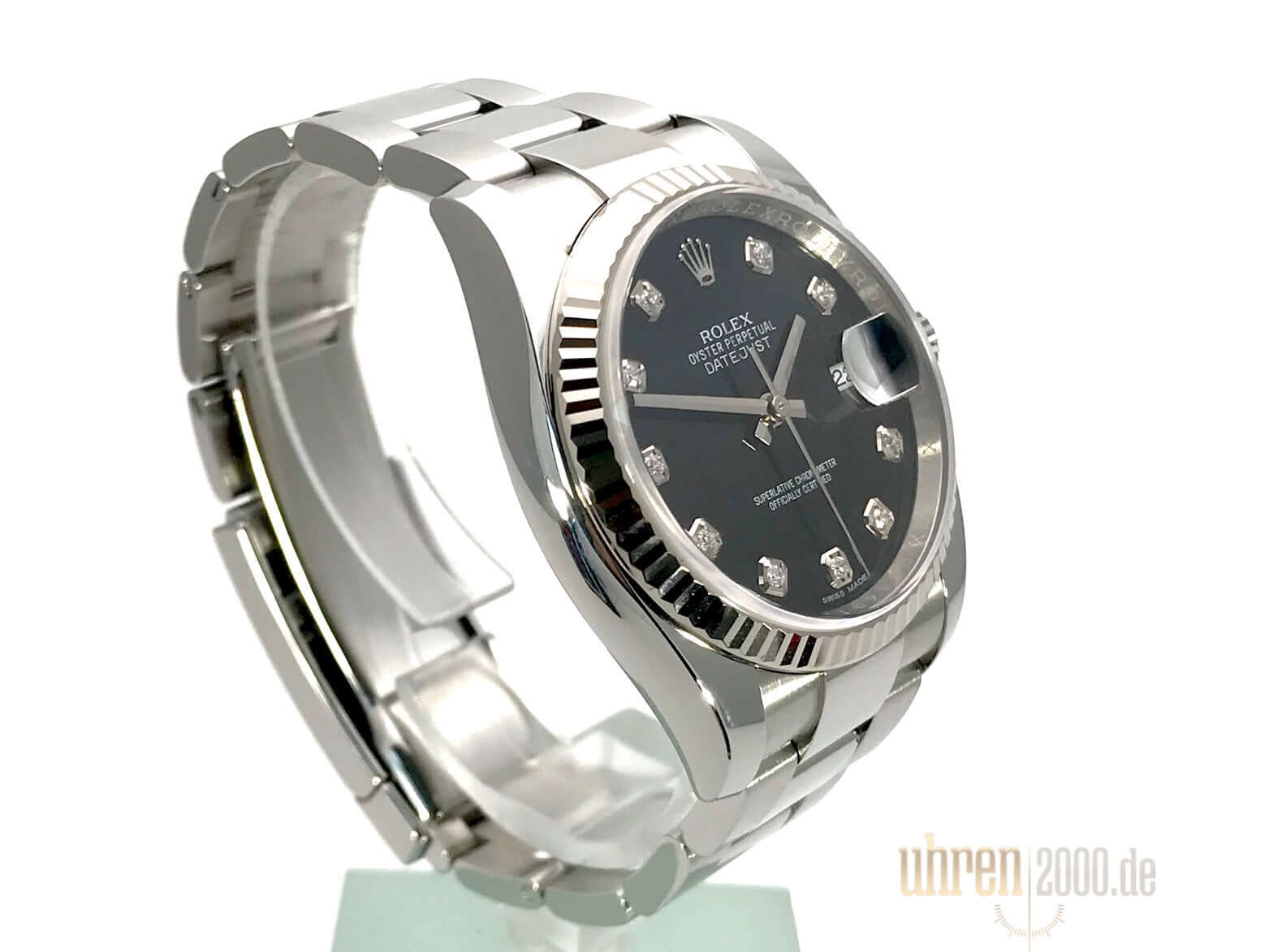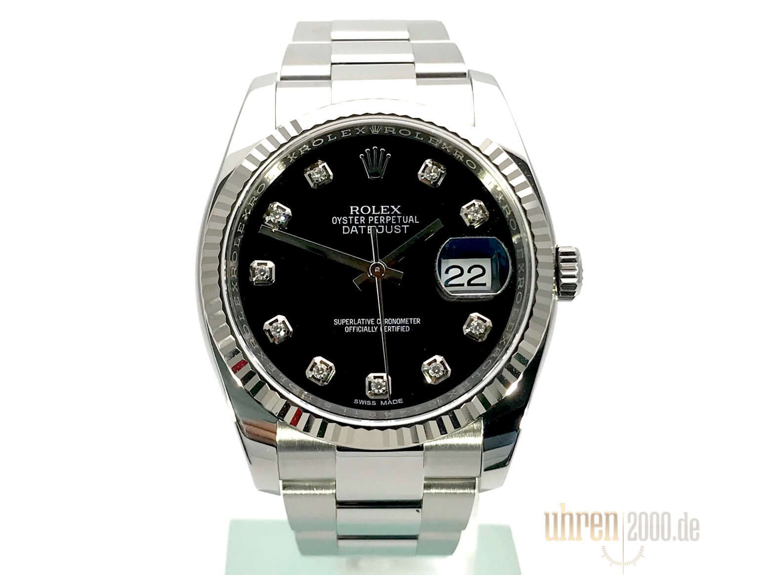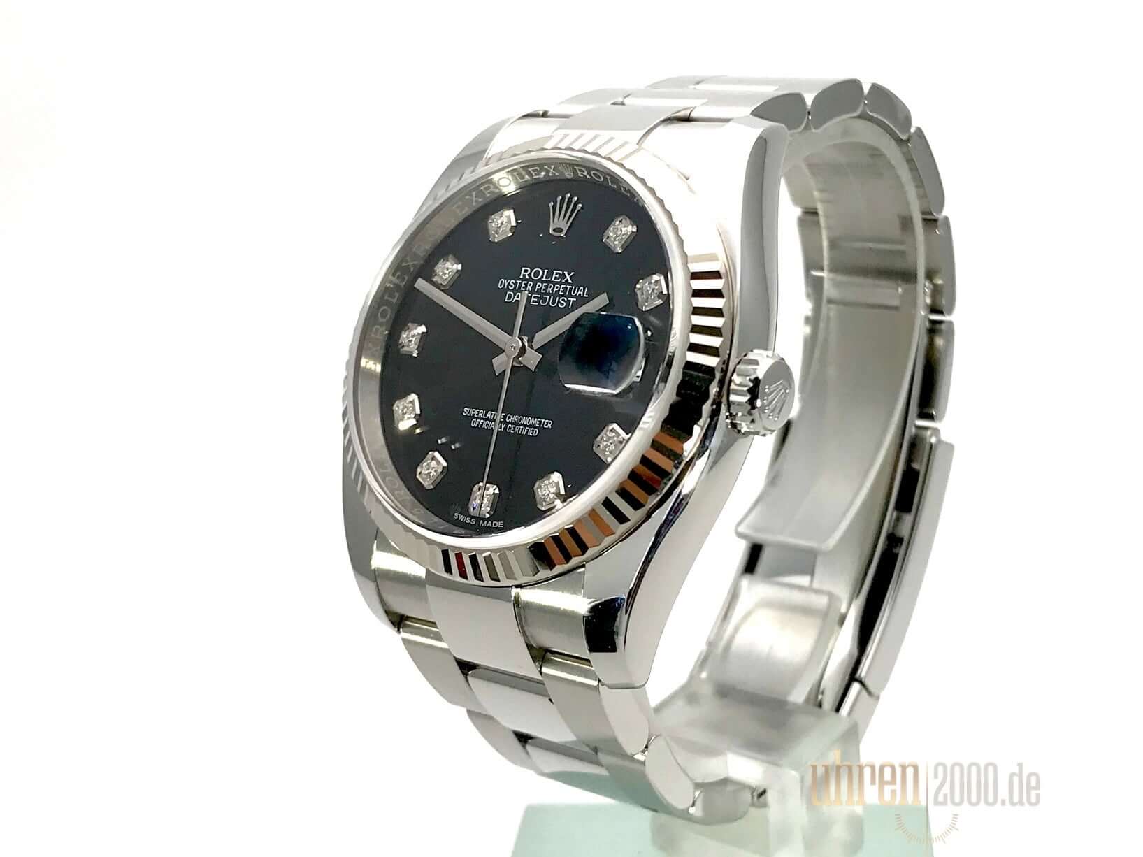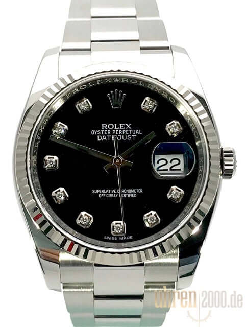 Case made of polished and satined stainless steel, case diameter 36 mm, case height 11.7 mm, bezel made of 18kt white gold, fluted, Oyster stainless steel bracelet polished and satined with folding clasp, black dial with 10 applied diamonds, automatic movement, Rolex manufacture caliber 3135 with 31 jewels, 28,800 A/h, date display, chronometer, scratch-resistant sapphire crystal, screw-on crown, screw-on stainless steel back, water-resistant up to 10 bar.