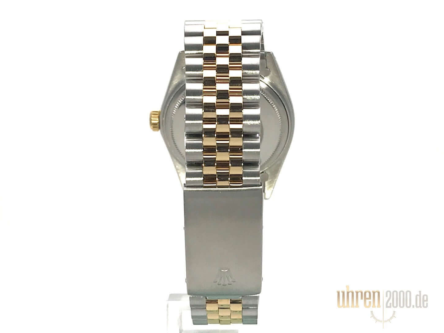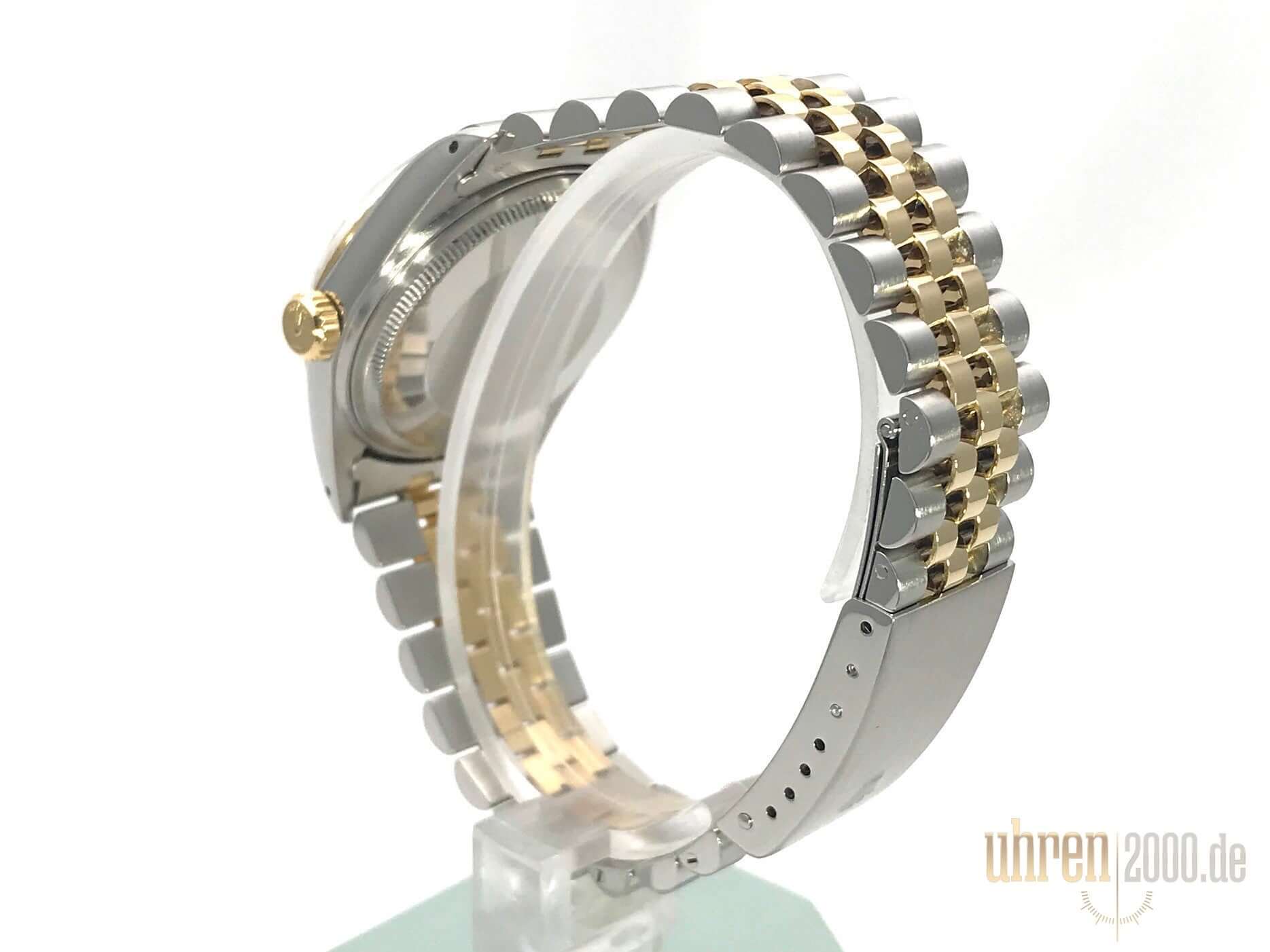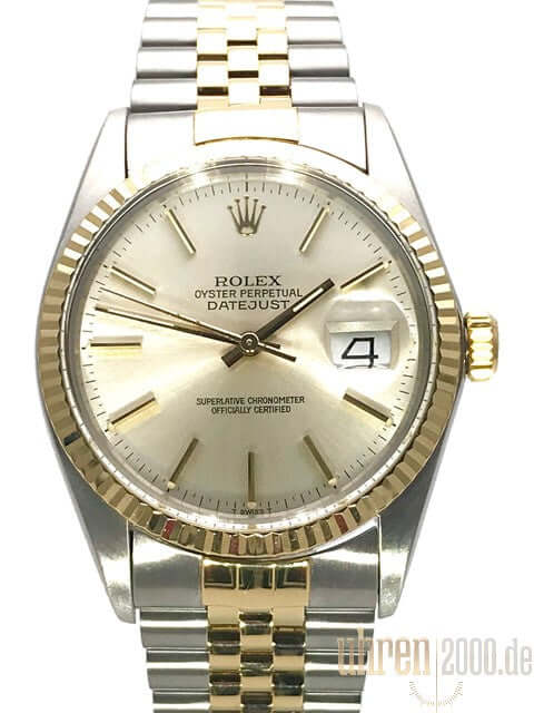 Case polished and satined stainless steel, case diameter 36 mm, case height approx. 11.7 mm, fluted yellow gold bezel, anniversary bracelet in stainless steel / yellow gold polished and satined with folding clasp, silver dial with applied yellow gold indices, automatic movement, Rolex 3035 with 31 jewels, 28,800 A /h, date display, chronometer, plexiglass, screwed crown, screwed stainless steel base, water resistant up to 10 bar.