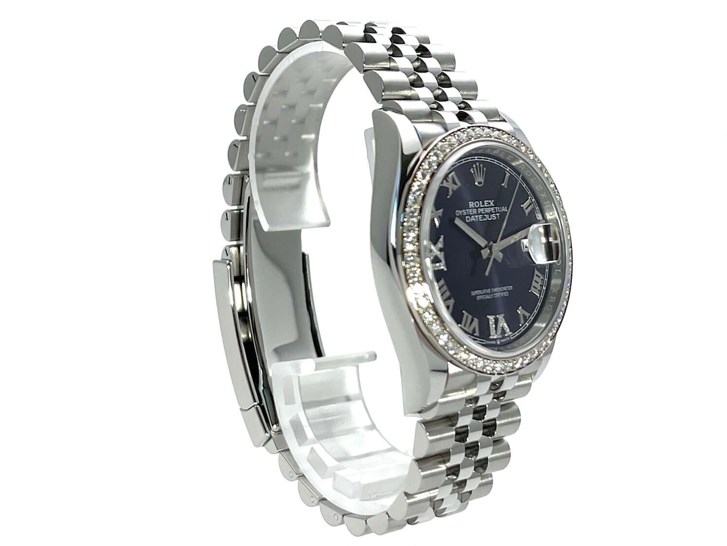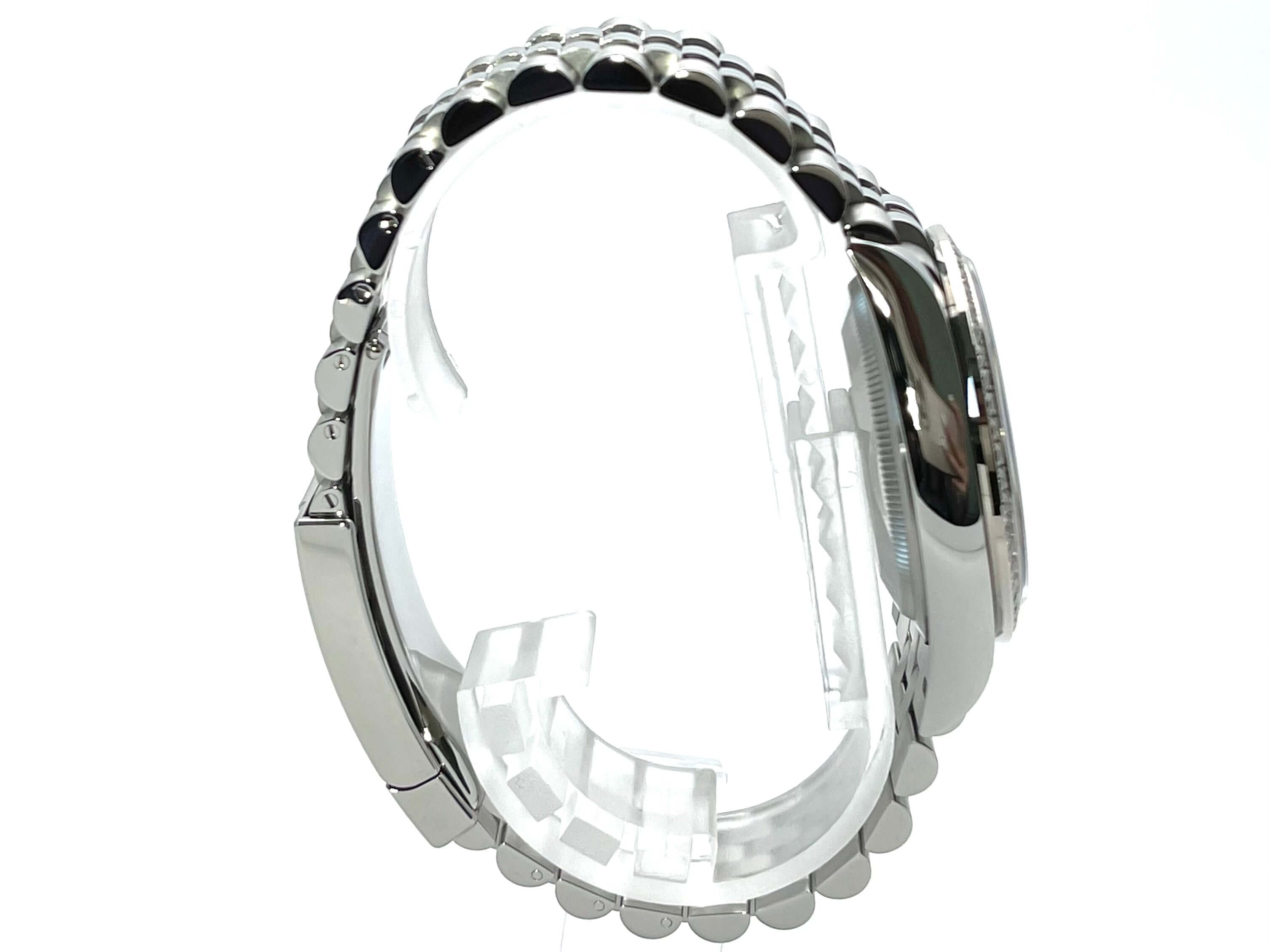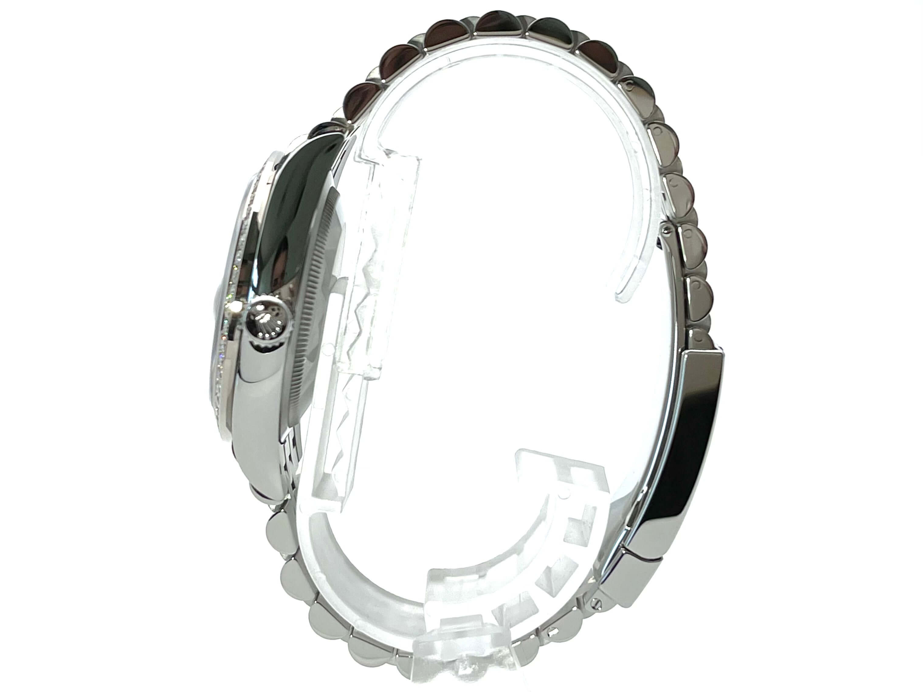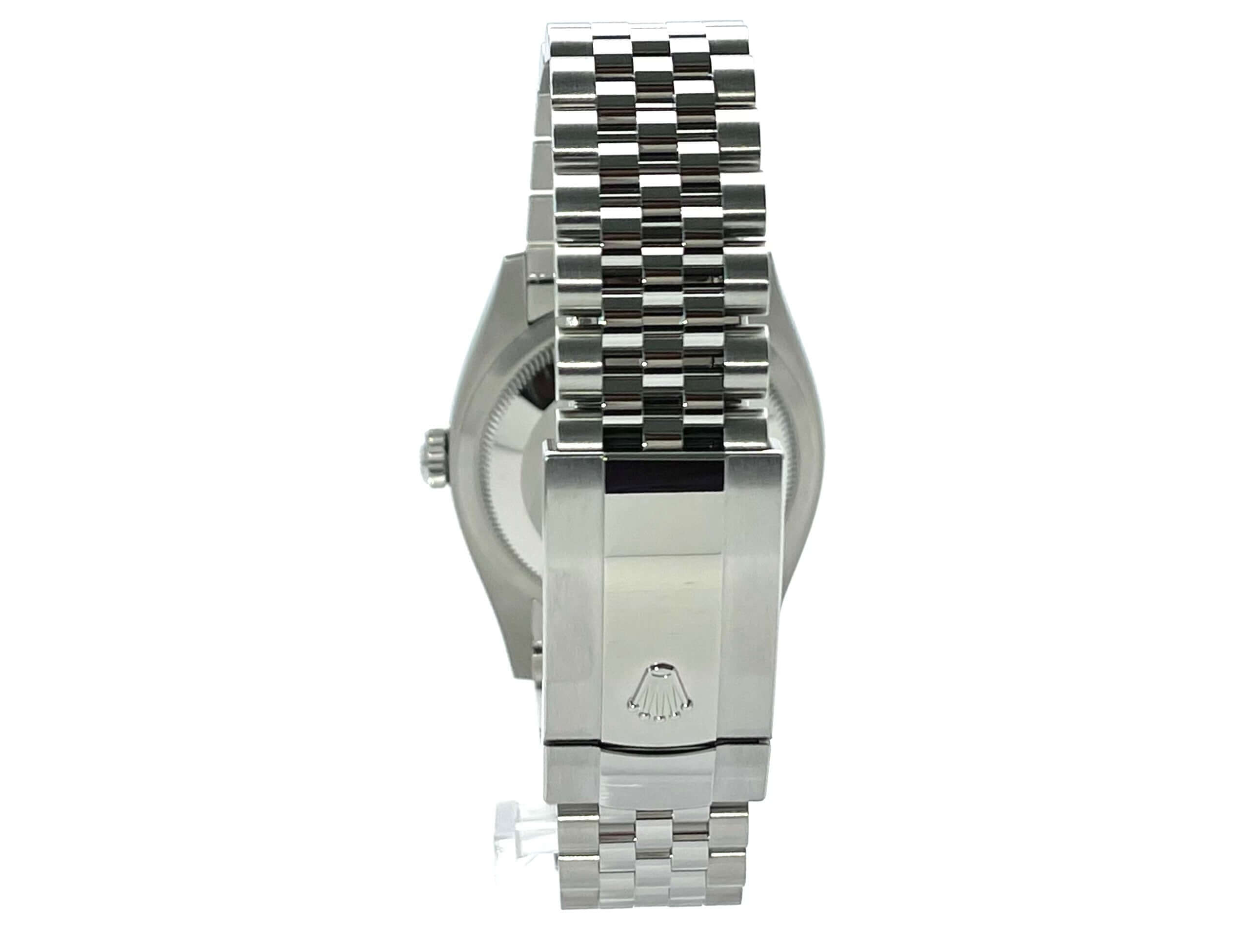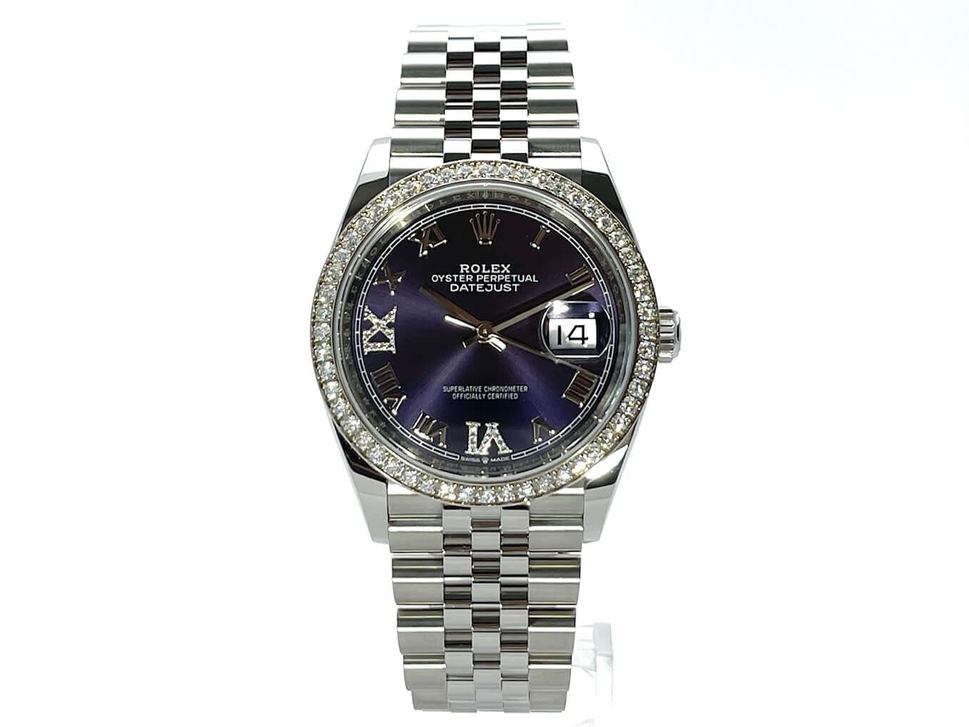 Case made of polished and satin-finished Oystersteel stainless steel, case diameter 36 mm, 18 kt white gold bezel set with diamonds, aubergine-colored Jubile diamond dial, Jubile stainless steel strap with folding clasp, automatic, Rolex manufacture caliber 3235, 70-hour power reserve, date display, chronometer, sapphire crystal, screw-down crown, Screwed stainless steel base, waterproof up to 10 bar.