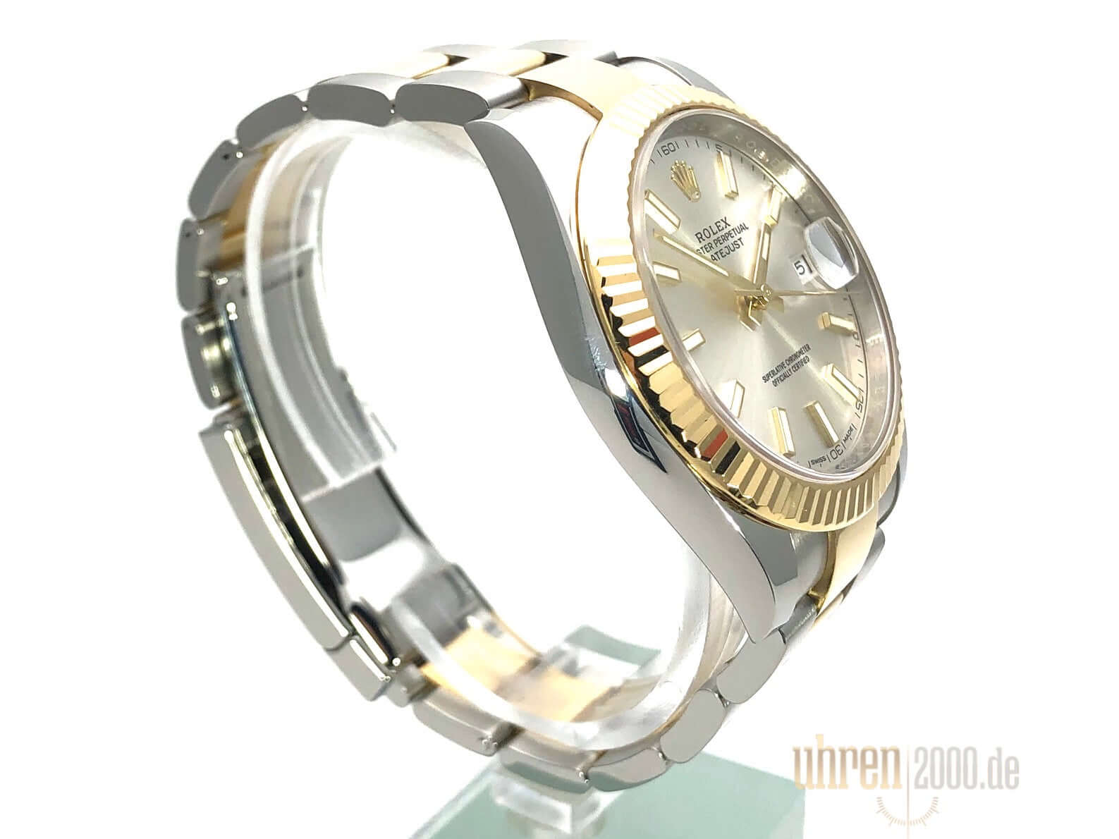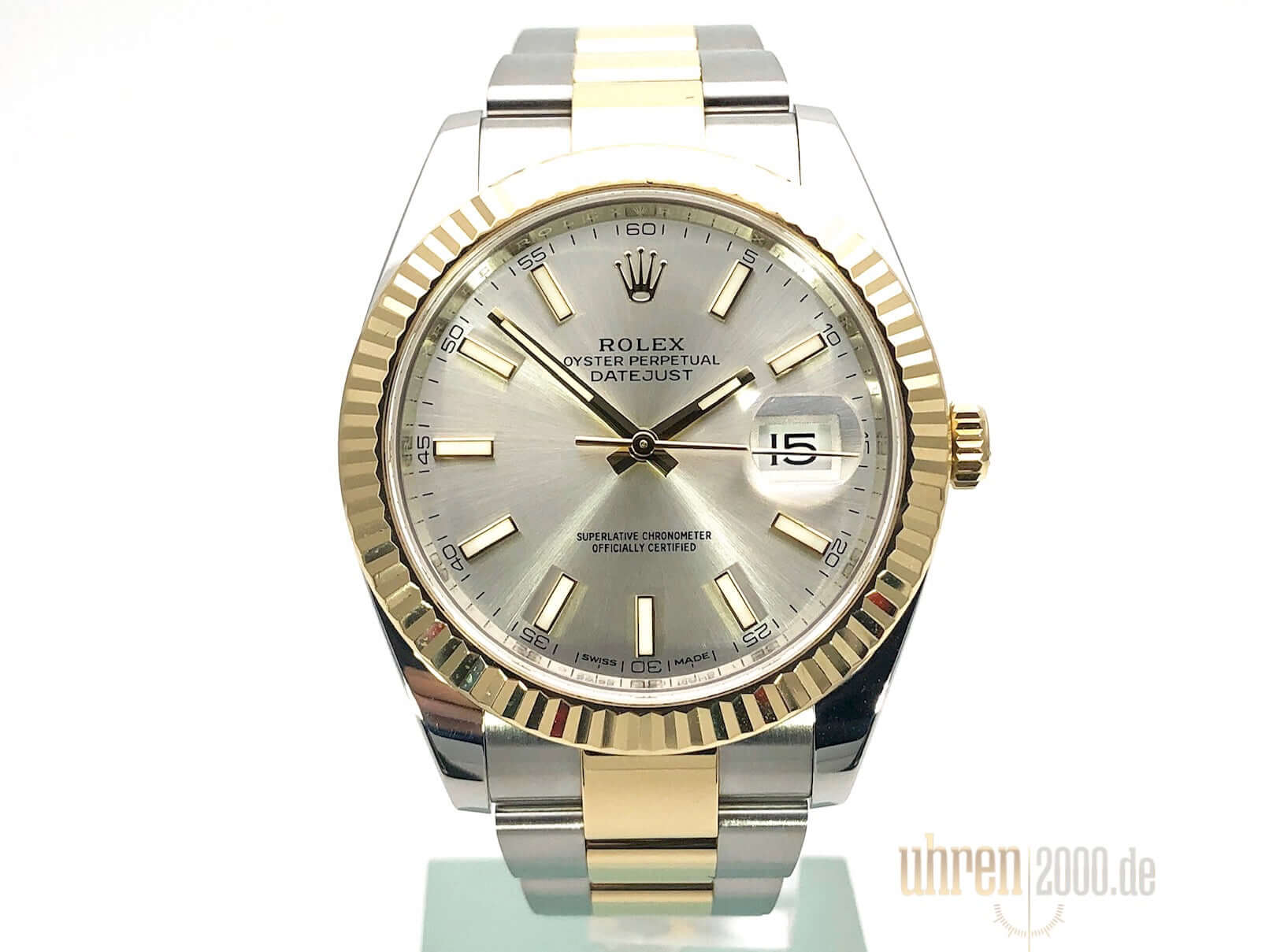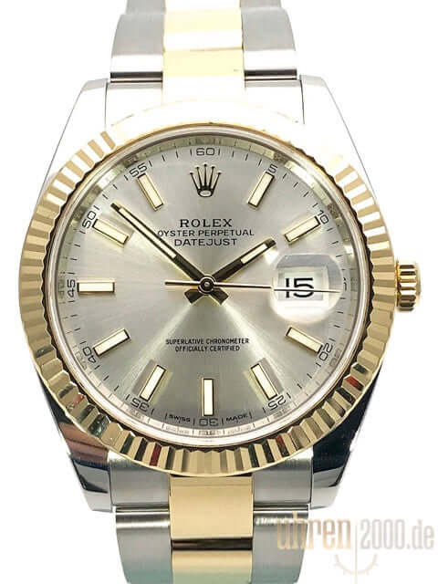 Case made of stainless steel / yellow gold polished and satin-finished, case diameter 41 mm, fluted 18 kt yellow gold bezel, Oyster bracelet made of stainless steel / 18 kt yellow gold polished and satin-finished with folding clasp, silver-colored dial with 18 kt yellow gold luminous indices, 18 kt yellow gold luminous hands, automatic movement, Rolex manufacture caliber 3235, 70 hour power reserve, date display, chronometer, screwed 18 kt yellow gold crown, scratch-resistant sapphire crystal, screwed stainless steel back, water resistant up to 10 bar.