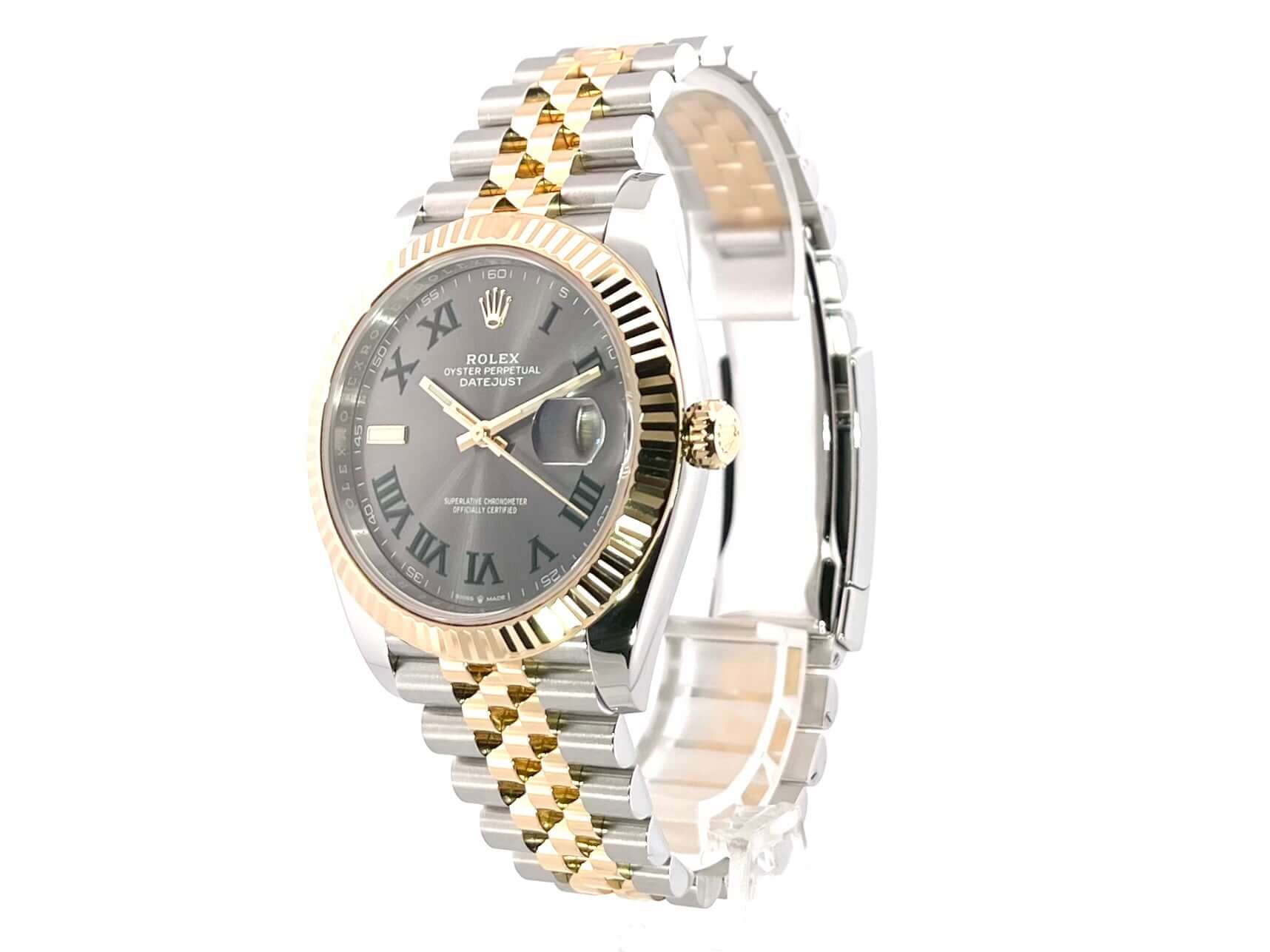 Case made of stainless steel / yellow gold polished and satin-finished, case diameter 41 mm, fluted 18 kt yellow gold bezel, Jubile bracelet made of stainless steel / 18 kt yellow gold polished and satin-finished with folding clasp, slate gray dial with Roman numerals, automatic movement, Rolex manufacture caliber 3235, chronometer, 70 hours Power reserve, date display, scratch-resistant sapphire crystal, screwed 18 kt yellow gold crown, screwed stainless steel back, water resistant up to 10 bar.