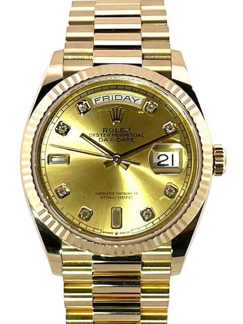 Case made of 18 kt yellow gold polished and satined, case diameter 36 mm, bezel made of 18 kt yellow gold fluted, President bracelet made of 18 kt yellow gold polished and satined with folding clasp, champagne-colored dial with applied diamonds, automatic movement, Rolex manufacture caliber 3255 with 31 jewels, vibration 28,800 A /h, 70 hour power reserve, date display with glass magnifier at 3 o'clock, day of the week display at 12 o'clock, chronometer, scratch-resistant sapphire crystal, screw-down crown, screw-down case back made of 18 kt yellow gold, water-resistant up to 10 bar.