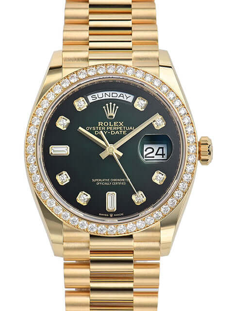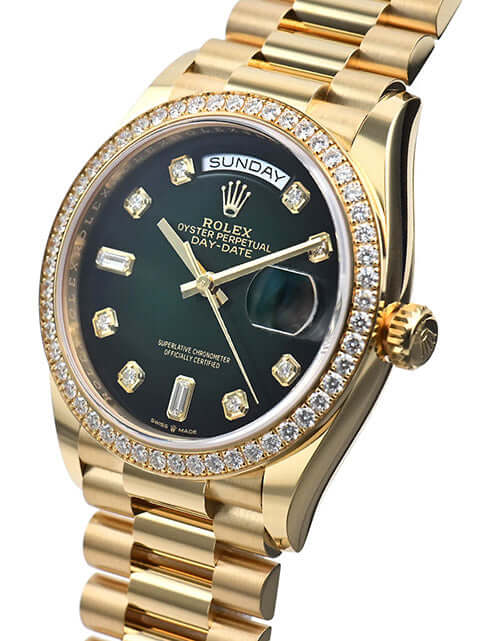 Case made of 18 kt yellow gold polished and satin-finished, case diameter 36 mm, bezel made of 18 kt yellow gold set with diamonds, President bracelet made of 18 kt yellow gold polished and satin-finished with folding clasp, green dial with applied diamonds, automatic movement, Rolex manufacture caliber 3255 with 31 jewels, oscillation 28,800 A/h, 70 hour power reserve, date display with glass magnifier at 3 o'clock, day of the week display at 12 o'clock, chronometer, scratch-resistant sapphire crystal, screw-down crown, screw-down base made of 18 kt yellow gold, water-resistant up to 10 bar.