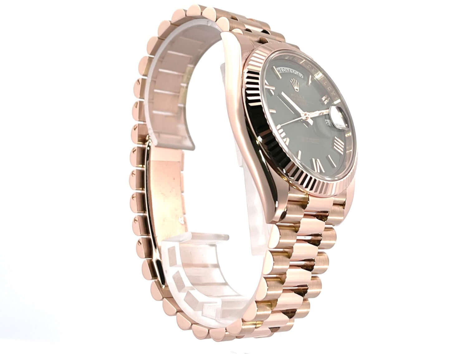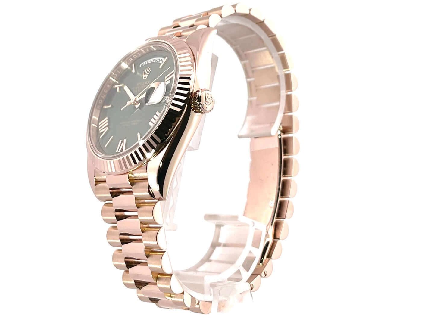 Case made of 18 kt Everose gold polished, case diameter 40 mm, bezel made of 18 kt Everose gold fluted, President bracelet made of 18 kt Everose gold polished and satin finished with folding clasp, olive green dial with Roman numerals, automatic movement, Rolex manufacture caliber 3255, date, Day of the week, chronometer, scratch-resistant sapphire crystal, screwed back made of 18 kt Everose gold, water resistant up to 10 bar.