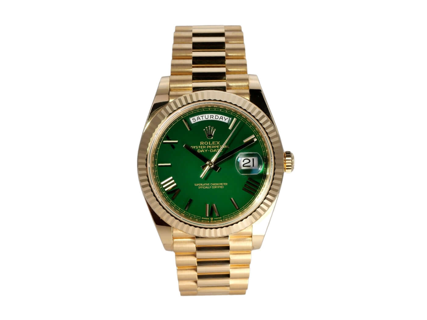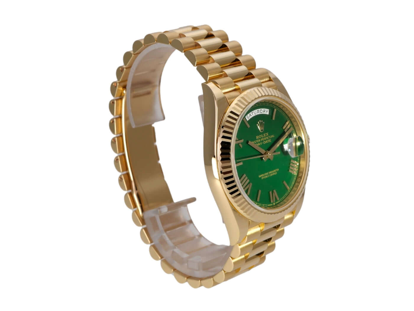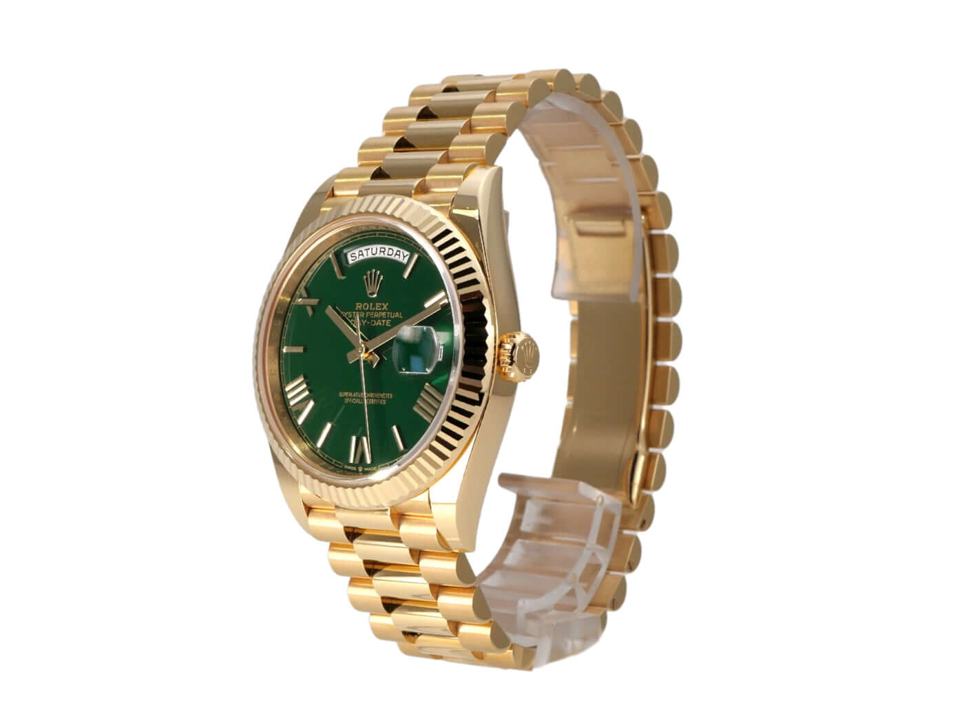 Case made of 18 kt polished yellow gold, case diameter 40 mm, bezel made of 18 kt fluted yellow gold, President bracelet made of 18 kt polished and satin-finished yellow gold with folding clasp, green dial with applied gold Roman numerals, automatic movement, chronometer, Rolex manufacture caliber 3255, date with magnifying glass at 3 o'clock, day of the week, scratch-resistant sapphire crystal, screwed case back made of 18 kt yellow gold, water-resistant up to 10 bar.