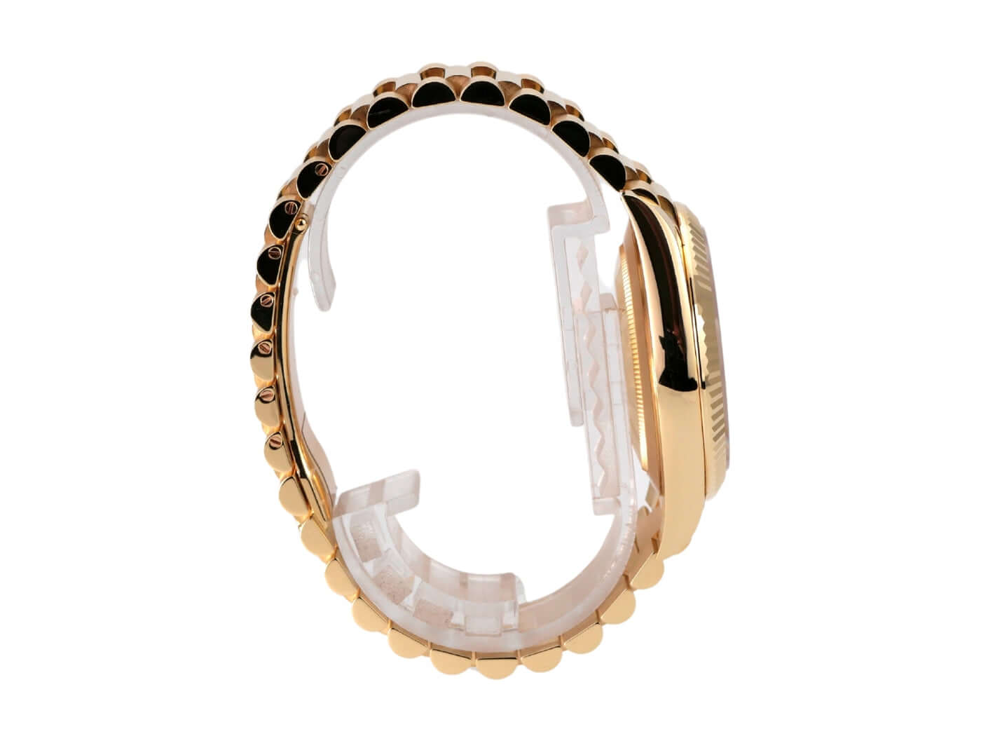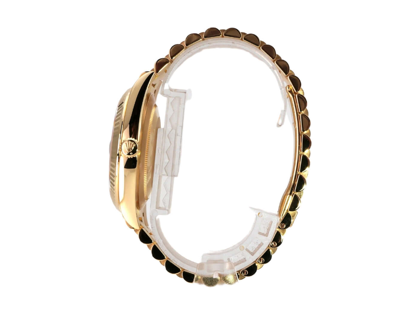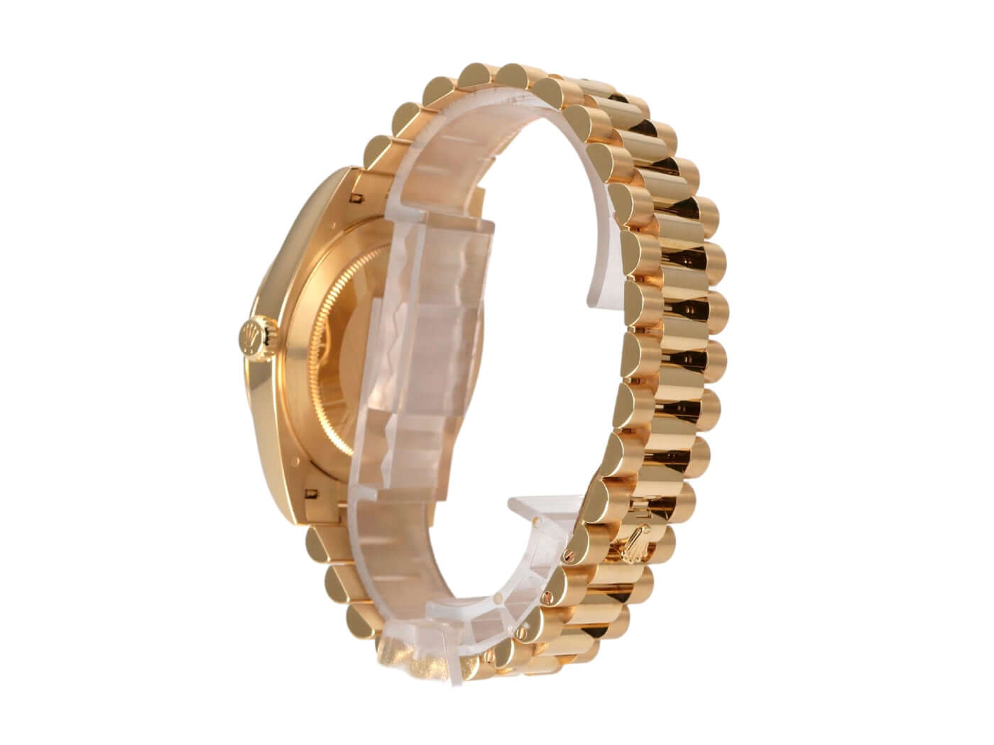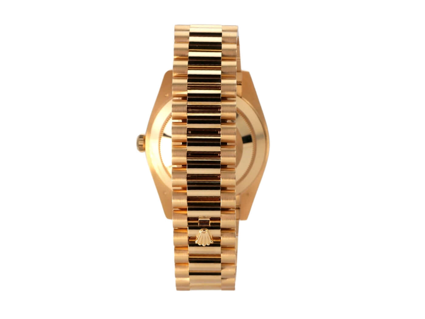 Case made of 18 kt polished yellow gold, case diameter 40 mm, bezel made of 18 kt fluted yellow gold, President bracelet made of 18 kt polished and satin-finished yellow gold with folding clasp, green dial with applied gold Roman numerals, automatic movement, chronometer, Rolex manufacture caliber 3255, date with magnifying glass at 3 o'clock, day of the week, scratch-resistant sapphire crystal, screwed case back made of 18 kt yellow gold, water-resistant up to 10 bar.