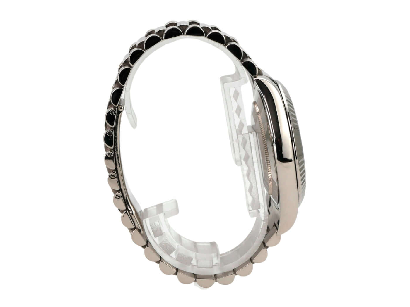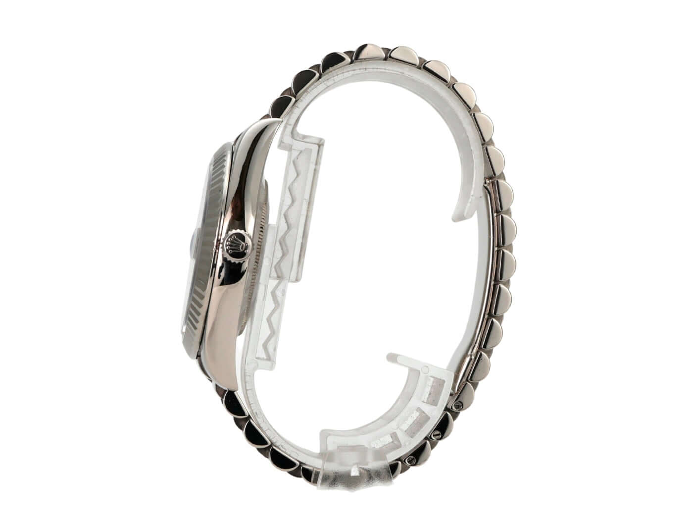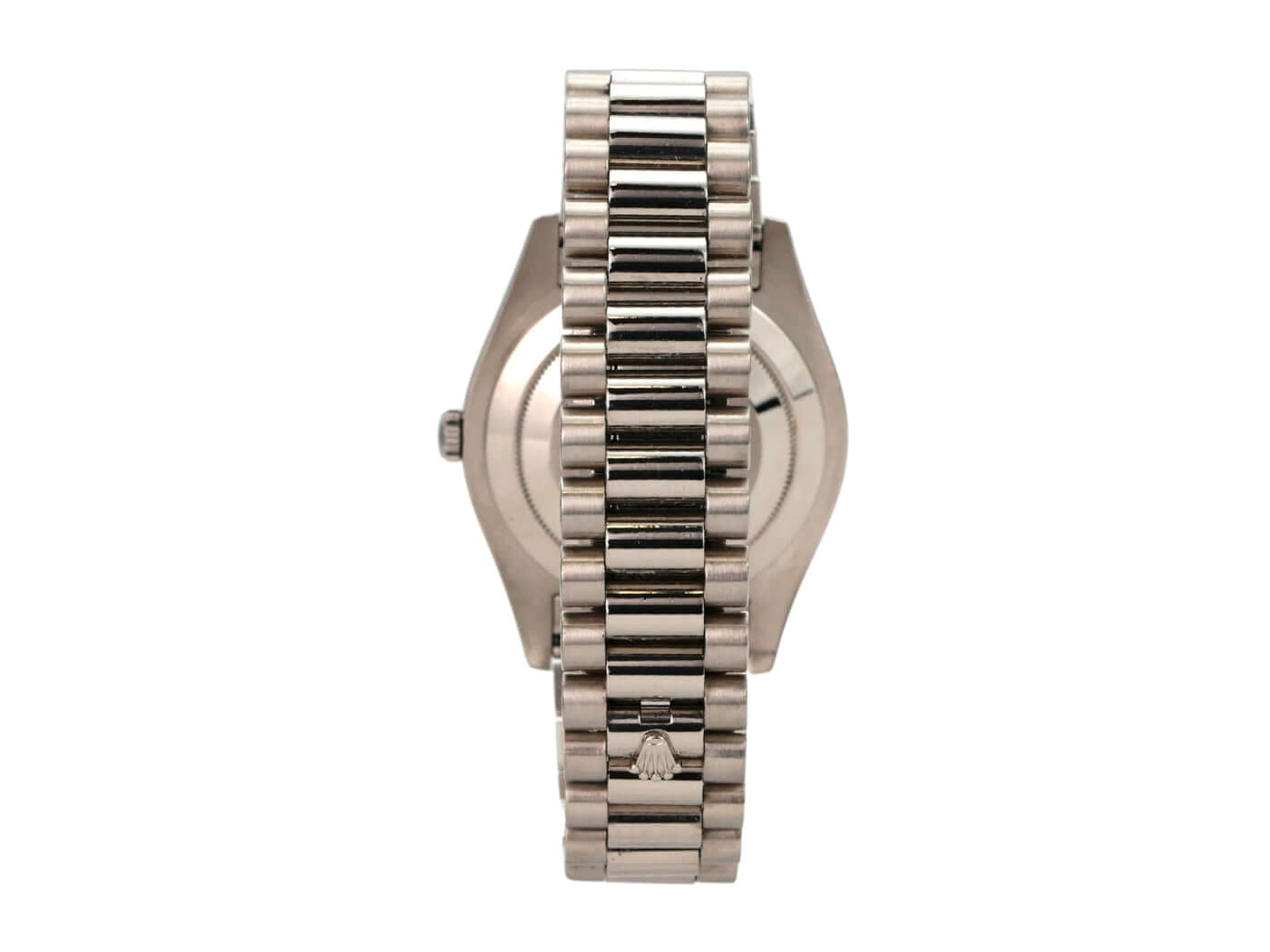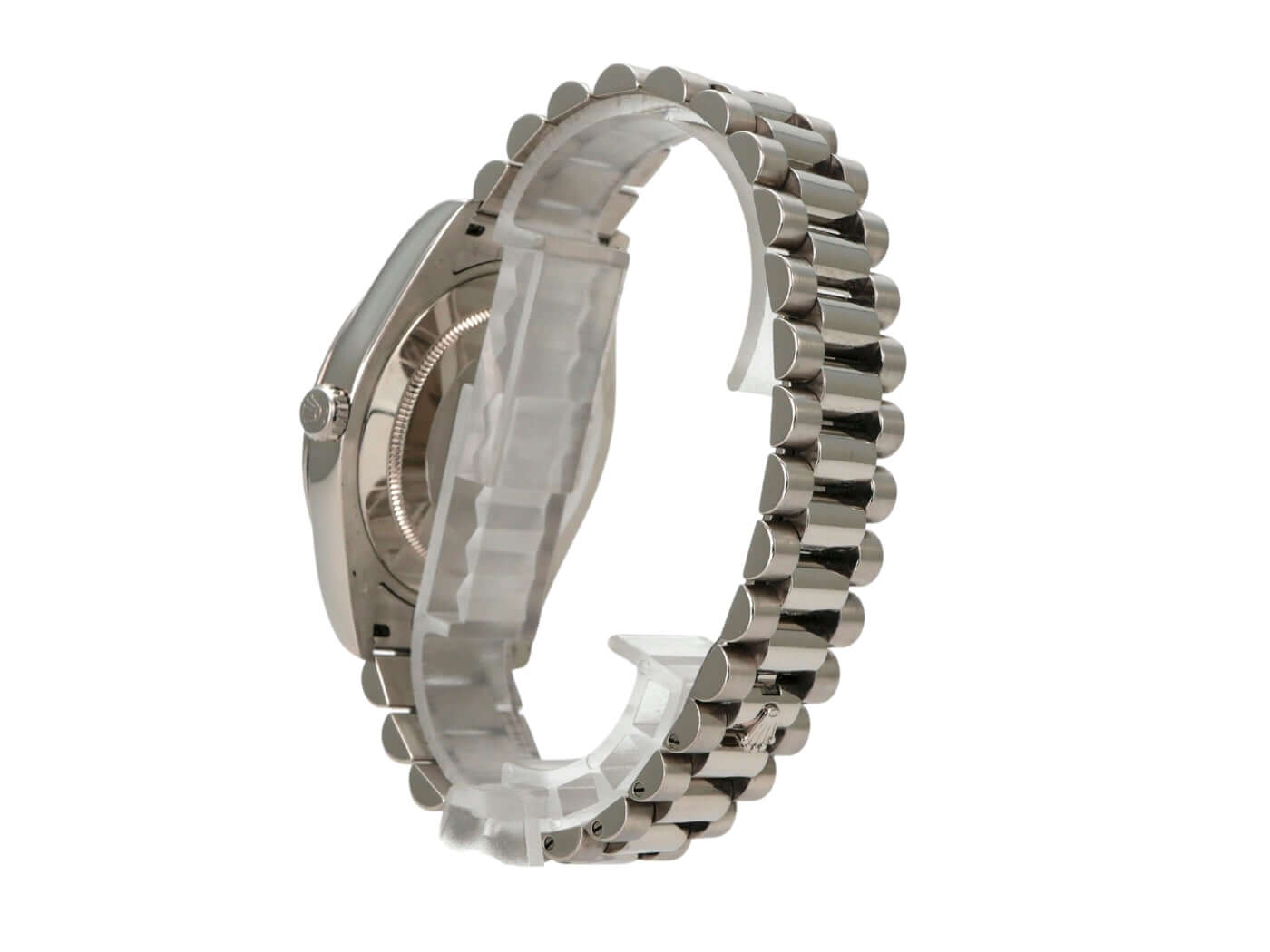 Case made of 18 kt white gold, polished and satin-finished, case diameter 41 mm, bezel made of 18 kt white gold, fluted, President bracelet made of 18 kt white gold, polished and satin-finished with folding clasp, gray dial with applied Arabic numerals, automatic movement, chronometer, Rolex manufacture caliber 3156 with 31 jewels, frequency 28,800 A/h, date display with magnifying glass at 3 o'clock, weekday display at 12 o'clock, scratch-resistant sapphire crystal, screw-down crown, screw-down case back made of 18 kt white gold, water-resistant up to 10 bar.