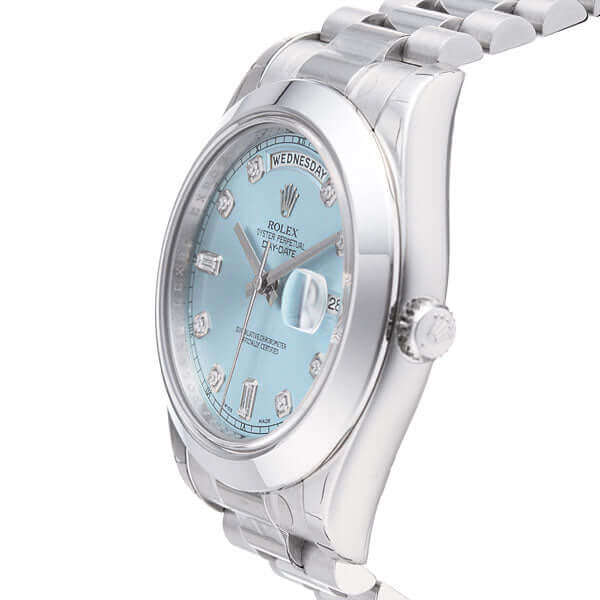 Case in 950 platinum polished and satin-finished, case diameter 41 mm, bezel in 950 platinum polished, President bracelet in 950 platinum polished and satin-finished with folding clasp, dial in ice blue with 8 diamonds and 2 diamond baguettes, automatic movement, chronometer with COSC certification, Rolex manufacture caliber 3156 with 31 jewels, oscillation 28,800 A/h, display of hours, minutes and seconds from the center, date display with glass magnifier at 3 o'clock, day of the week display at 12 o'clock, scratch-resistant sapphire crystal, screw-on crown, screw-on back in 950 platinum, water-resistant up to 10 bar .