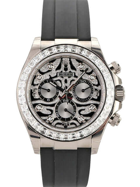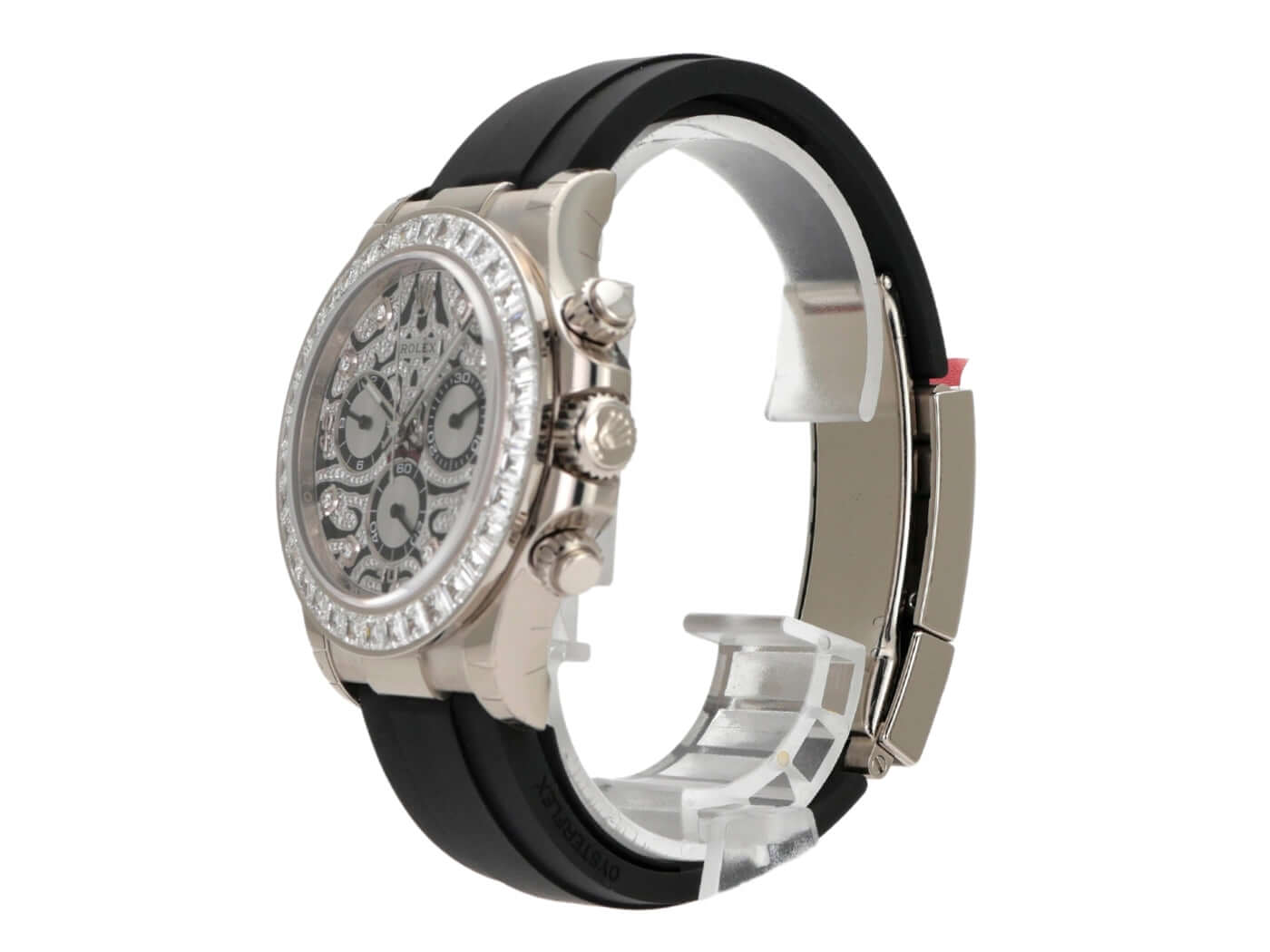 Case made of polished and satin-finished 18 kt white gold, case diameter 40 mm, case height 12.4 mm, White gold bezel set with baguette diamonds, black Oysterflex strap with 18 kt white gold folding clasp, Eye of the Tiger diamond dial, automatic movement, Rolex manufacture caliber 4130 with 44 jewels, frequency 28,800 A/h, power reserve of approximately 72 hours, chronograph, chronometer, scratch-resistant sapphire crystal, screw-down crown made of 18 kt white gold with flank protection, screw-down case back made of 18 kt white gold, water-resistant up to 10 bar.