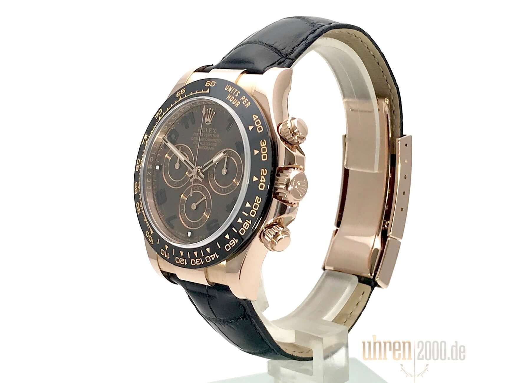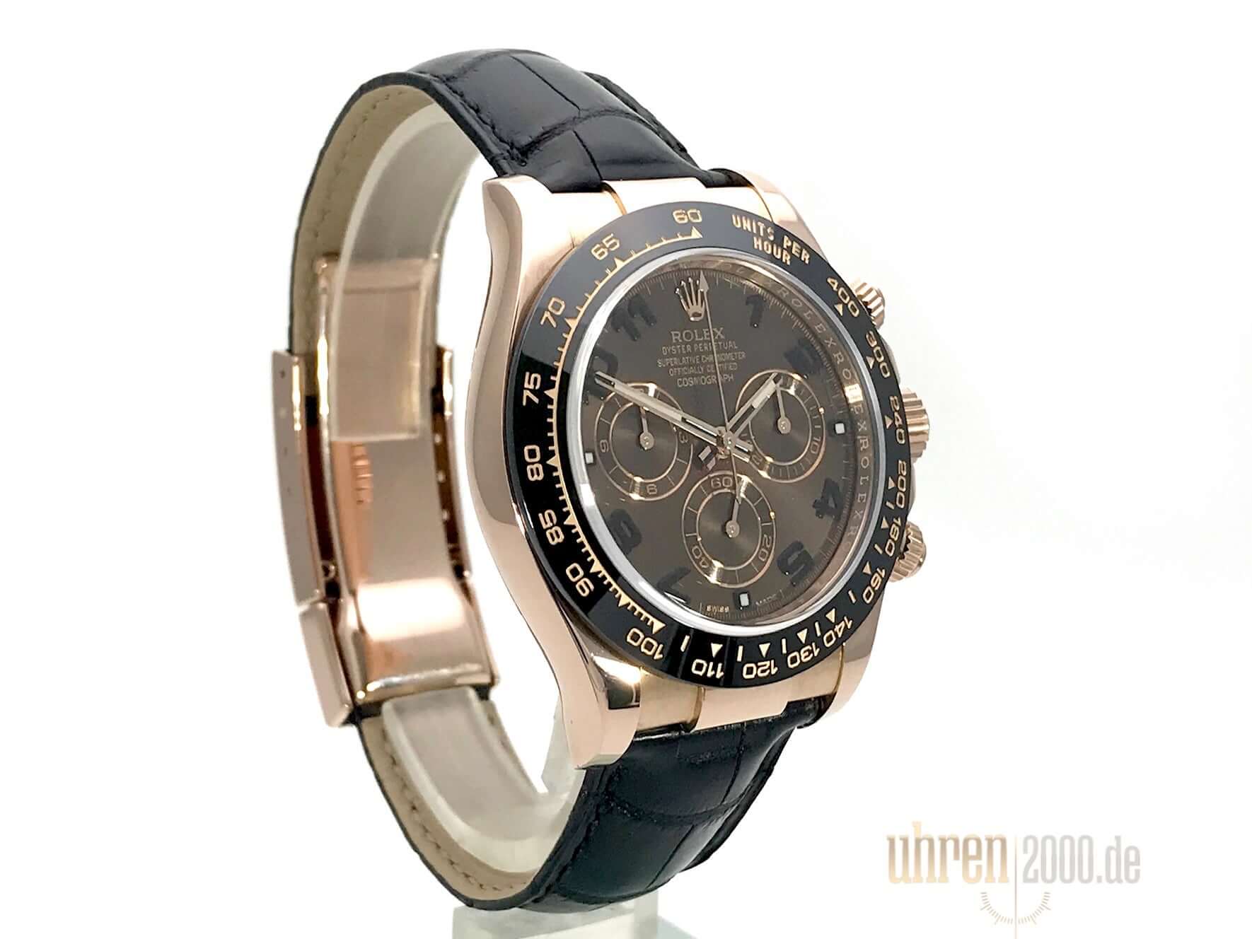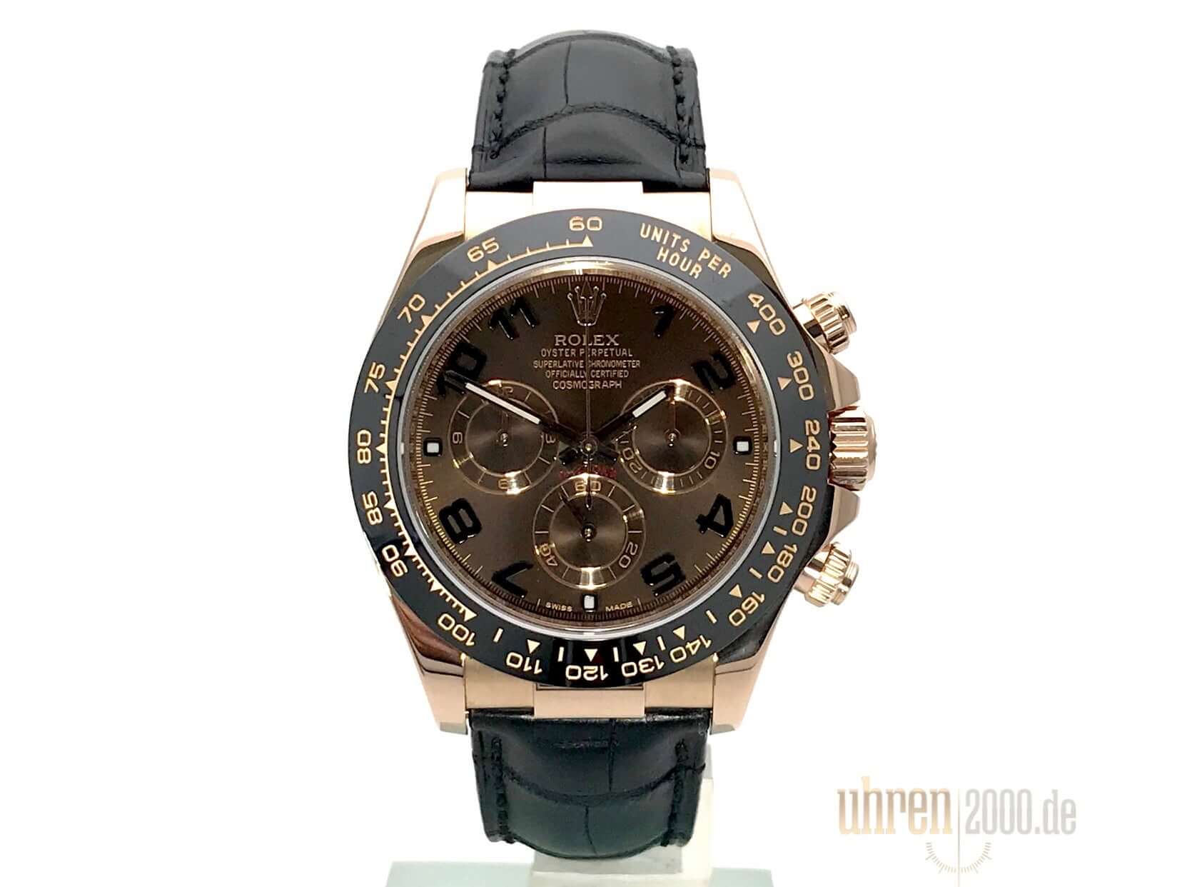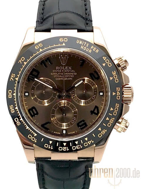 Case made of 18 kt Everose gold polished and satined, case diameter 40 mm, ceramic bezel with engraved tachymeter scale, black leather strap with folding clasp made of 18 kt Everose gold polished and satined, brown dial with black Arabic numerals, Everose gold luminous hands, automatic movement, chronometer , Rolex manufacture caliber 4130 with 44 jewels, vibration 28,800 A/h, scratch-resistant sapphire crystal, screwed back made of 18 kt Everose gold, water resistant up to 10 bar.