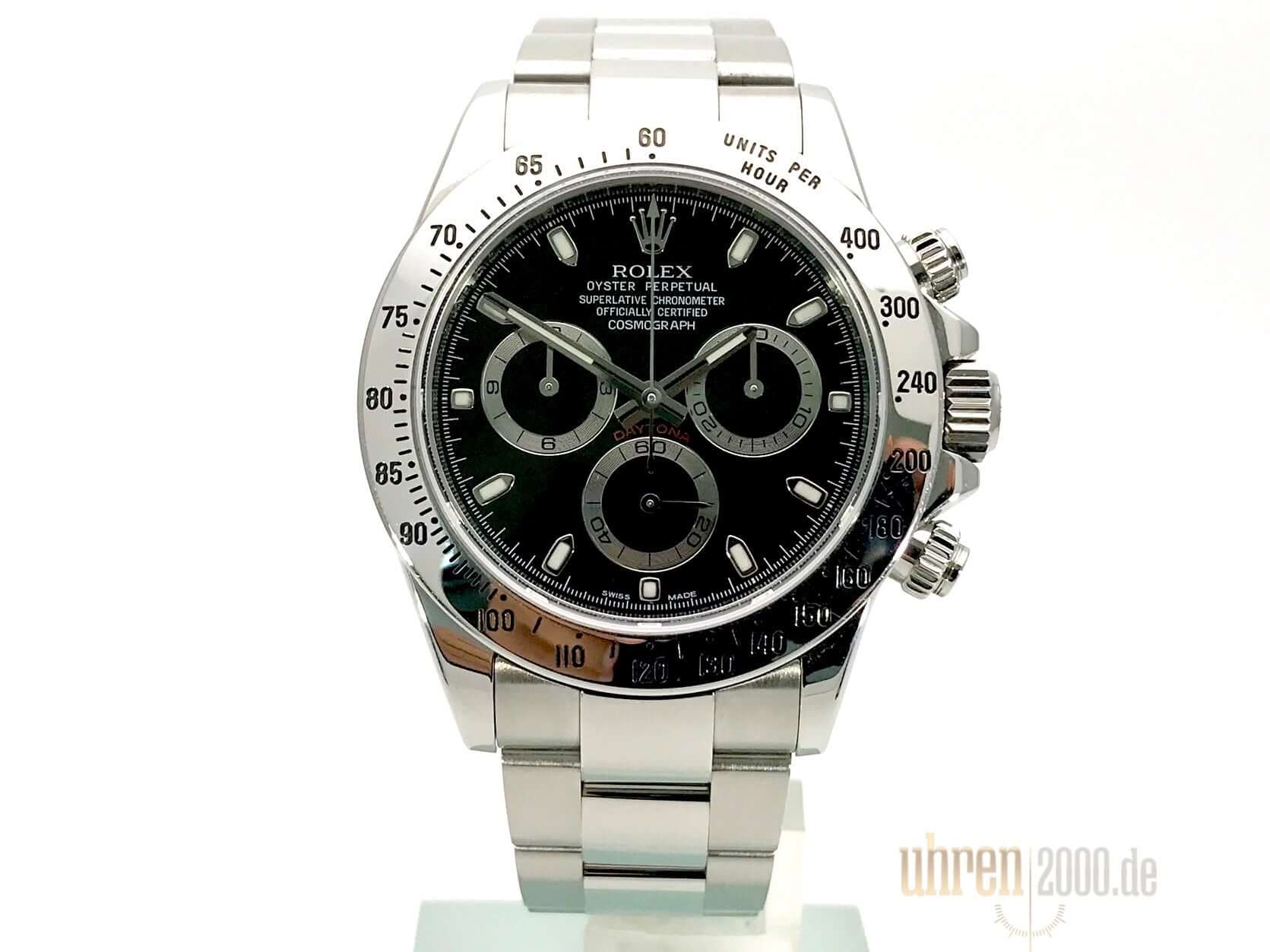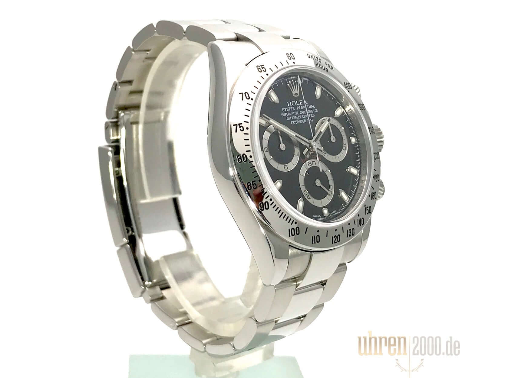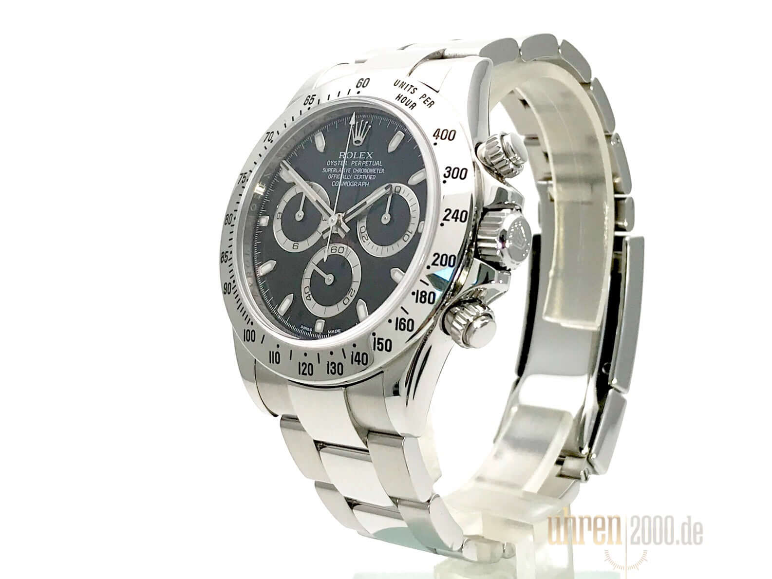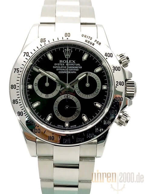 Case made of polished and satined stainless steel, polished stainless steel bezel with tachymeter scale, polished and satinized Oyster stainless steel bracelet with safety folding clasp, black dial, luminous hands, Rolex manufacture caliber 4130, 44 jewels, power reserve approx. 72 hours, chronometer, screwed crown with side protection and manufacturer logo, stainless steel back screwed, sapphire crystal, water resistant up to 10 bar.