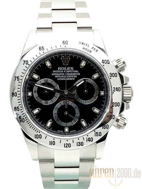 Case made of polished and satined stainless steel, polished stainless steel bezel with tachymeter scale, polished and satinized Oyster stainless steel bracelet with safety folding clasp, black dial, luminous hands, Rolex manufacture caliber 4130, 44 jewels, power reserve approx. 72 hours, chronometer, screw-down crown with side protection, sapphire crystal, stainless steel back screwed, waterproof up to 10 bar.