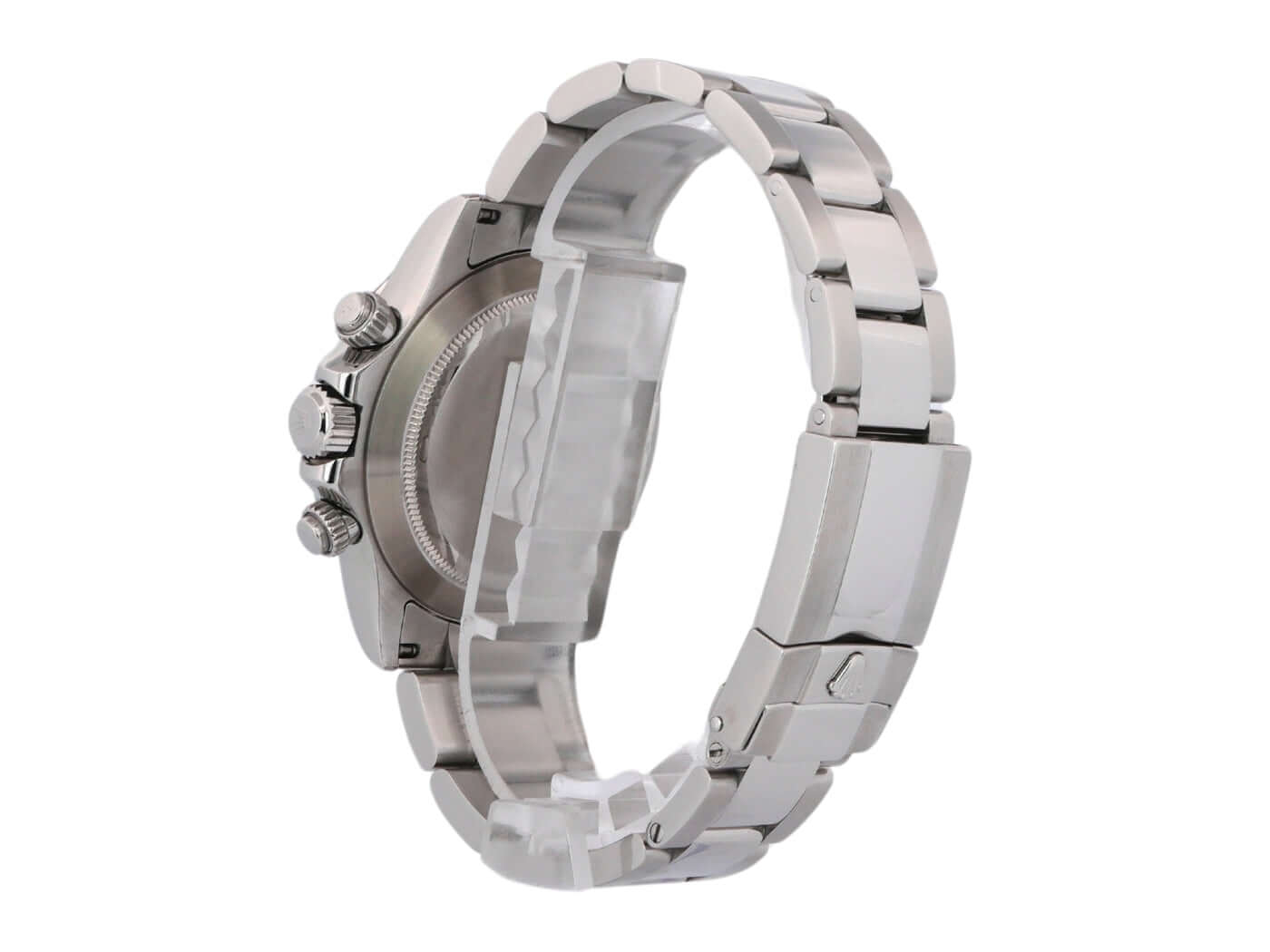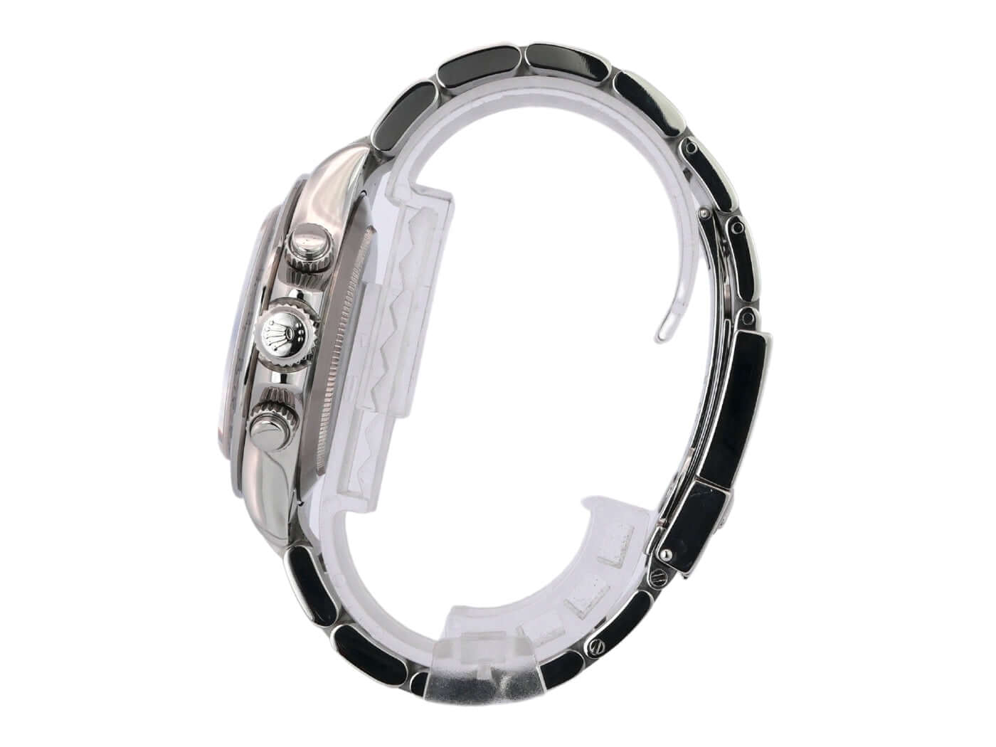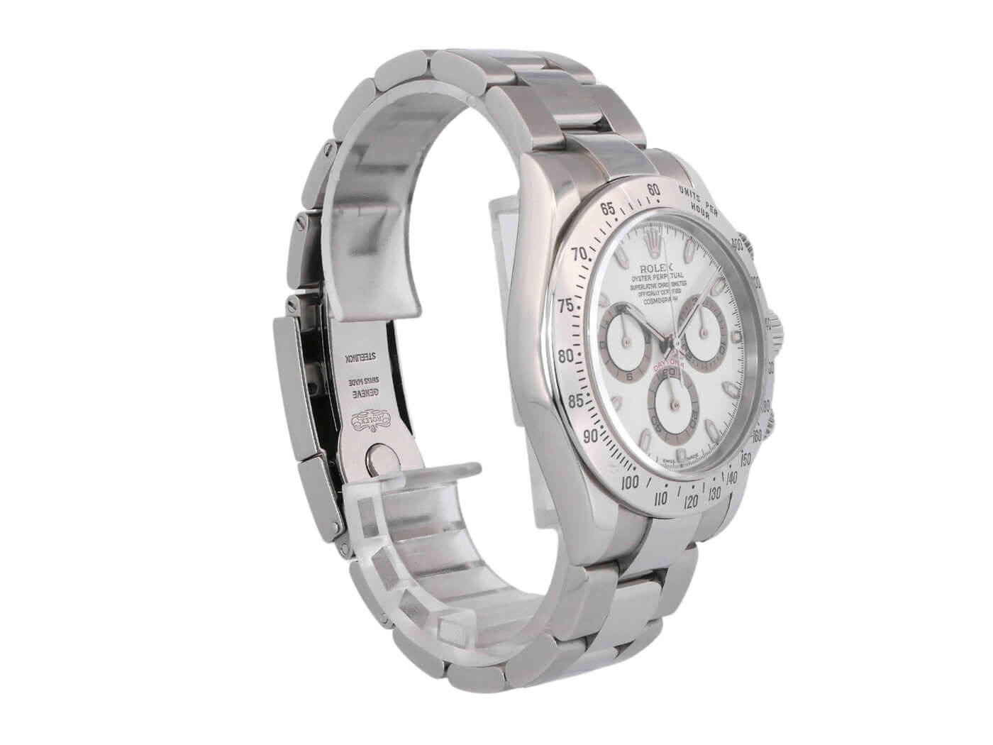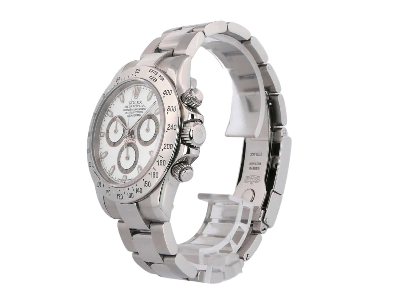 Case made of polished and satined stainless steel, polished stainless steel bezel with tachymeter scale, polished and satinized Oyster stainless steel bracelet with safety folding clasp, white dial with luminous indices, luminous hands, Rolex manufacture caliber 4130 with 44 jewels, power reserve for approx. 72 hours, sapphire crystal, chronometer, screwed crown Side protection, screwed stainless steel base, waterproof up to 10 bar.