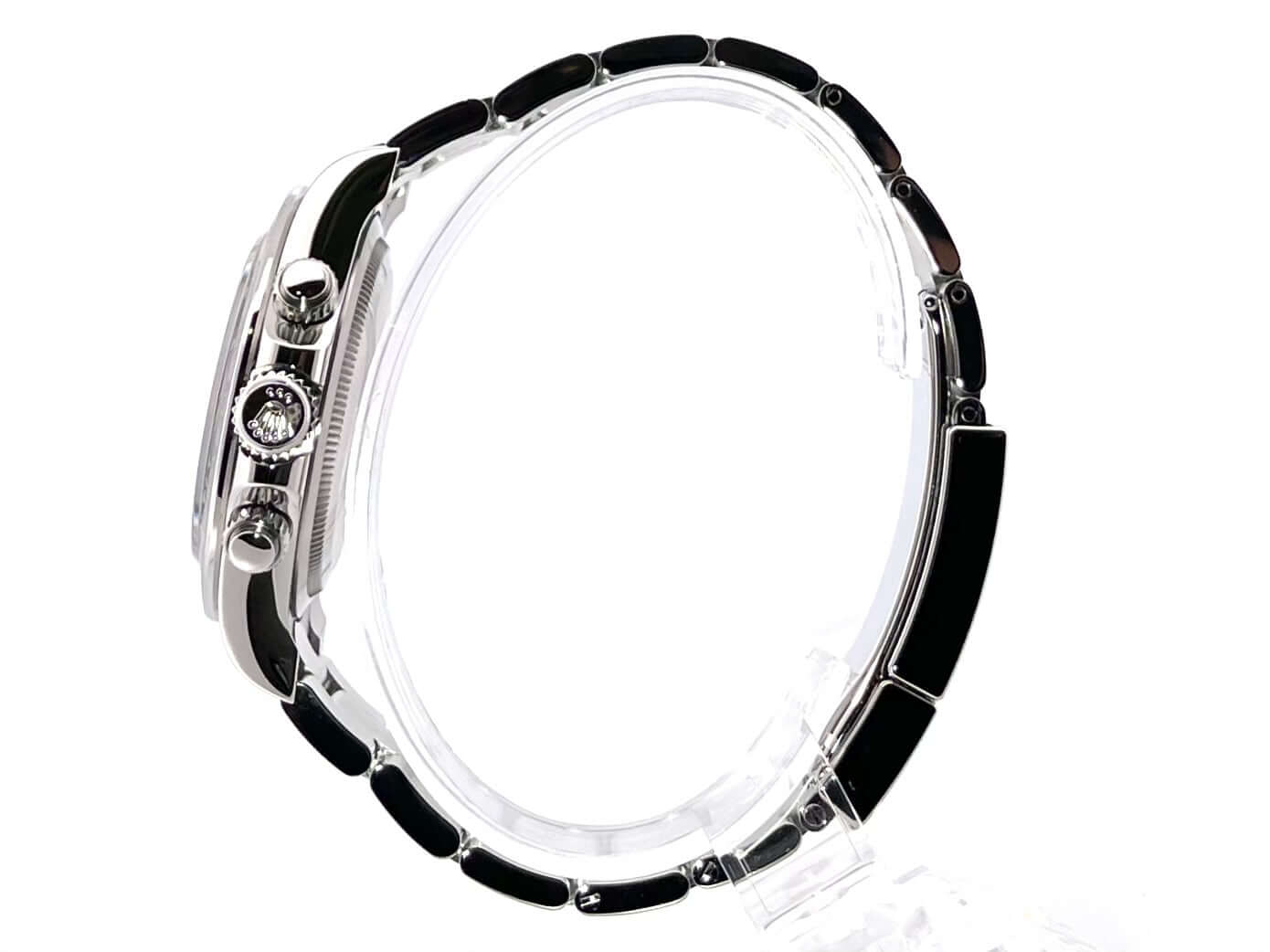 Case made of polished and satined stainless steel, ceramic bezel with tachymeter scale, Oyster stainless steel bracelet polished and satined with safety folding clasp, white dial, luminous hands, Rolex manufacture caliber 4131, 47 jewels, power reserve approx. 72 hours, chronometer, sapphire crystal, screw-down crown with side protection and manufacturer logo , screwed stainless steel base, waterproof up to 10 bar.