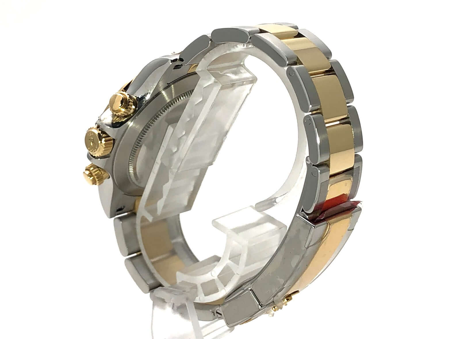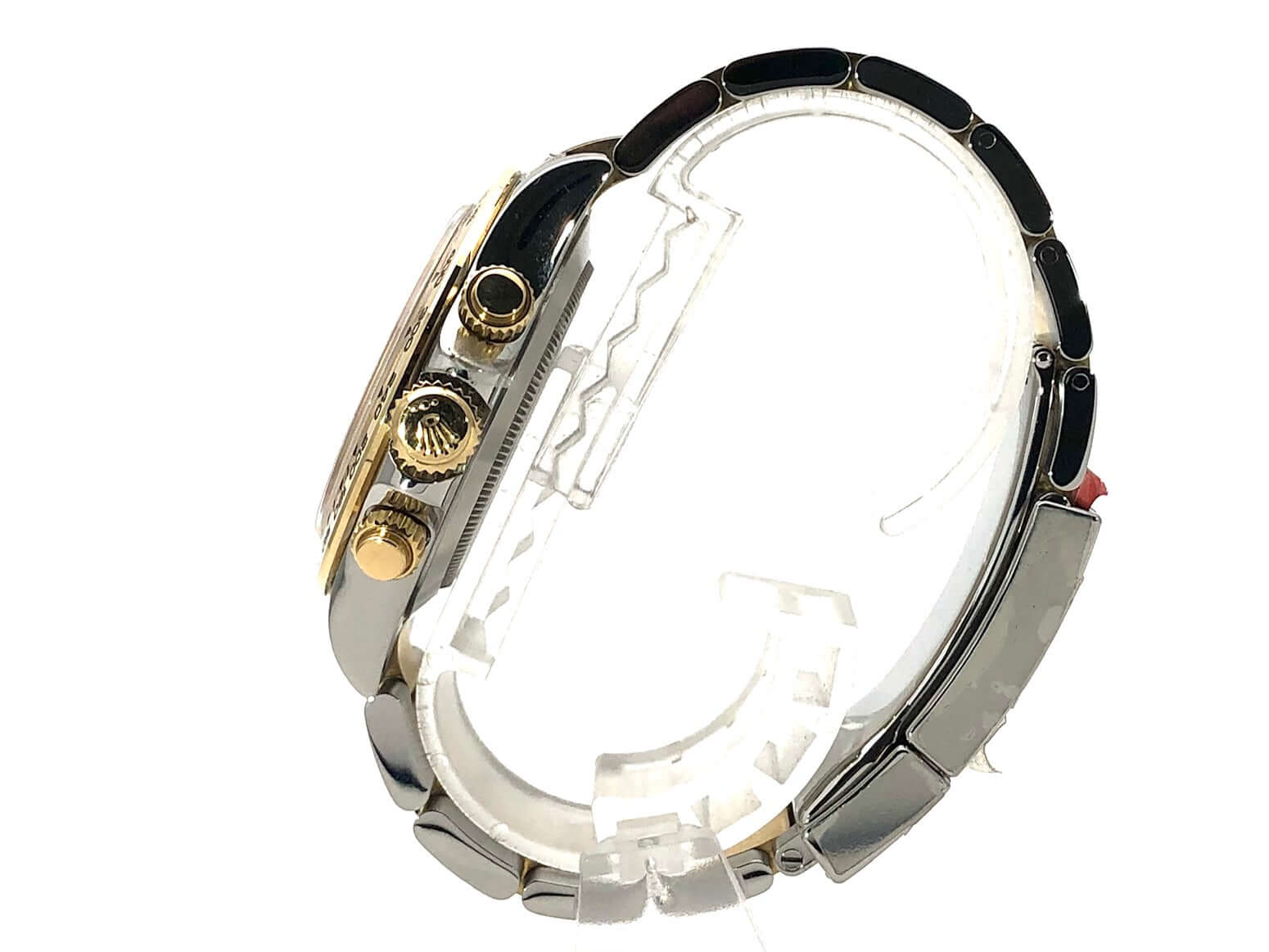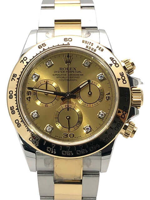 Case made of 40 mm polished and satined stainless steel, 18 kt yellow gold polished bezel with tachymeter scale, Oyster stainless steel / 18 kt yellow gold bracelet polished and satined with safety folding clasp, champagne-colored diamond dial, automatic, Rolex manufacture caliber 4130, 44 jewels, power reserve approx. 72 hours, chronometer, Sapphire crystal, screwed crown with side protection, screwed stainless steel back, water resistant up to 10 bar.