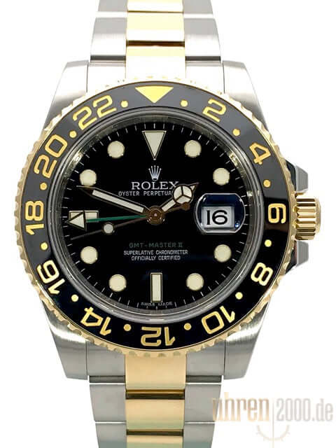 Case made of polished and satined stainless steel, case diameter 40 mm, case height 12.1 mm, 18 kt yellow gold fluted bezel with black ceramic inlay and 24 hour scale, rotatable on both sides, Oyster stainless steel / 18 kt yellow gold bracelet polished and satin finished with safety folding clasp, black dial with applied luminous indices and luminous dots, luminous hands, automatic movement, chronometer, Rolex manufacture caliber 3186 with 31 jewels, oscillation 28,800 A/h, date display, second time zone, scratch-resistant sapphire crystal, screw-on yellow gold crown with side protection, screwed stainless steel base, water-resistant up to 10 bar.