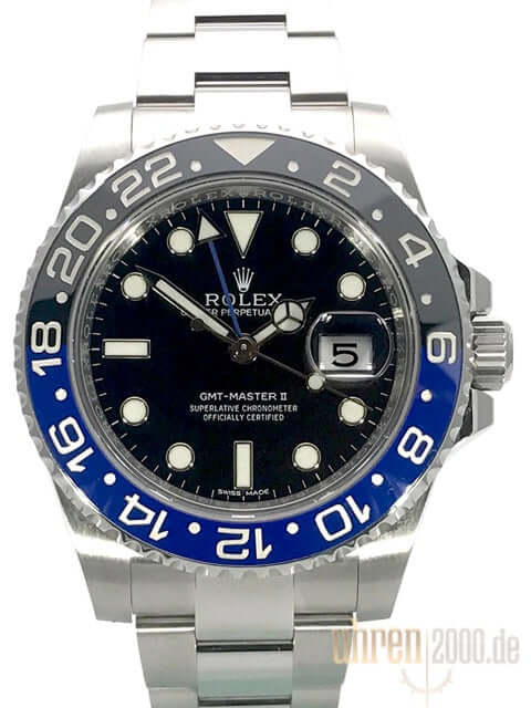 Case made of polished and satined stainless steel, case diameter 40 mm, case height 12 mm, fluted stainless steel bezel with blue/black ceramic inlay, 24 hour scale, rotatable on both sides, Oyster stainless steel bracelet polished and satined with safety folding clasp, black dial with applied luminous indices and luminous dots , luminous hands, automatic movement, chronometer, Rolex manufacture caliber 3186 with 31 jewels, oscillation 28,800 A/h, date display, GMT / second time zone, sapphire crystal, screwed crown with side protection, screwed stainless steel back, water resistant up to 10 bar.