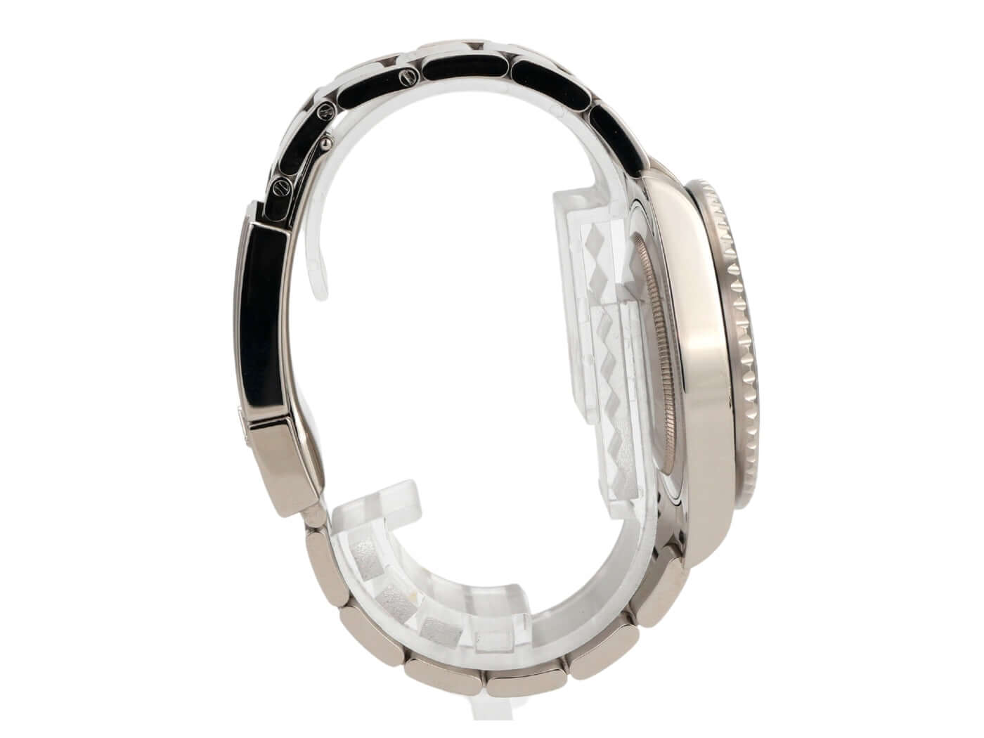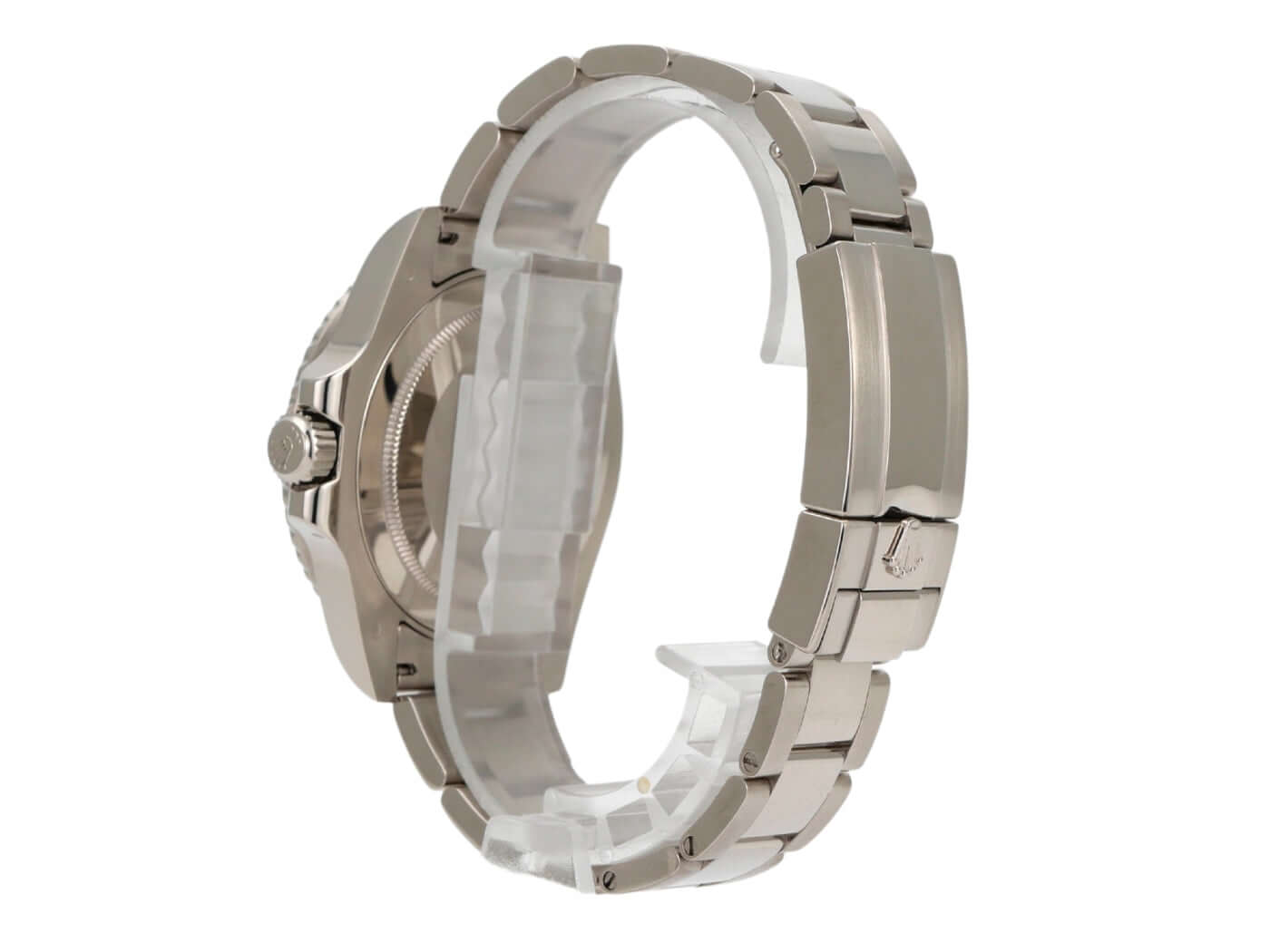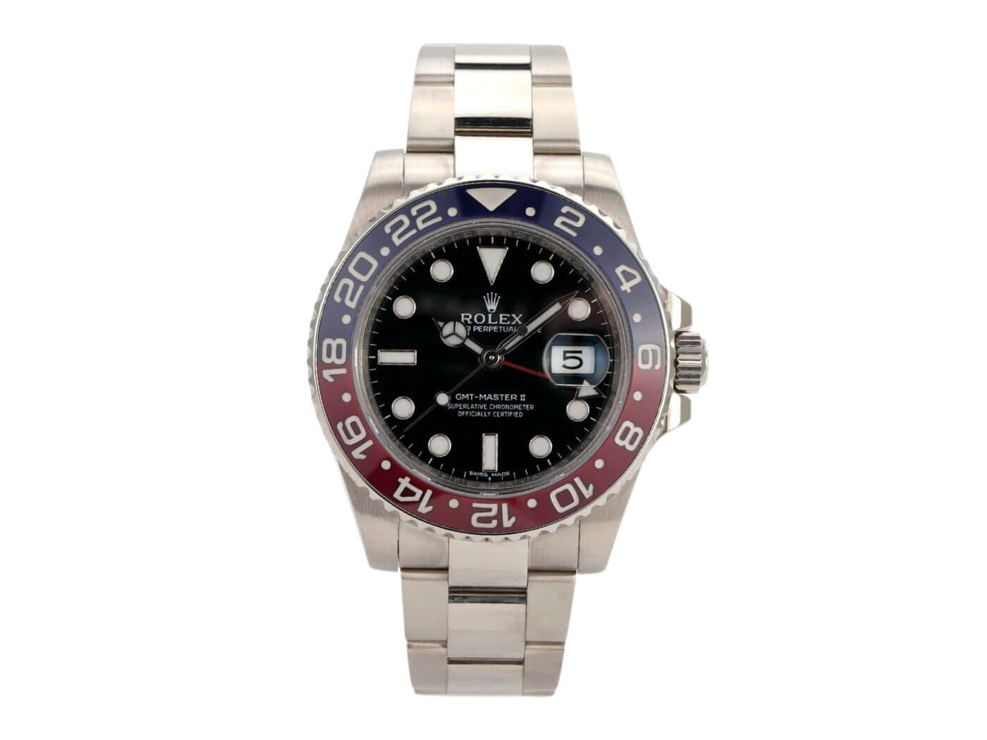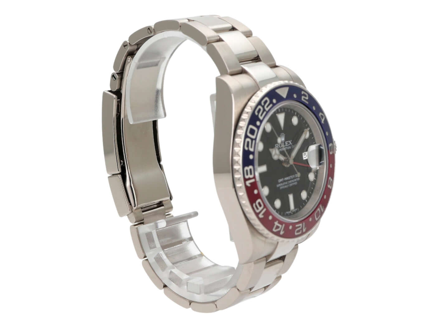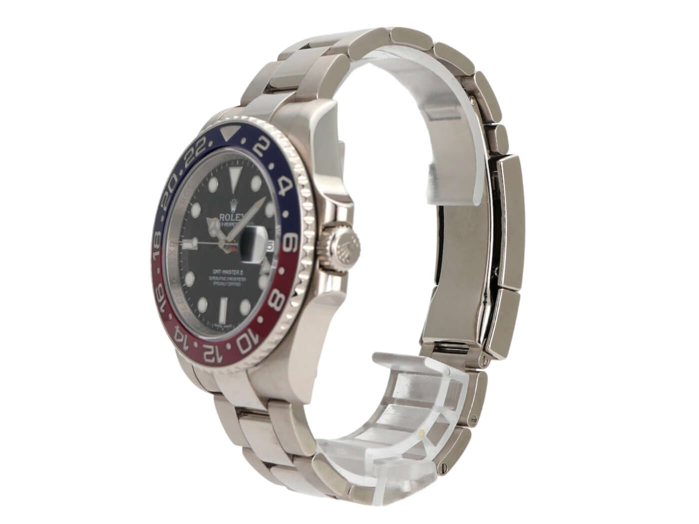 Case 18 kt white gold polished and satin-finished, case diameter 40 mm, case height 12 mm, bezel 18 kt white gold fluted with blue/red ceramic inlay and 24-hour scale, rotatable in both directions, Oyster 18 kt white gold bracelet polished and satin-finished with safety folding clasp, black dial with applied luminous indices and luminous dots, luminous hands, automatic movement, Rolex manufacture caliber 3186 with 31 jewels, frequency 28,800 A/h, date display, GMT / second time zone, chronometer, sapphire crystal, screw-down crown with shoulder protection, screwed 18 kt white gold case back, waterproof up to 10 bar.