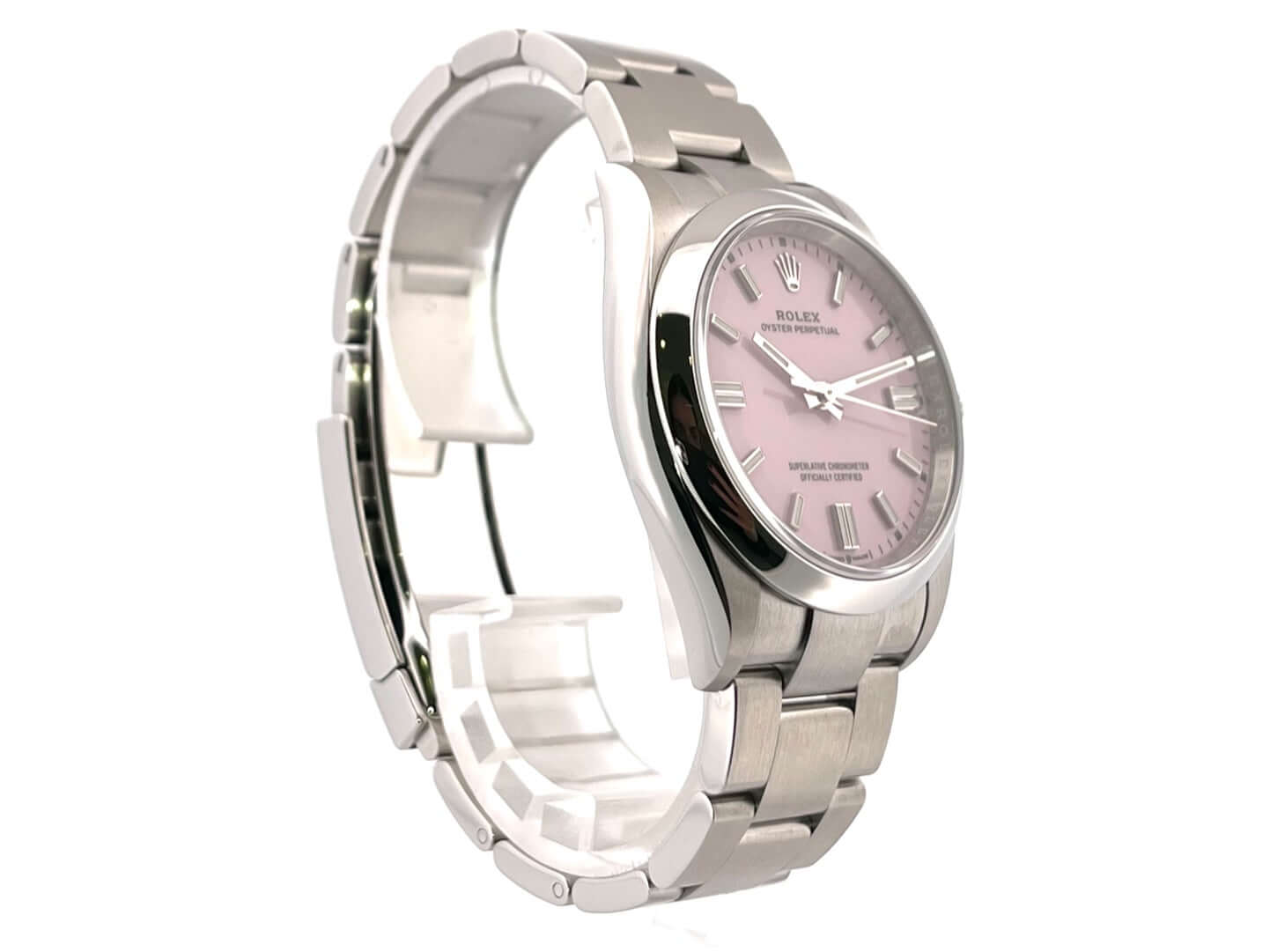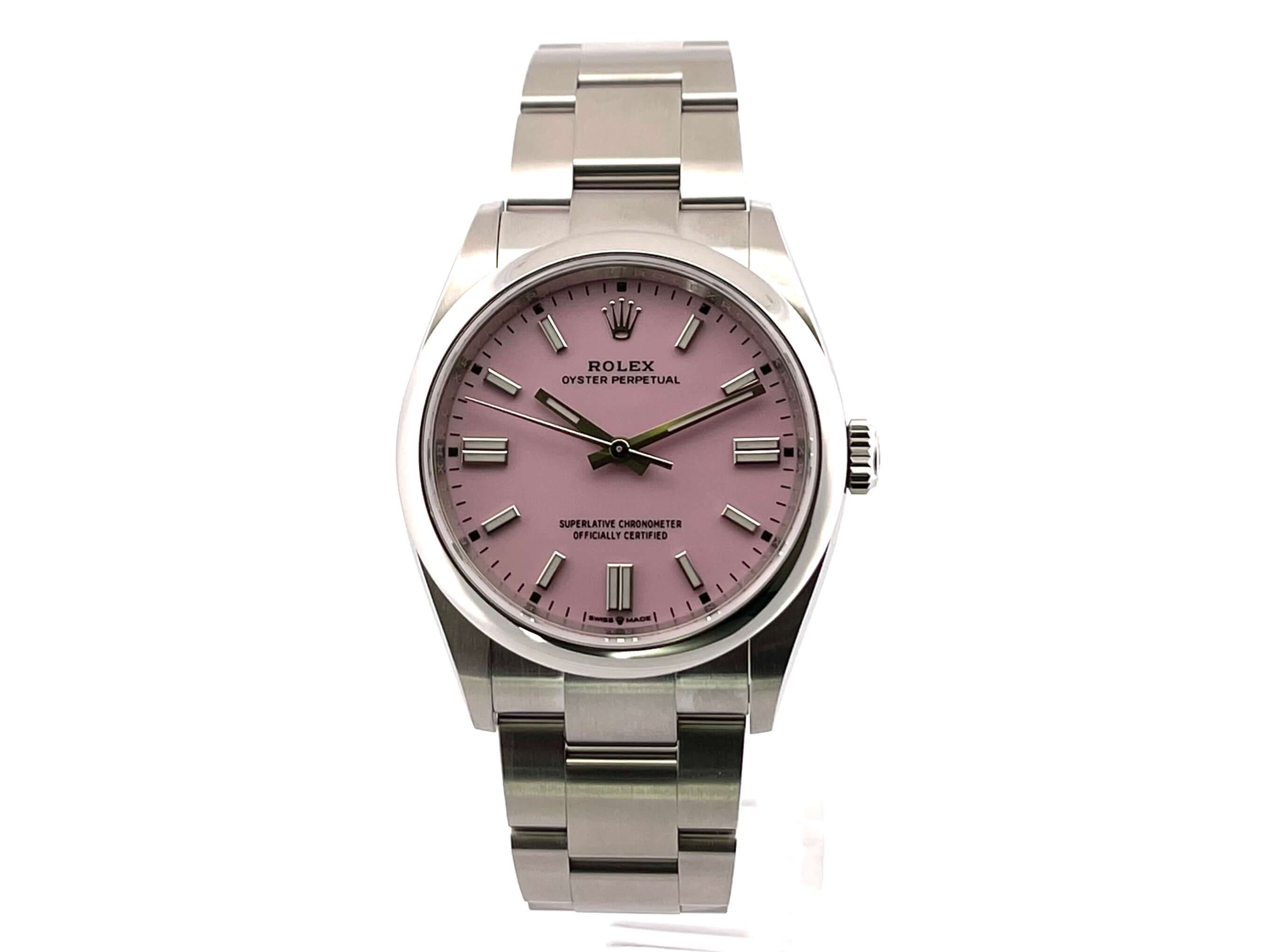 Polished and satin-finished stainless steel case, case diameter 36 mm, satin-finished Oyster stainless steel bracelet with folding clasp, pink dial with applied luminous indices, automatic movement, Rolex manufacture caliber 3230, 70-hour power reserve, chronometer, sapphire crystal, waterproof up to 10 bar.