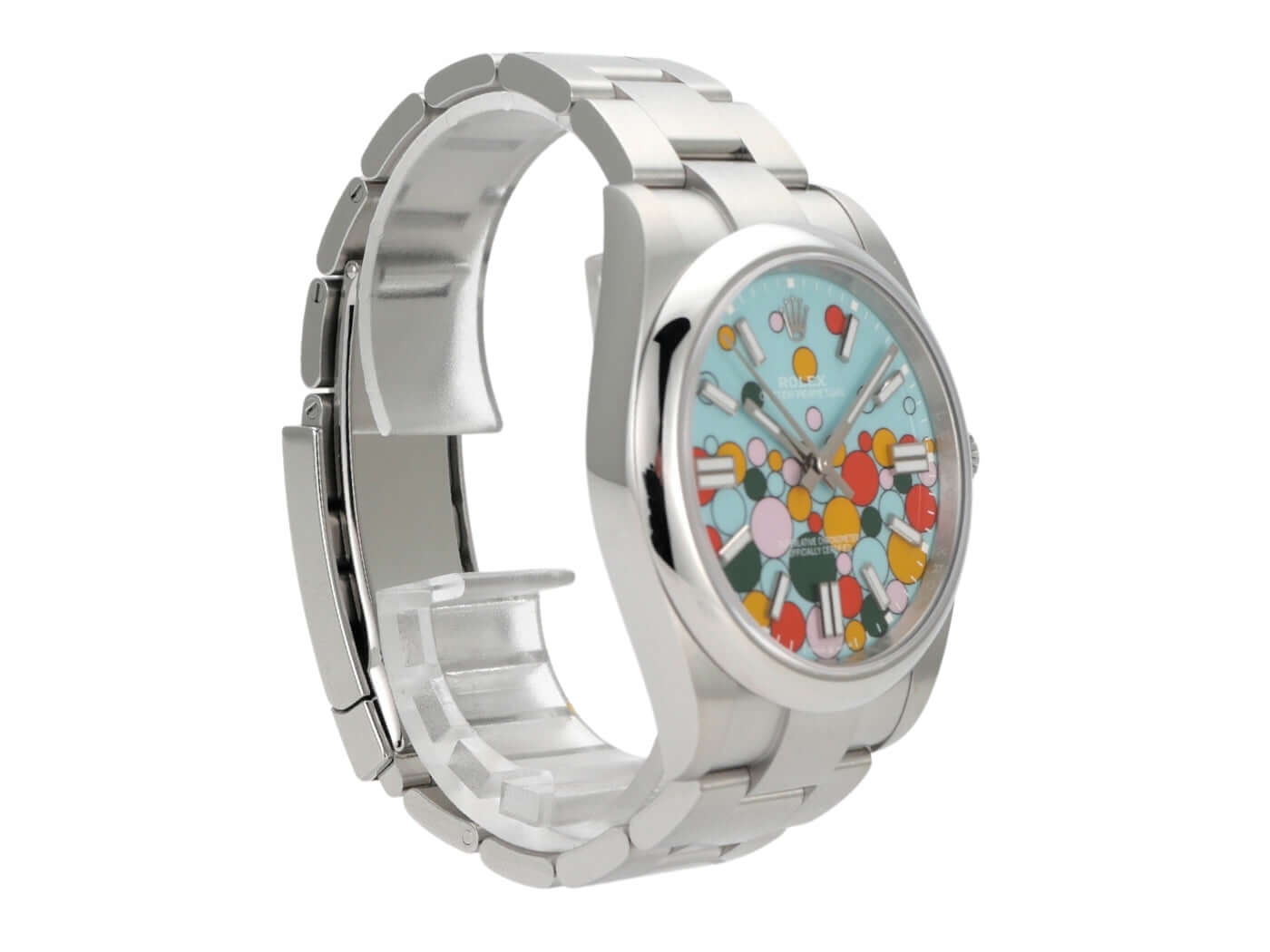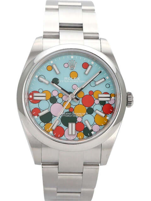 Case made of polished and satin-finished stainless steel, case diameter 41 mm, Oyster stainless steel bracelet with folding clasp, turquoise blue dial with Celebration motif and luminous indices, luminous hands, automatic, Rolex manufacture caliber 3230, power reserve 70 hours, sapphire crystal, water-resistant up to 10 bar.