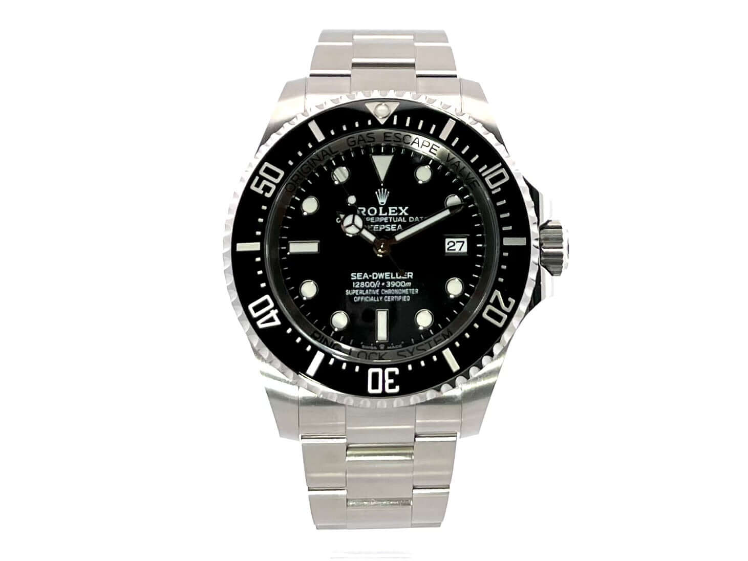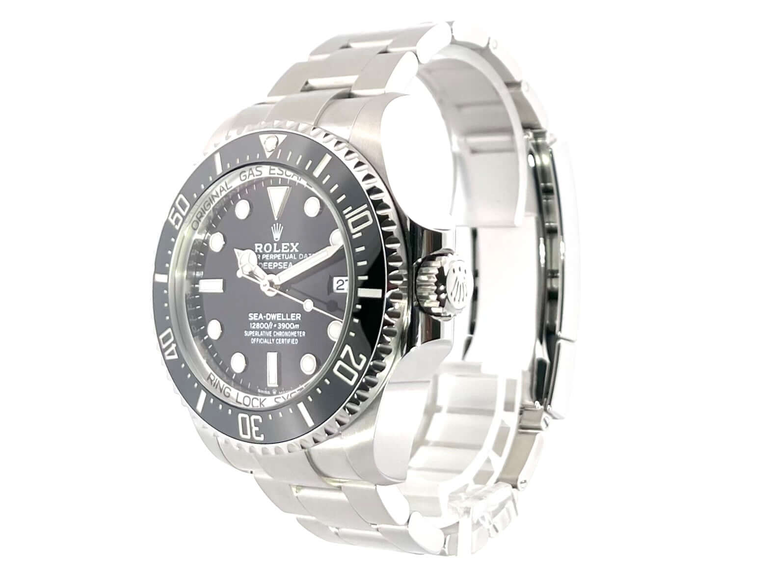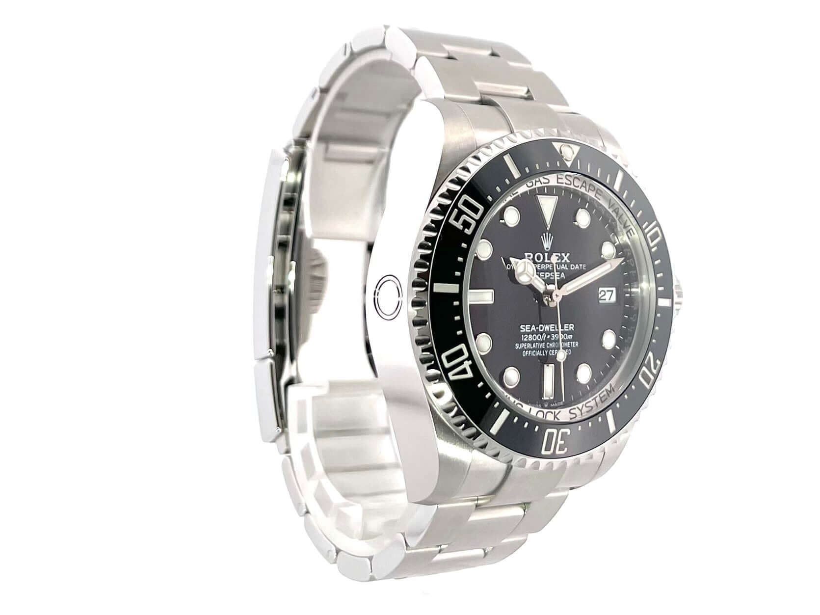 Case made of polished and satined stainless steel, case diameter 44 mm, case height 17.8 mm, fluted stainless steel bezel with black ceramic inlay, 60 minute scale and luminous dot rotatable on one side, helium valve at the 9 o'clock position, satinized Oyster stainless steel bracelet with safety folding clasp, black dial with applied Luminous indices and luminous dots as well as luminous hands, automatic, Rolex manufacture caliber 3235 with 31 jewels, vibration 28,800 A/h, power reserve 70 hours, date display, chronometer, scratch-resistant sapphire crystal, cambered, extra strong, screw-in Triplock crown with side protection, screwed and engraved titanium back, waterproof up to 390 bar.
