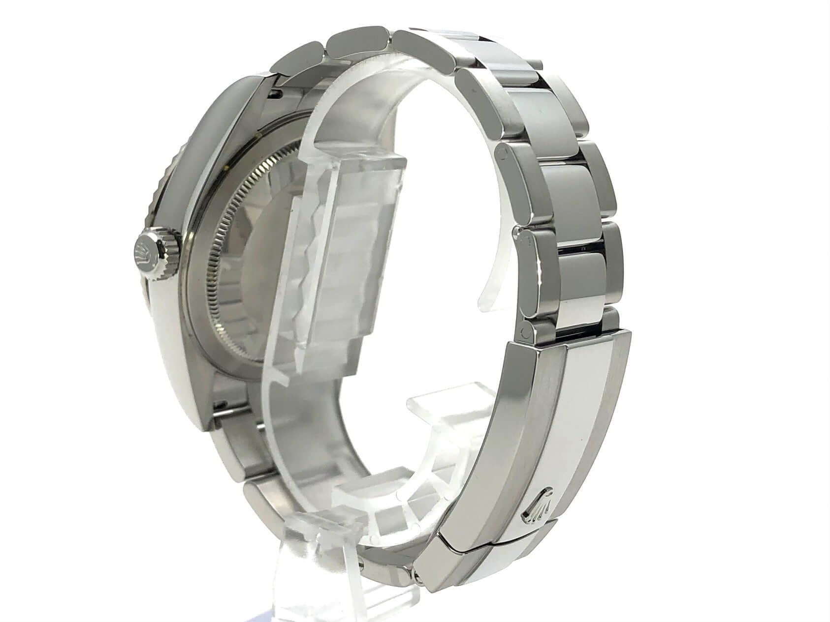 Case made of polished and satin-finished stainless steel, case diameter 42 mm, case height 14 mm, two-way rotating ring command bezel made of 18 kt white gold, Oyster bracelet made of polished and satin-finished stainless steel with Oysterclasp folding clasp, blue dial with applied luminous indices, luminous hands, Automatic movement, Rolex manufacture caliber 9001 with 40 jewels, vibration 28,800 A/h, power reserve for approx. 72 hours, chronometer, SAROS annual calendar, display of the month in the viewing window, scratch-resistant sapphire crystal, screw-down crown, screw-down stainless steel base, water-resistant up to 10 bar.