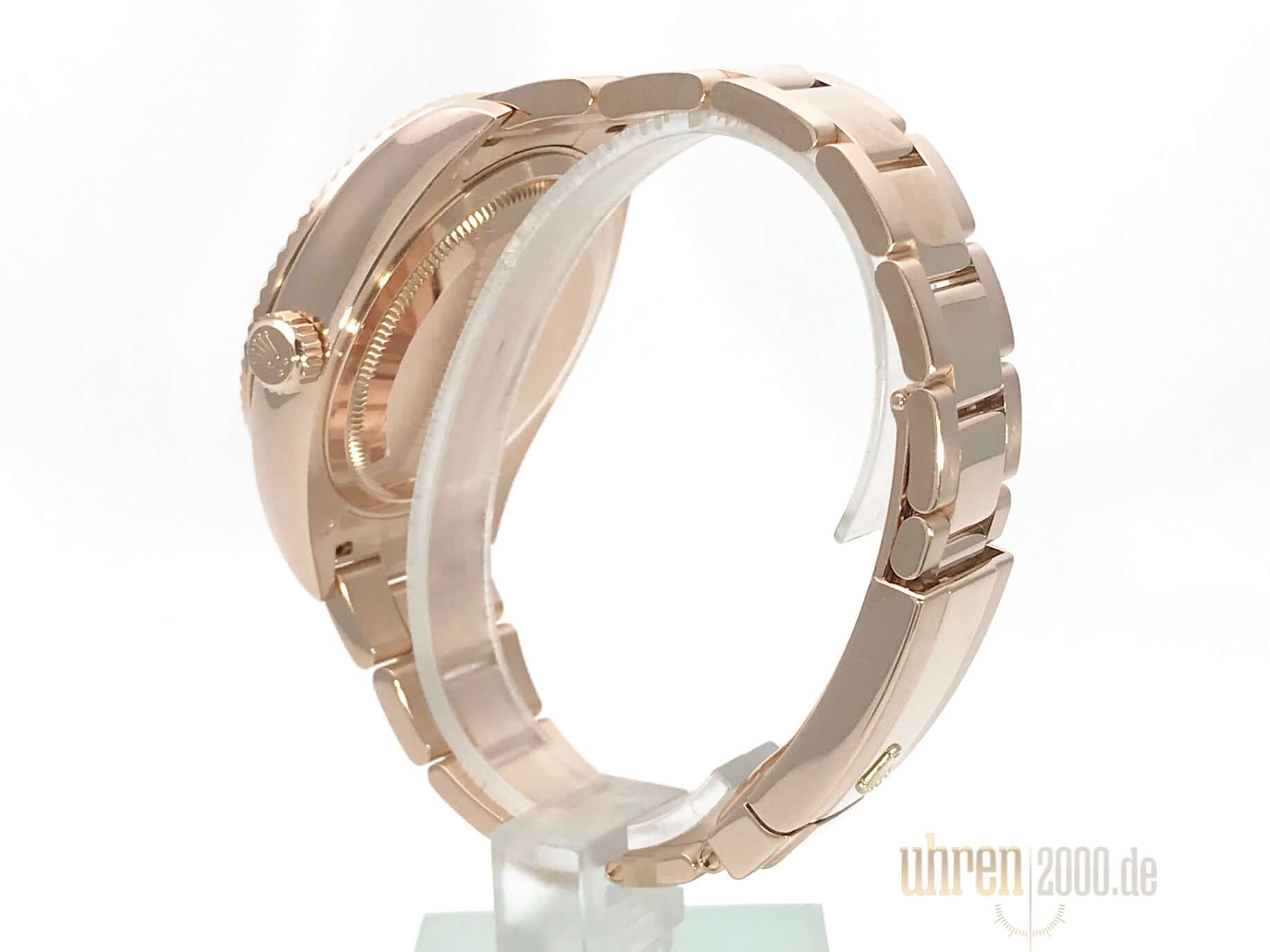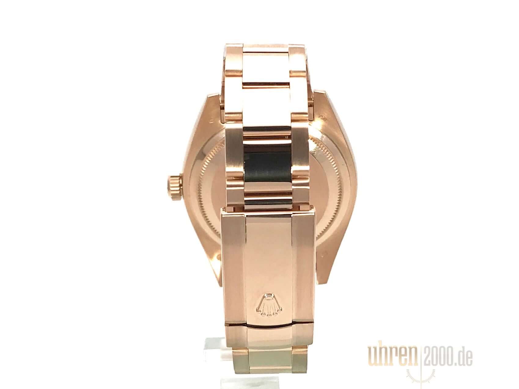 Case made of 18 kt Everose gold polished and satined, case diameter 42 mm, case height 14 mm, bezel 18 kt Everose gold fluted, 18 kt Everose gold bracelet polished and satined with Oysterclasp folding clasp, rose dial with applied Roman numerals, automatic movement, Chronometer, Rolex manufacture caliber 9001 with 40 jewels, vibration 28,800 A/h, power reserve for approx. 72 hours, SAROS annual calendar, month display in viewing window, ring command bezel rotating in two directions, scratch-resistant sapphire crystal, screw-mounted 18 kt Everose gold Crown, screw-down base made of 18 kt Everose gold, water resistant up to 10 bar.