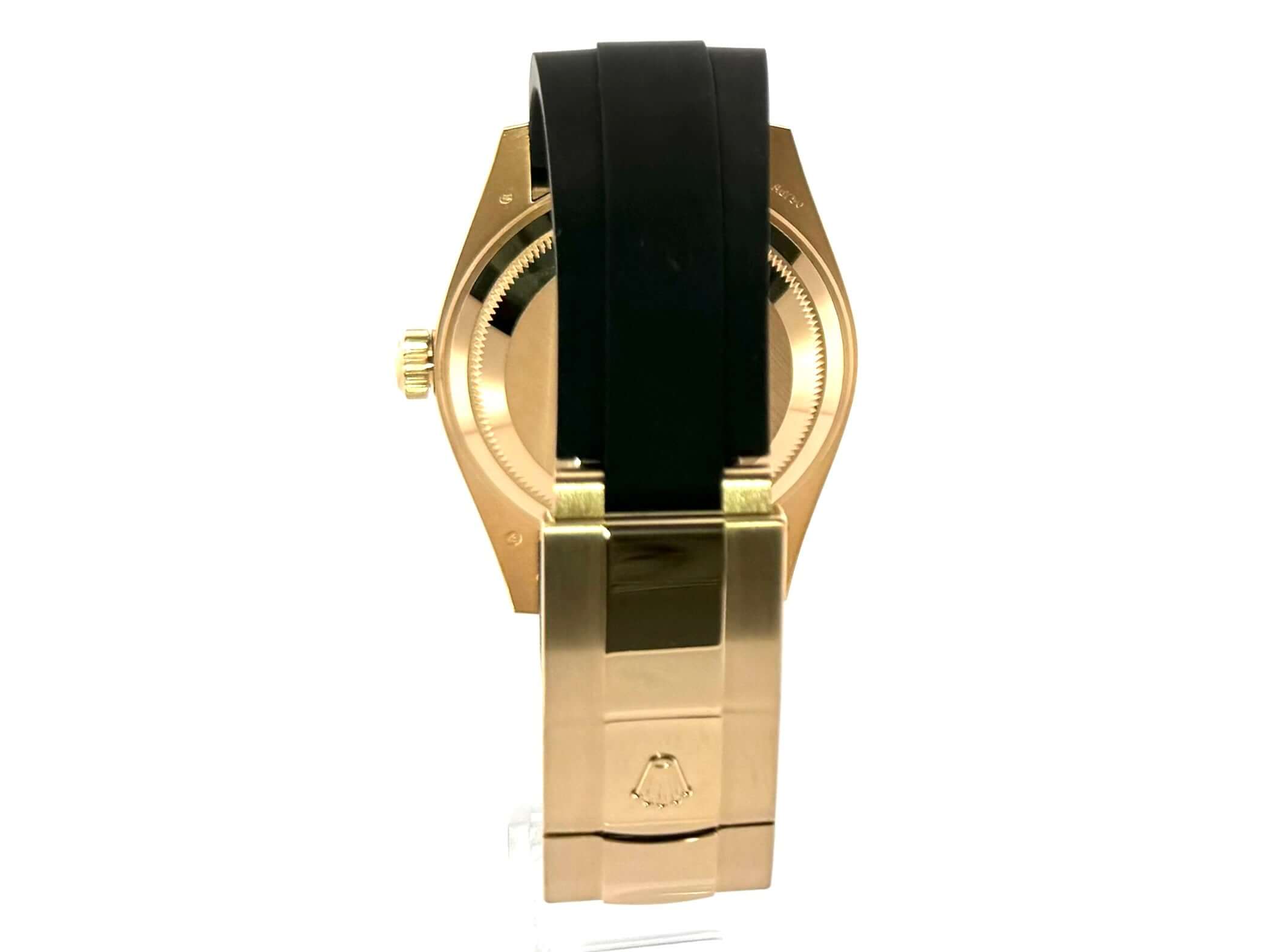 Case made of 18 kt yellow gold polished and satin-finished, case diameter 42 mm, case height 14 mm, 18 kt yellow gold fluted bezel, black Oysterflex strap with 18 kt yellow gold folding clasp, champagne-colored dial with applied luminous indices, automatic movement, Rolex manufacture caliber 9002 with 40 jewels, vibration 28,800 A/ h, power reserve for approx. 72 hours, chronometer, SAROS annual calendar, display of the month in viewing window, ring command bezel rotating in two directions, scratch-resistant sapphire crystal, screw-down crown made of 18 kt yellow gold, screw-down back made of 18 kt yellow gold, waterproof up to 10 bar.